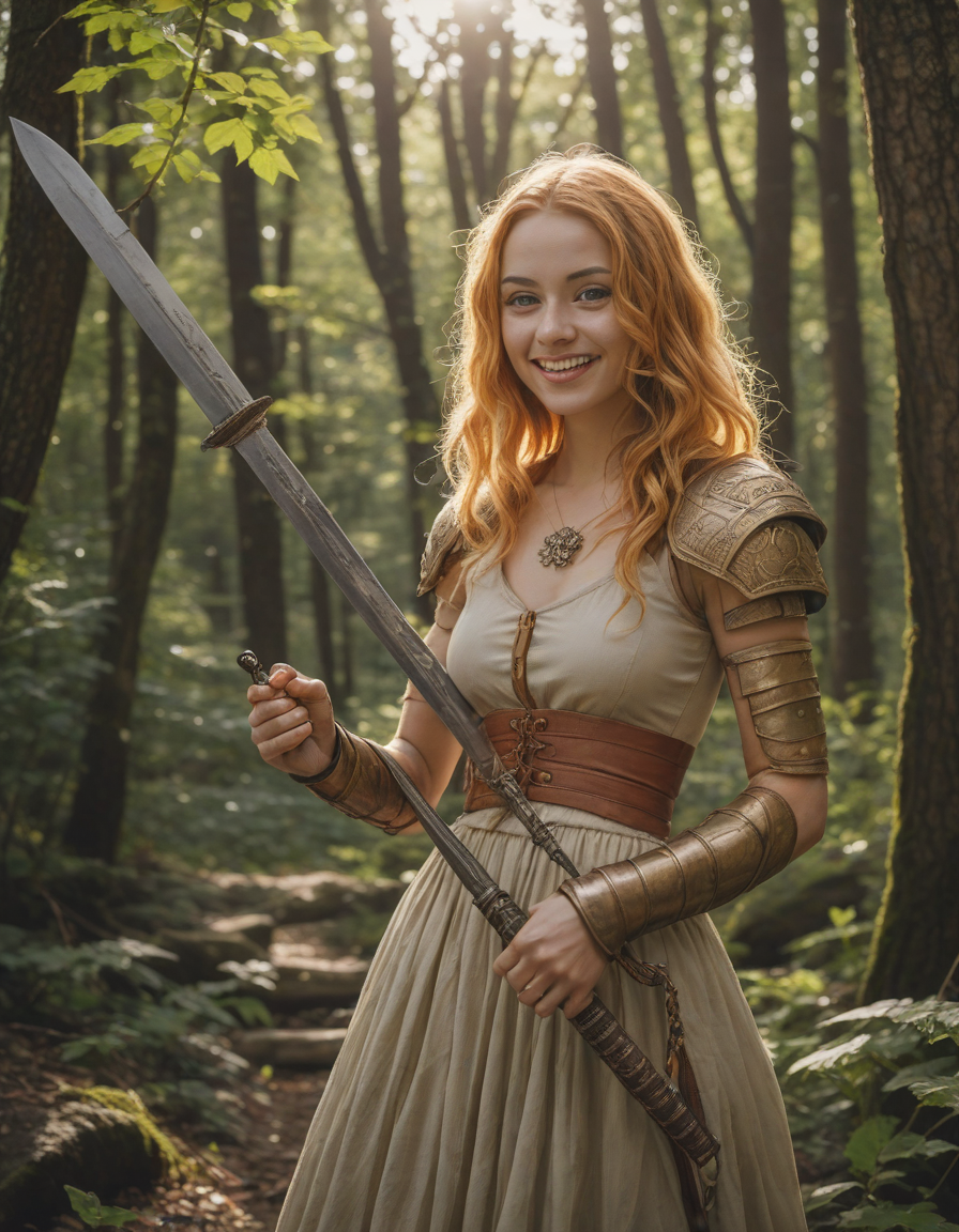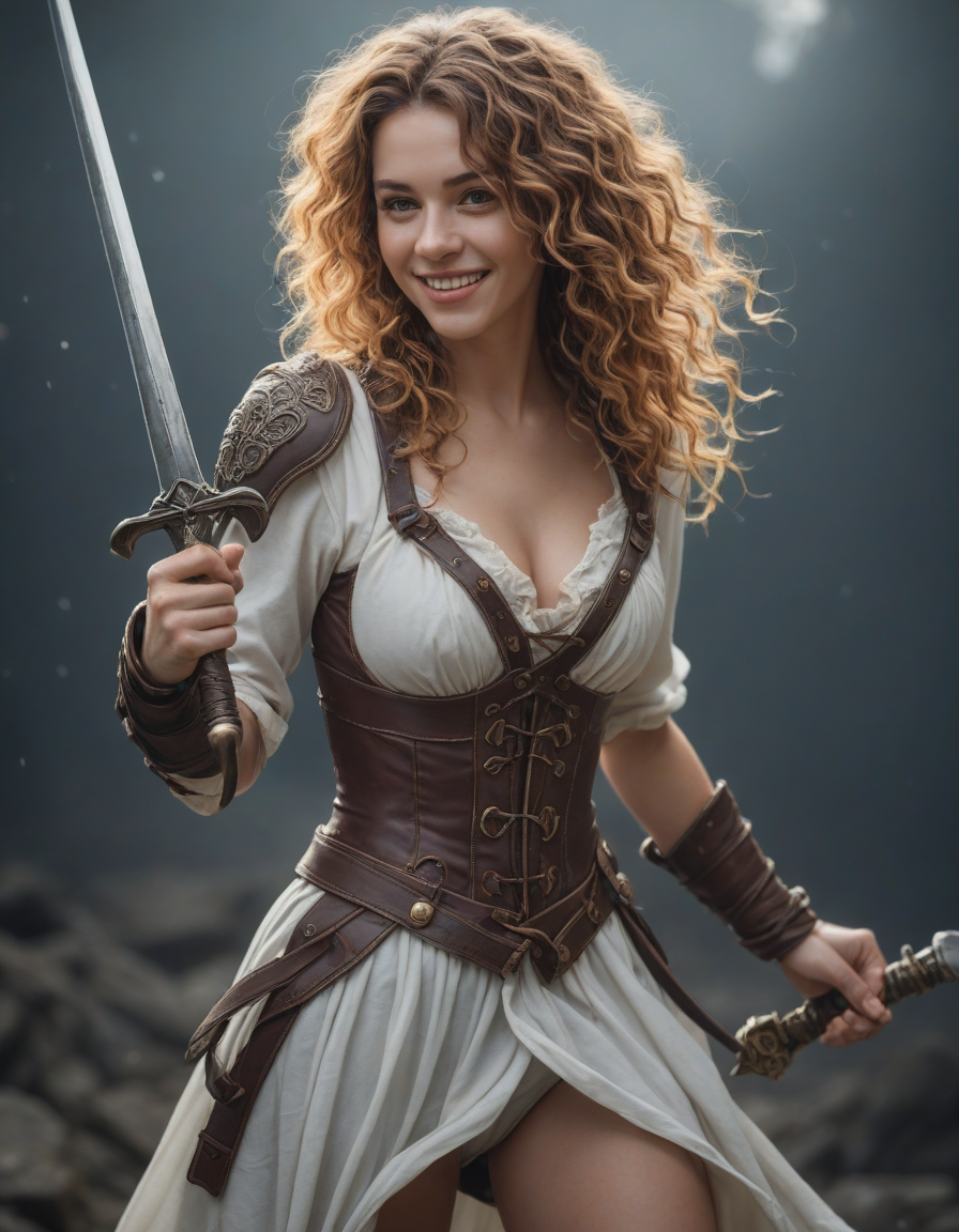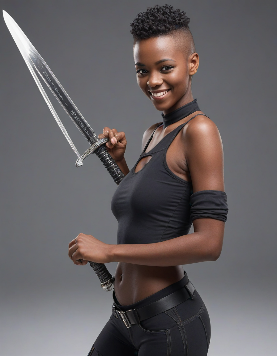 model, holding a sword, cheesy smile, motion