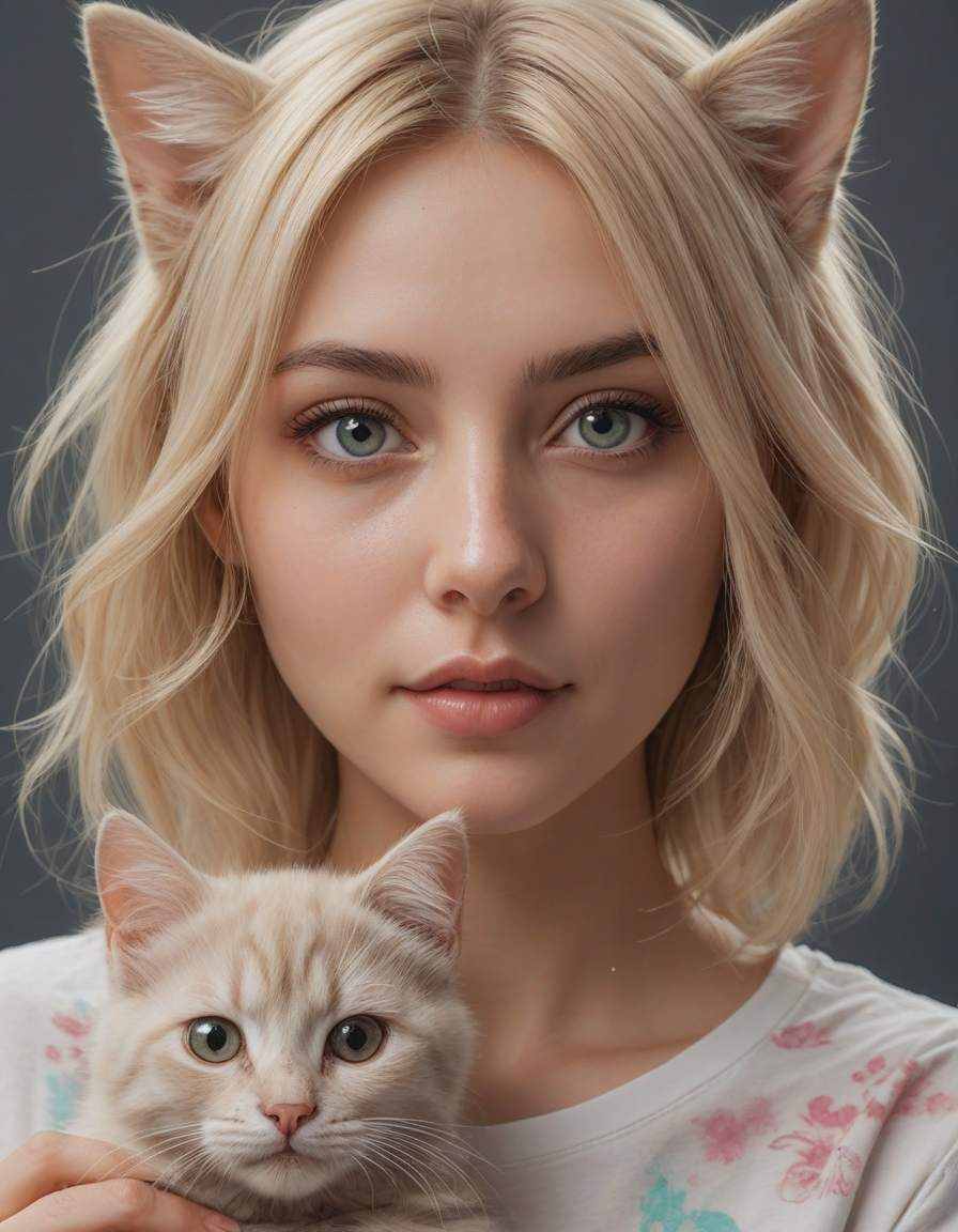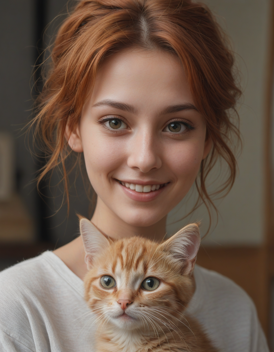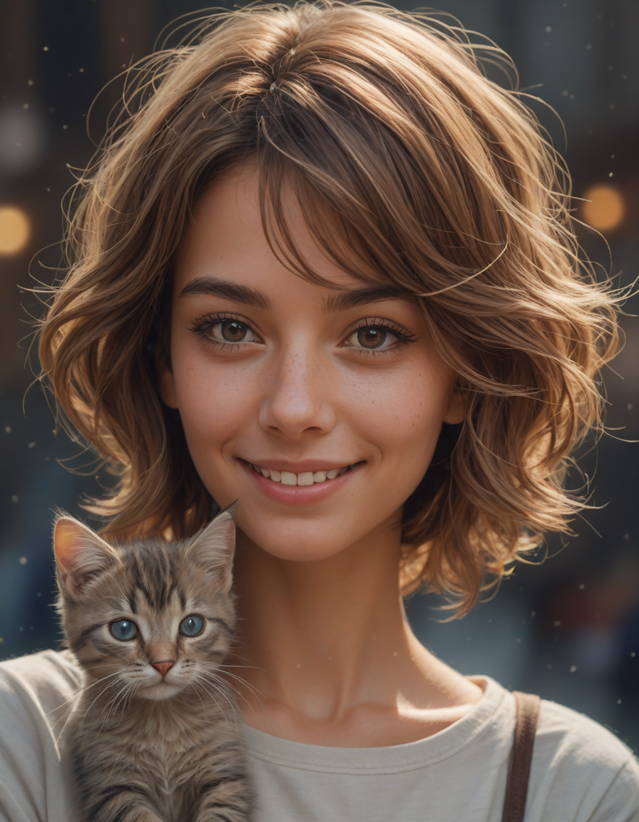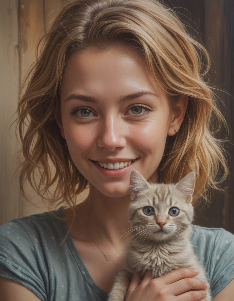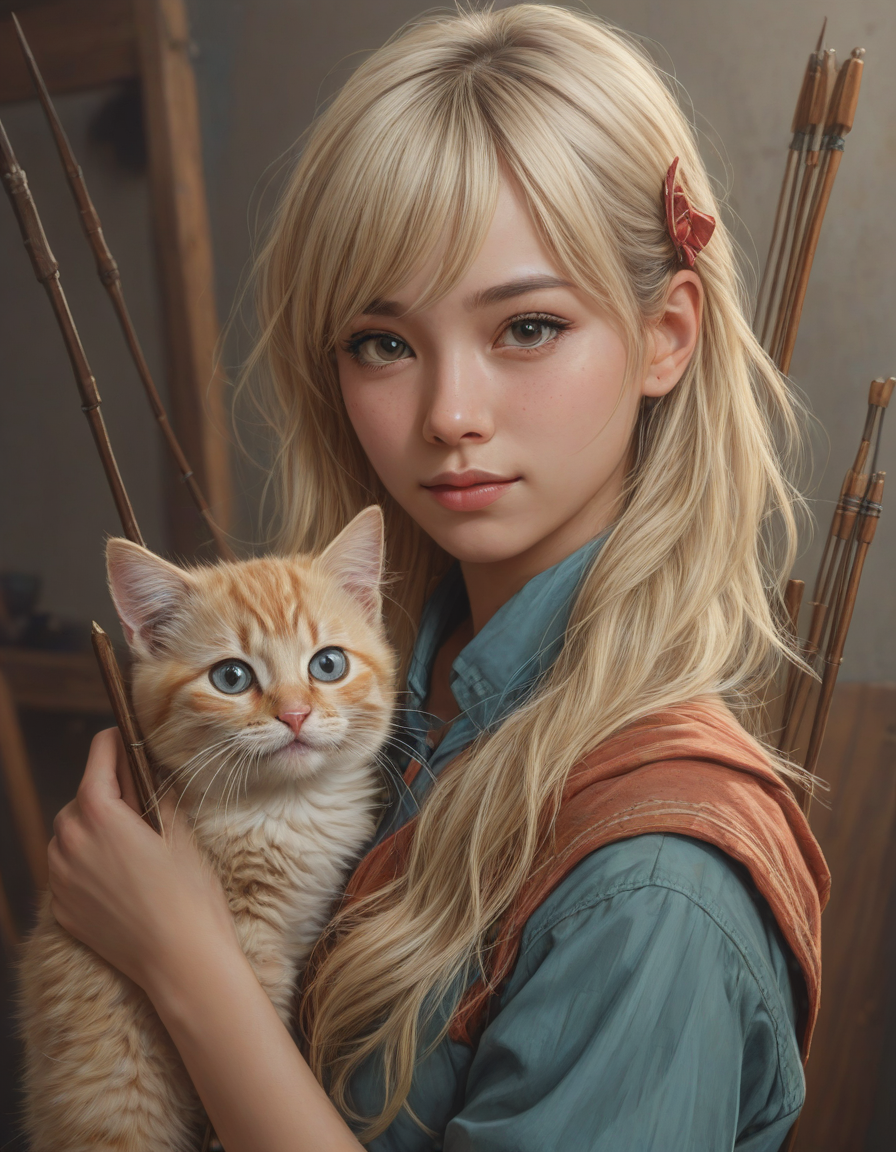 facing left, piercing gaze, love, Dreamy gaze, shimmering aura, Sarcastic half-smile, Cherishing a fluffy kitten, laugh, A painter meticulously blends hues on a wooden canvas