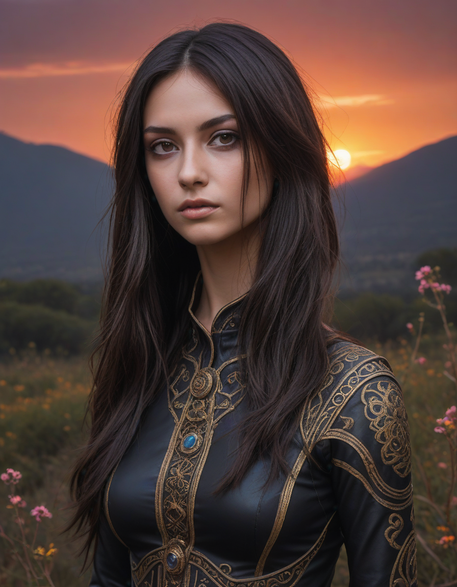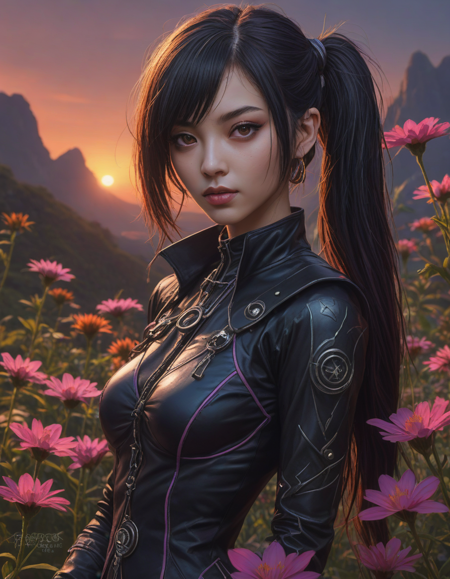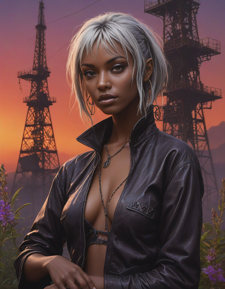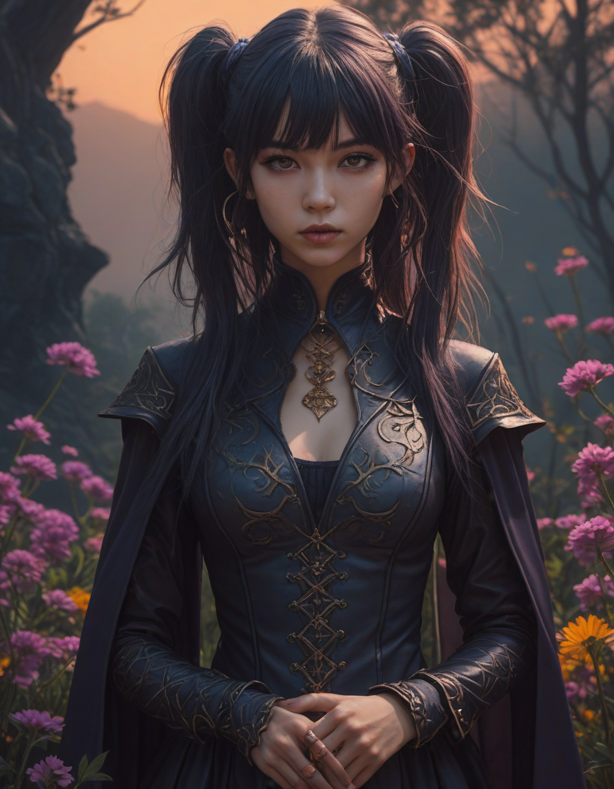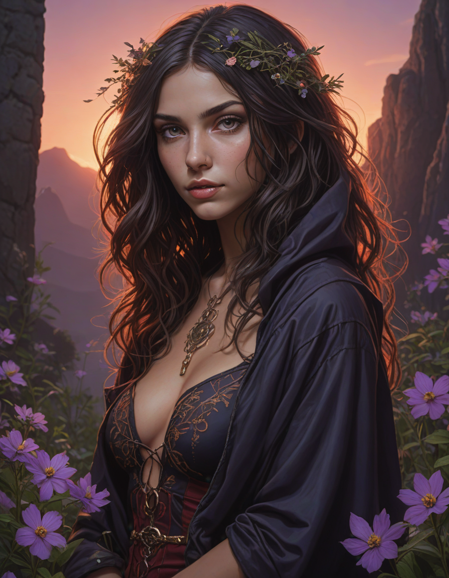 dark elf,drow, Eyes glint with mischief, torrid sunset, brunette, very attractive, fit, abounding with wildflowers, 80s punk clothing, An exquisite arrangement of colors that will make you feel, 11/10, Cloaked shadow, psychedelic trip