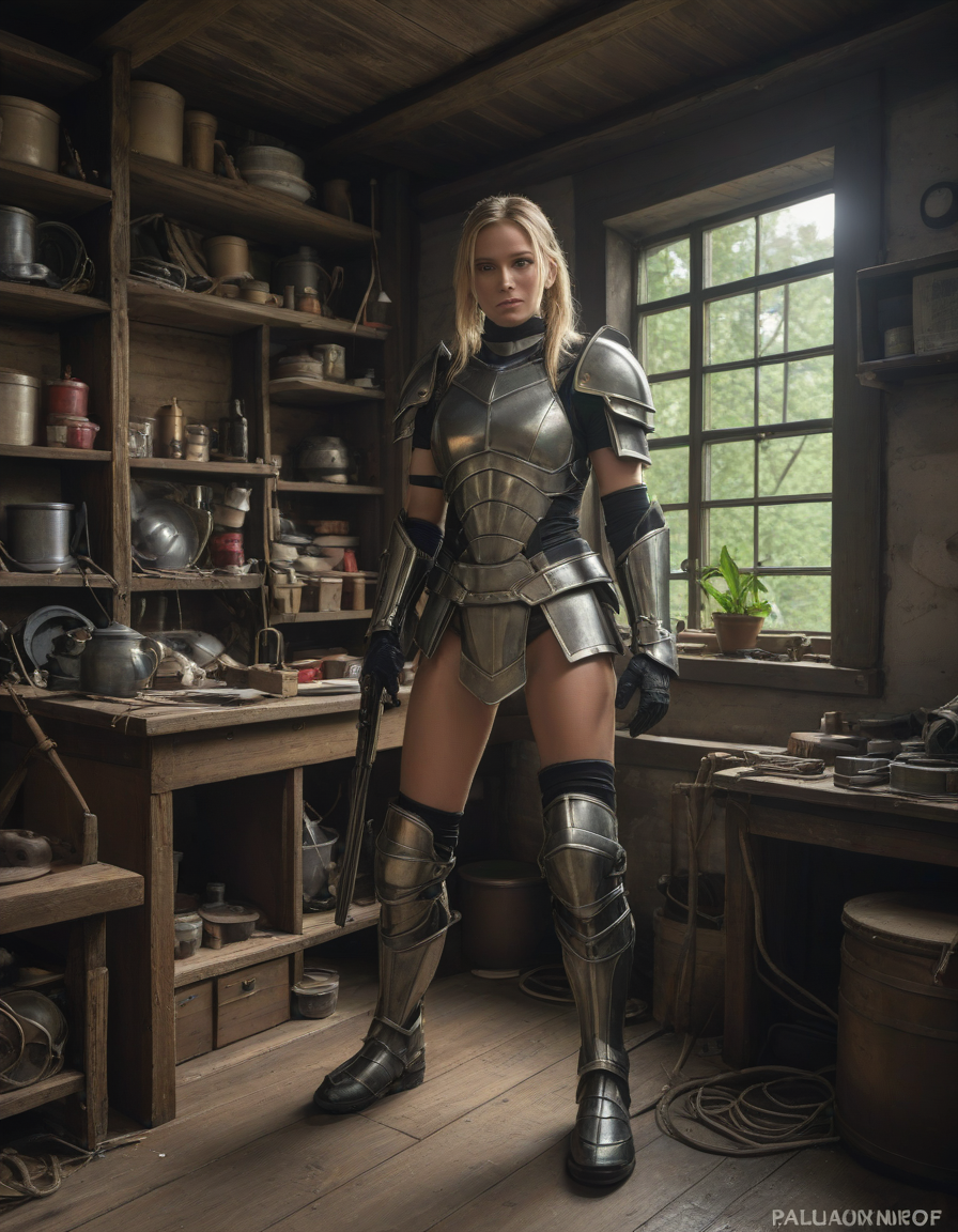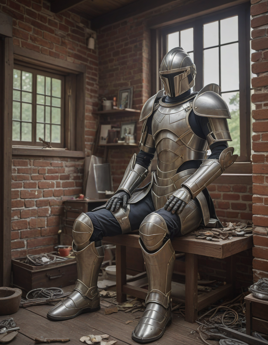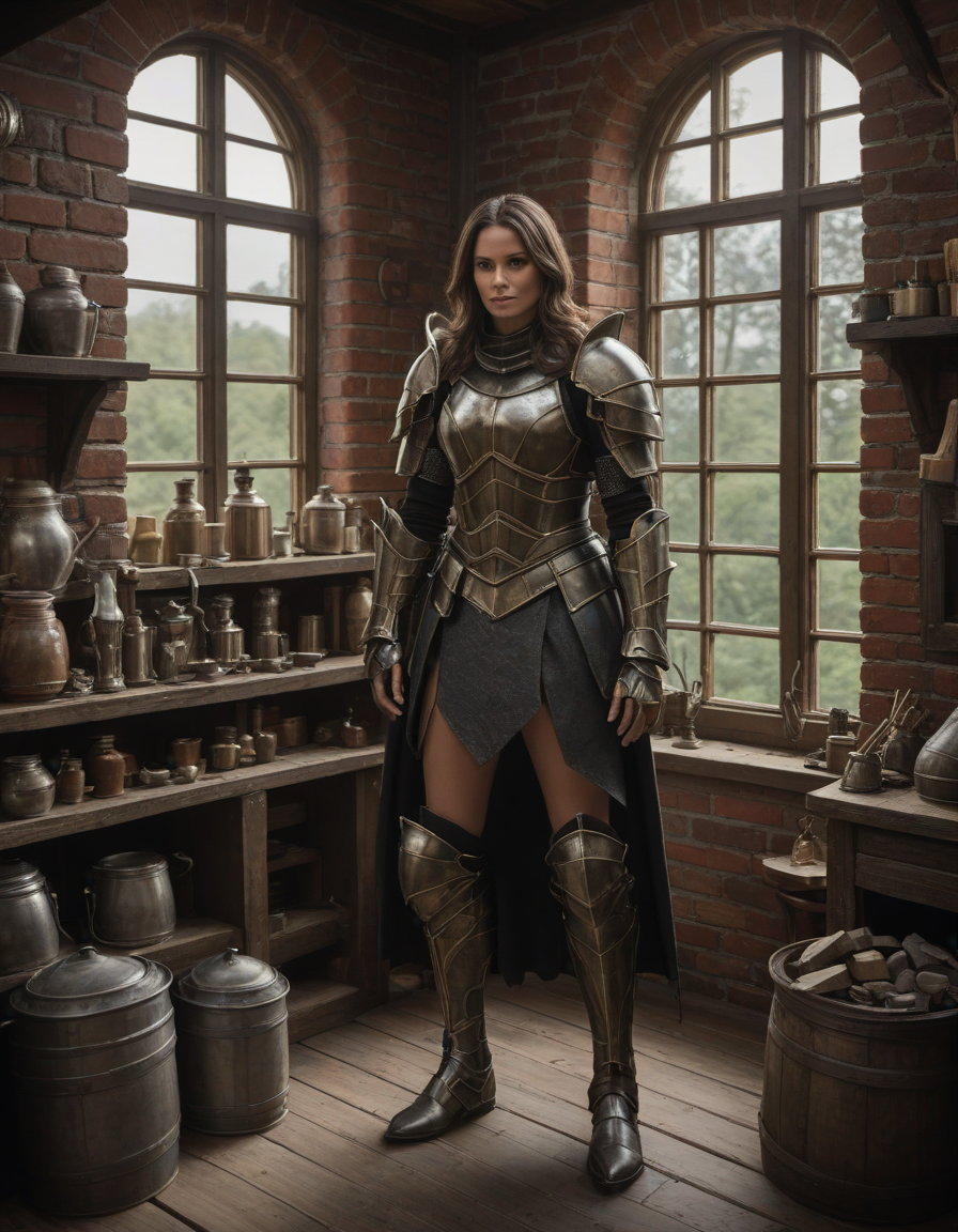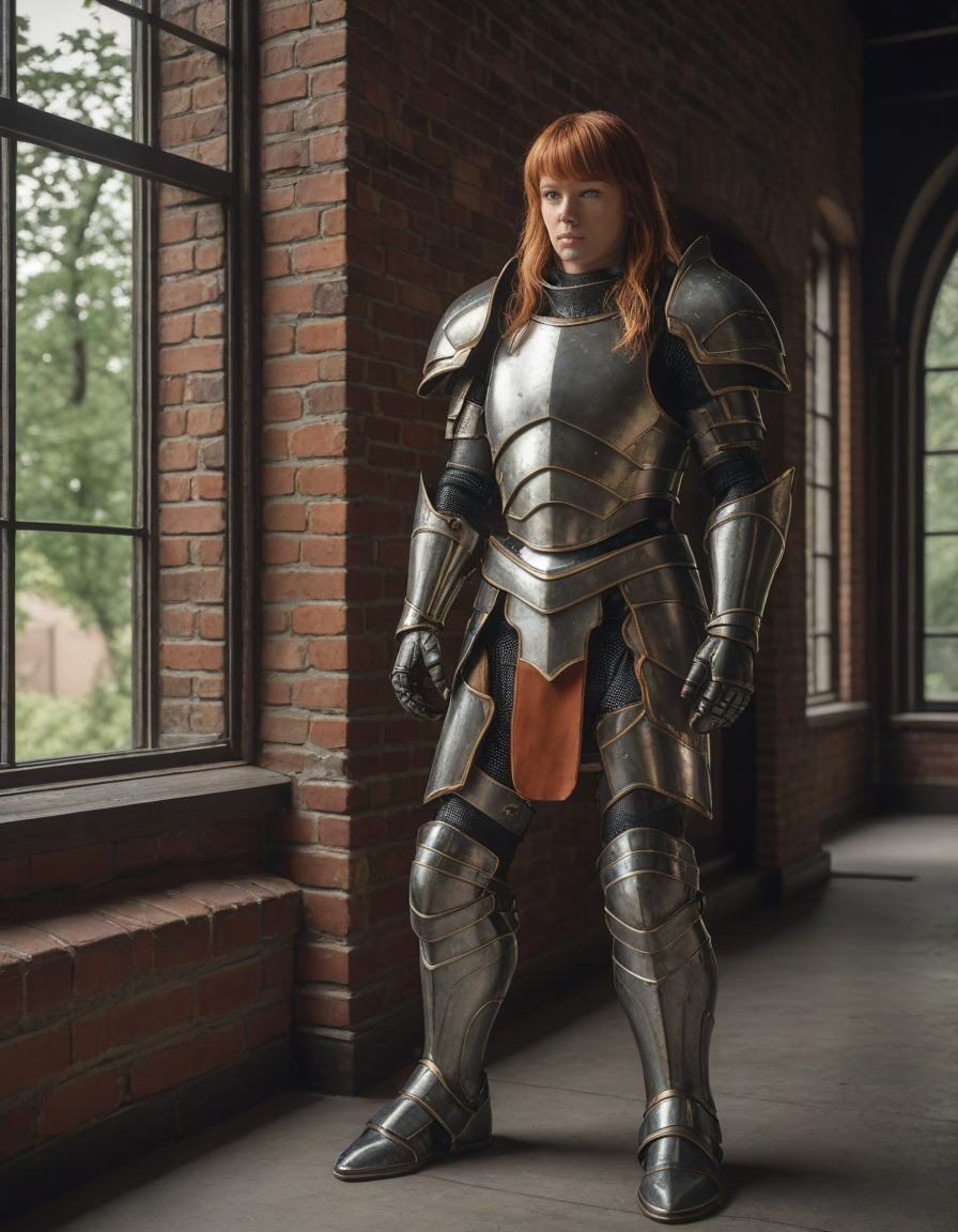 wearing complete set of armor, wearing full armor, Wearing chest armor, wearing leg armor, wearing feet armor, wearing bracer, wearing pauldrons,, brick wall -> great window view