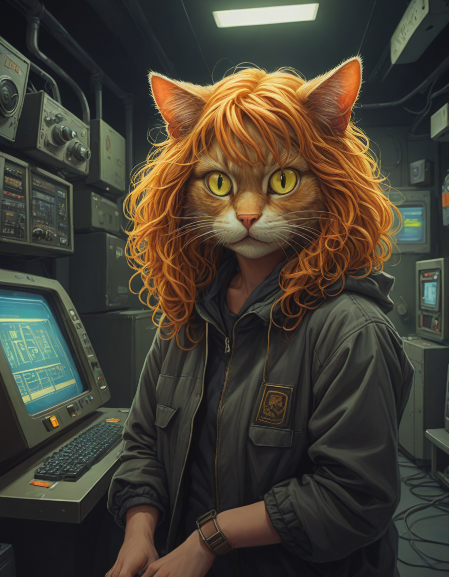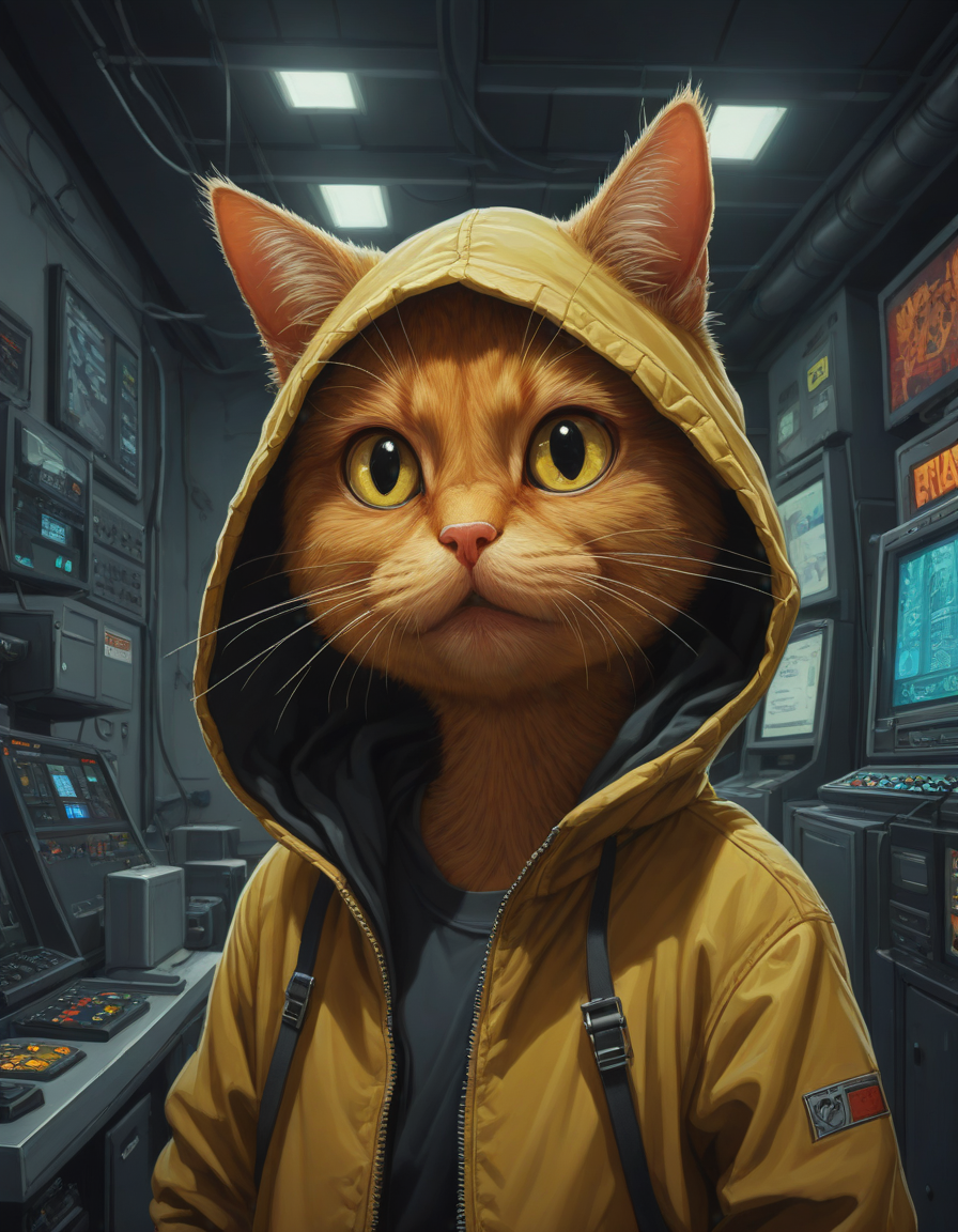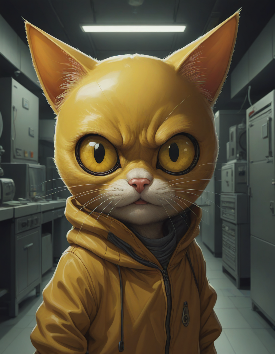 Eyes glinting with humor, in an underground lab, yellow cat-like eyes, A humorous cartoon character with an exaggerated expression, Cloaked shadow, jaw dropped, Shadows darting in corners