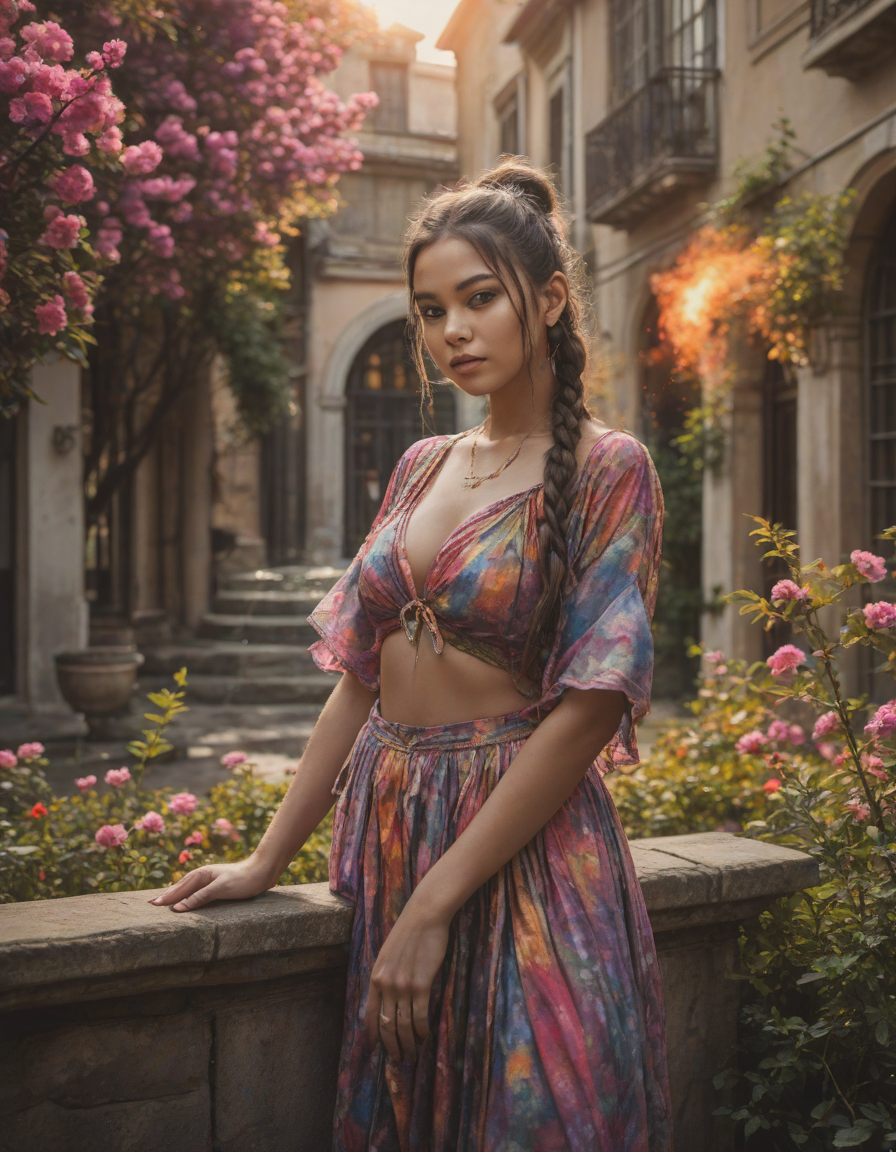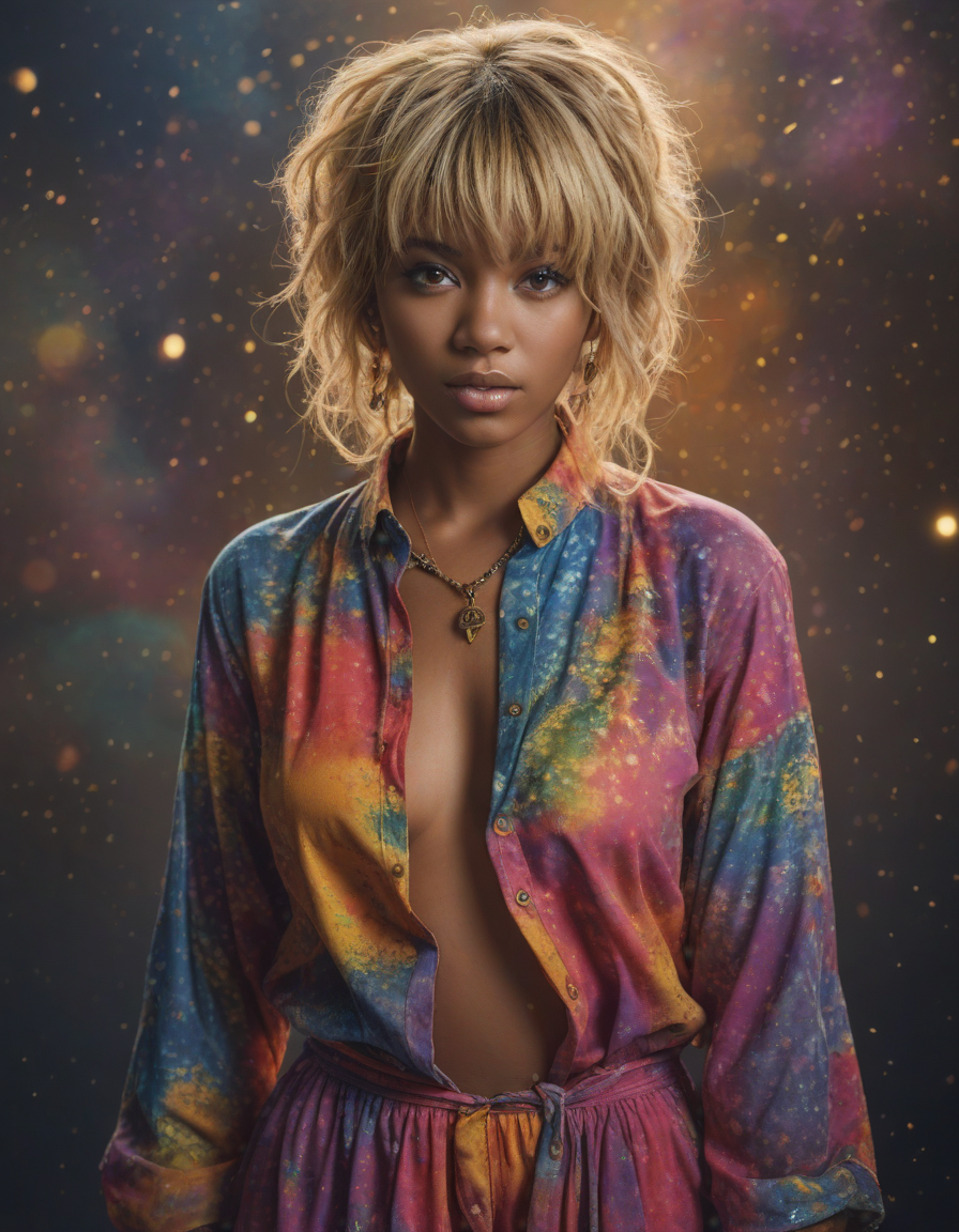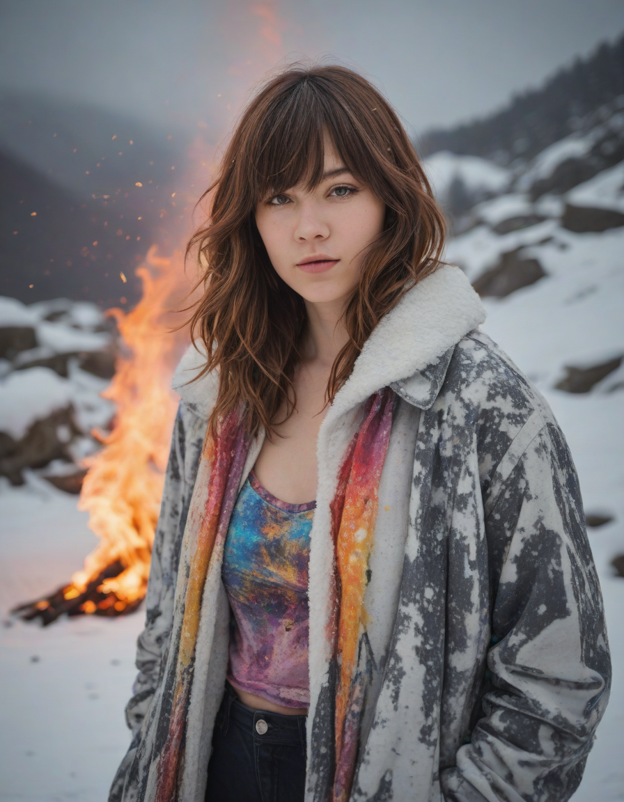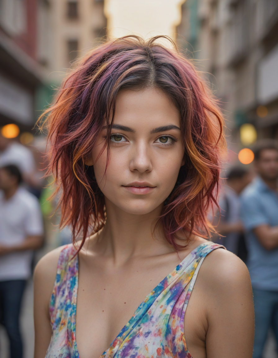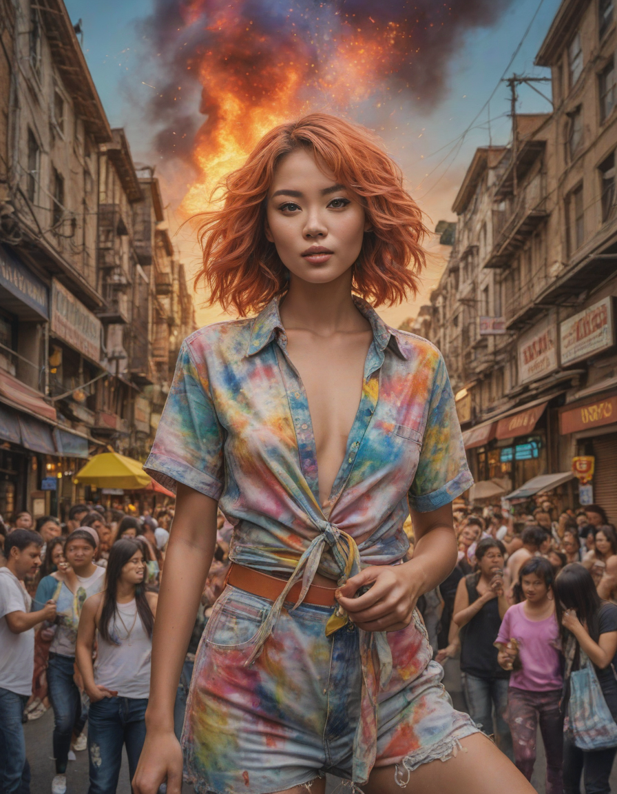 newspaper editorial photography, pop idol, torrid sunset, surrounded by people, Tattered clothing, Rainbow-colored splotches, Fiery sparks igniting a symphony of colors, glistening silk, cat
