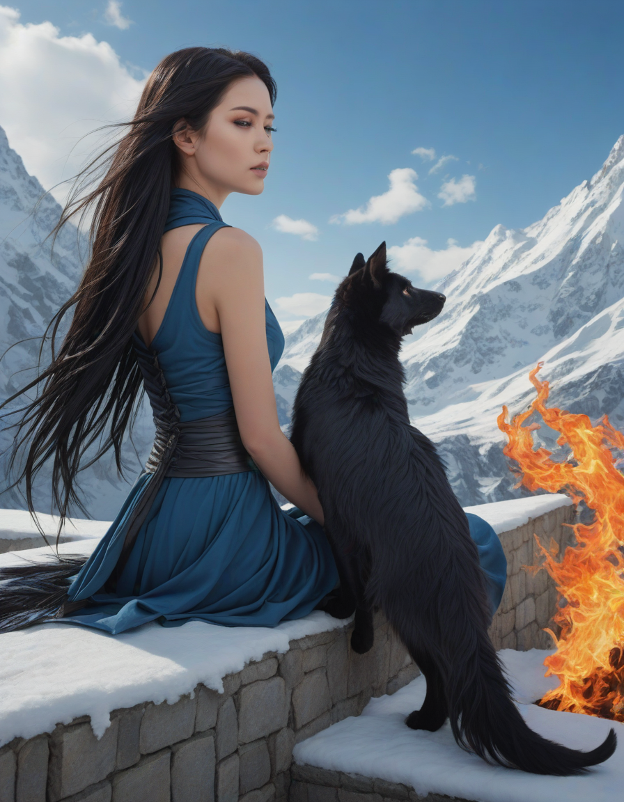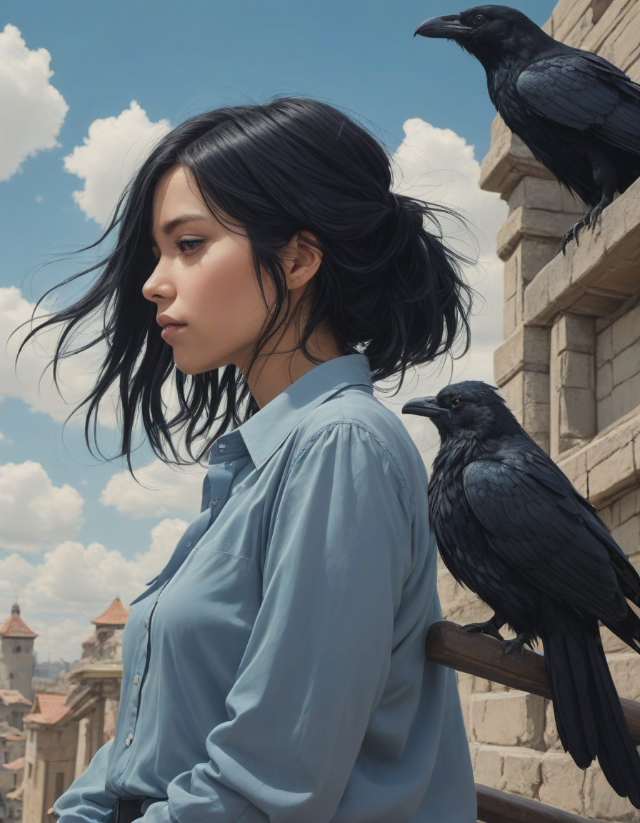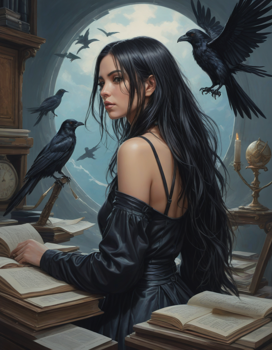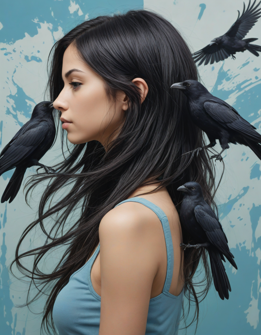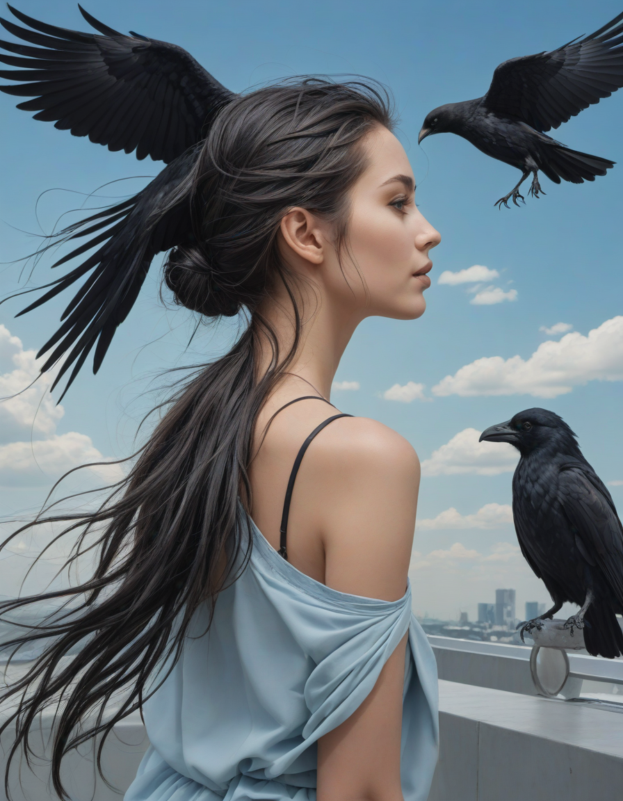 Abstract Workplace Cliche, Raven-black hair cascading down their back, cat, azure sky