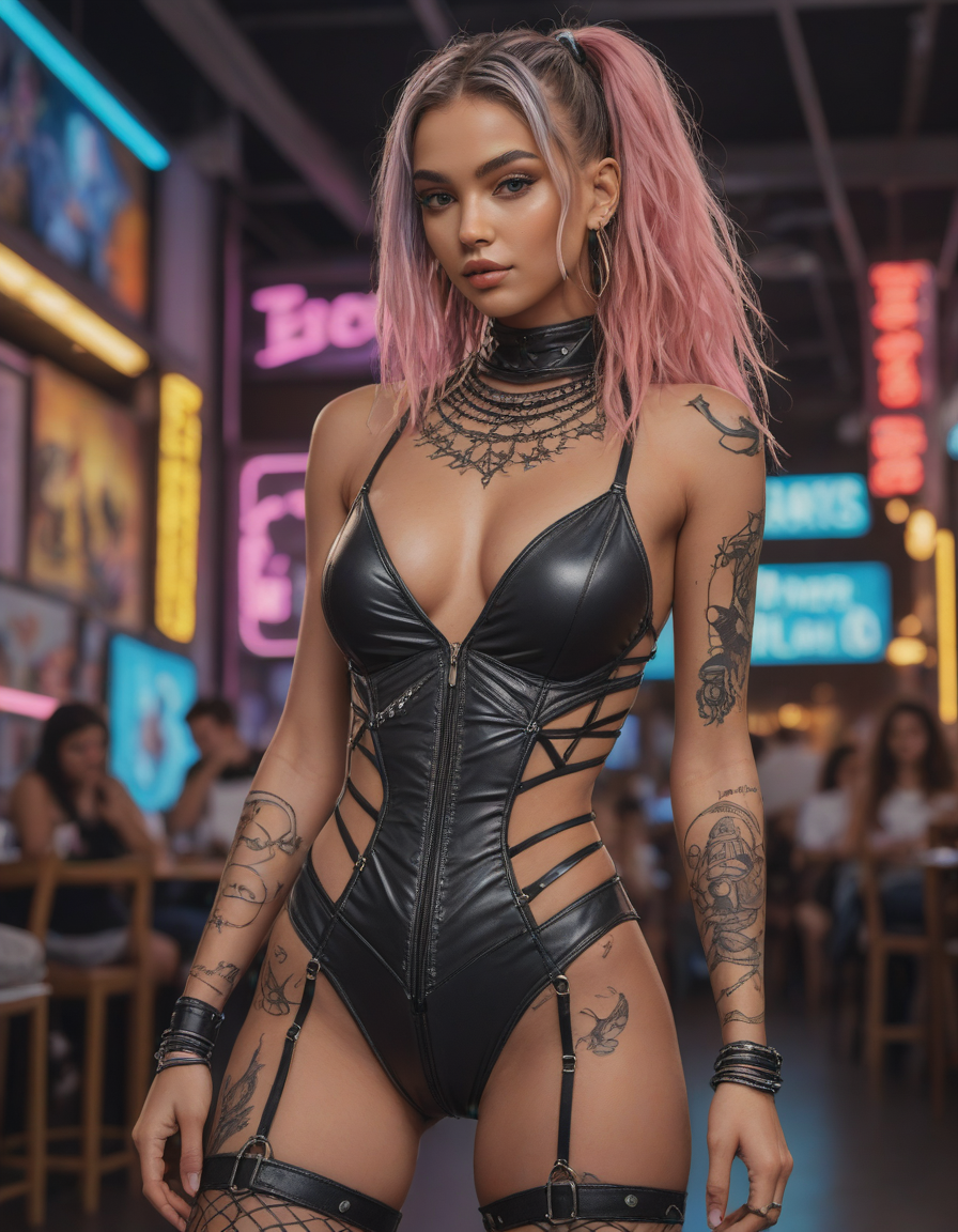 The background remains intentionally blurred, a mere suggestion of her personal space adorned with elements synonymous with the e-girl life—neon signs, band posters, and string lights—creating an ambiance that's both intimate and expressive. The lighting emphasizes the vivid colors of her makeup and the unique textures of her outfit, casting her in an ambiance that's dynamic and full of life.
