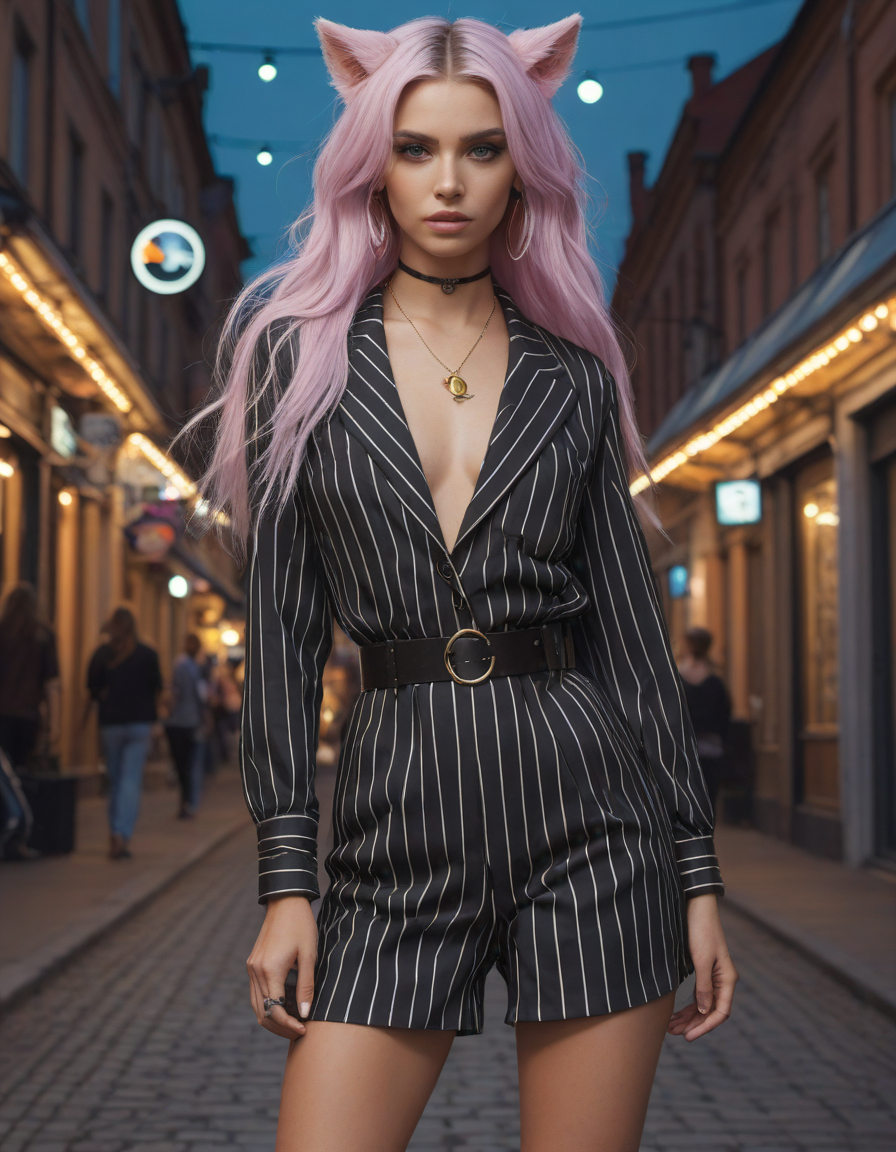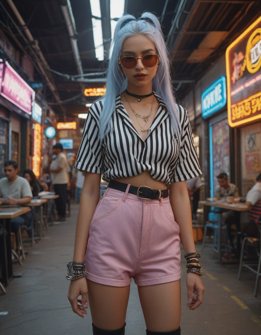 well-groomed, energetic person, Bliss, active, Visualize a photorealistic portrayal of an 18-year-old high school senior girl, epitomizing the e-girl aesthetic with a blend of internet culture's vibrancy and personal audacity. Clad in an oversized striped shirt under a black graphic t-shirt dress, her style is a testament to e-girl fashion's layered intricacy, complemented by fishnet tights and chunky boots. Her makeup features dramatic winged eyeliner, neon eyeshadow, and dark lipstick, with blush bringing her face to life. Accessories like silver chains and a heart pendant choker, along with pastel or neon hair streaks, enhance her playful rebellion. Standing hands-on-hips, she exudes confidence and individuality against a backdrop suggestive of e-girl life, with neon signs and string lights. This scene captures her bold identity and expressive spirit at this pivotal moment., formal, elegant evening wear, Sunburnt shoulders, aviator sunglasses, sonic the hedgehog
