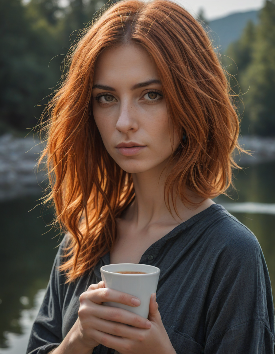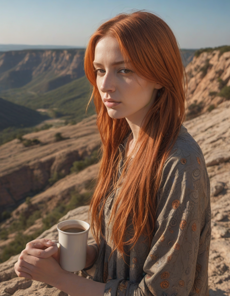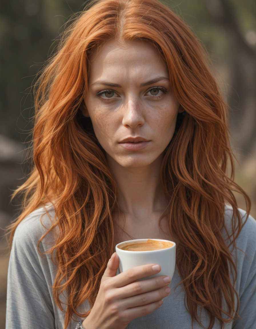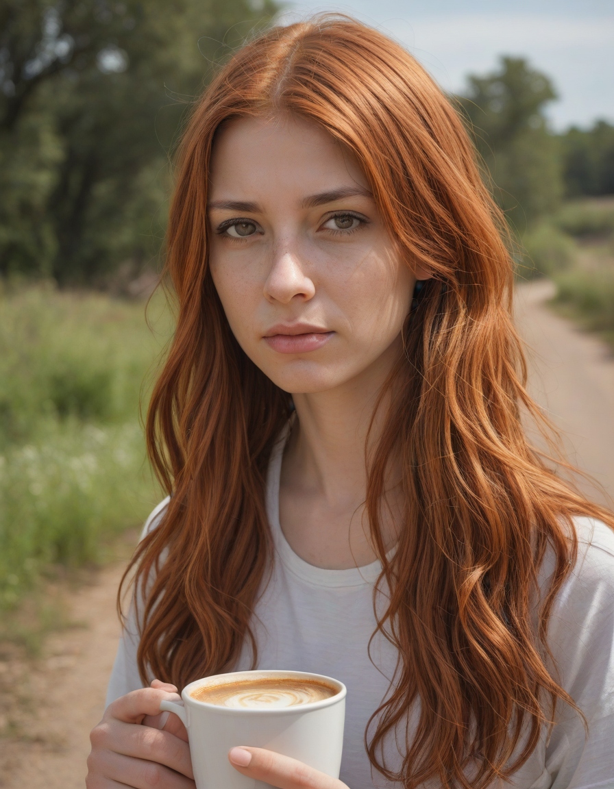 , Distorted, scorched earth, enjoying the sunshine outside, pouting, a stunning, breathtaking beauty, Ethereal tendrils of cosmic energy, sipping coffee