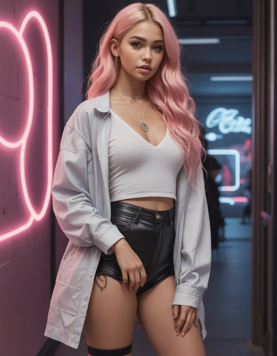This visualization retains the essence of our previous description, now enhanced by a pose that speaks volumes of her confidence and the vibrant spirit of the e-girl aesthetic. It captures not just the photorealistic image of a young woman in the throes of digital age culture but also the bold statement of identity and self-expression that defines her at this significant moment in her life.