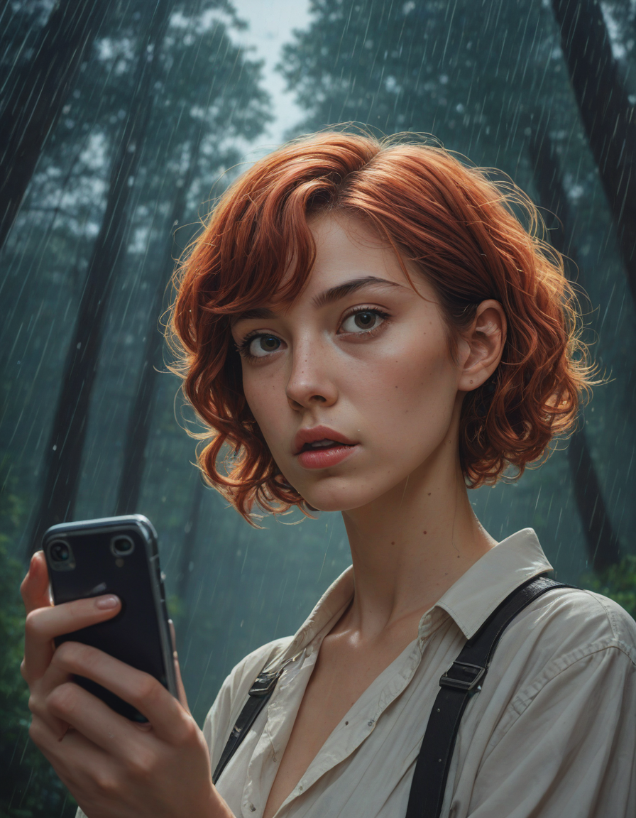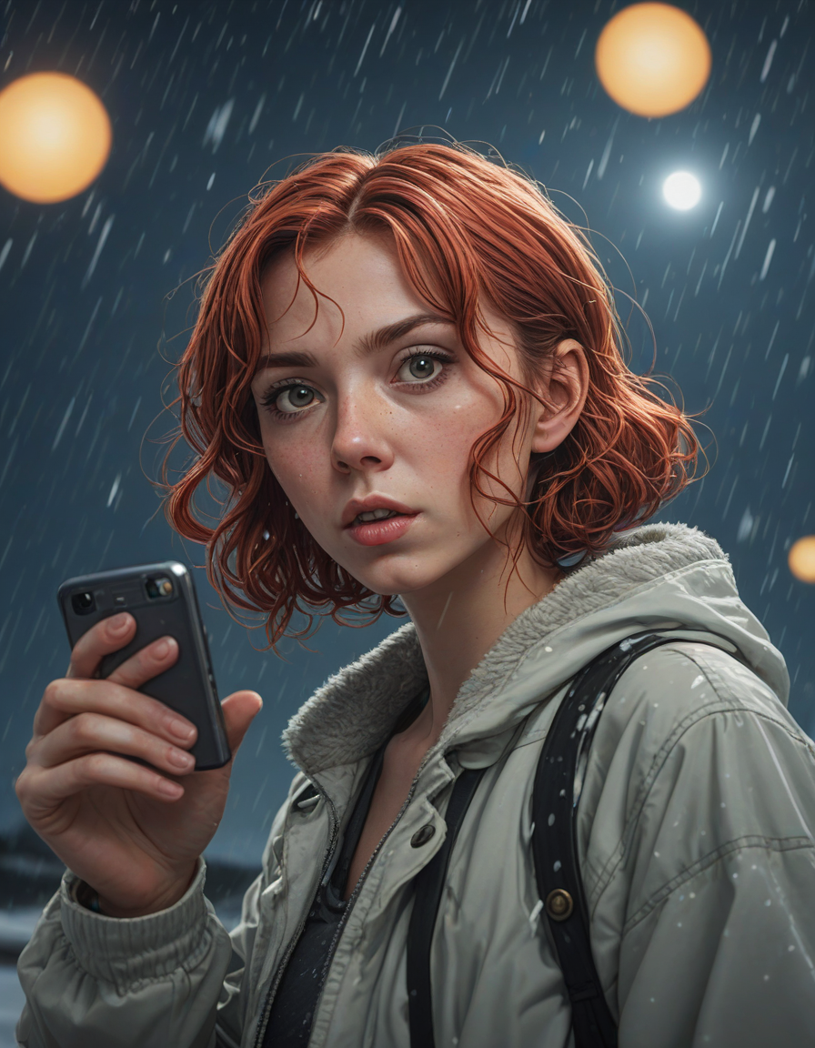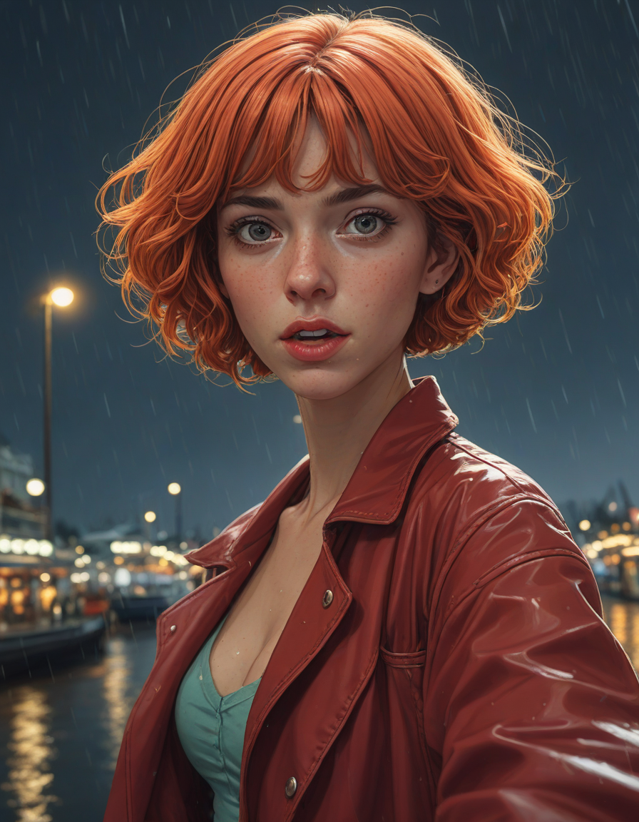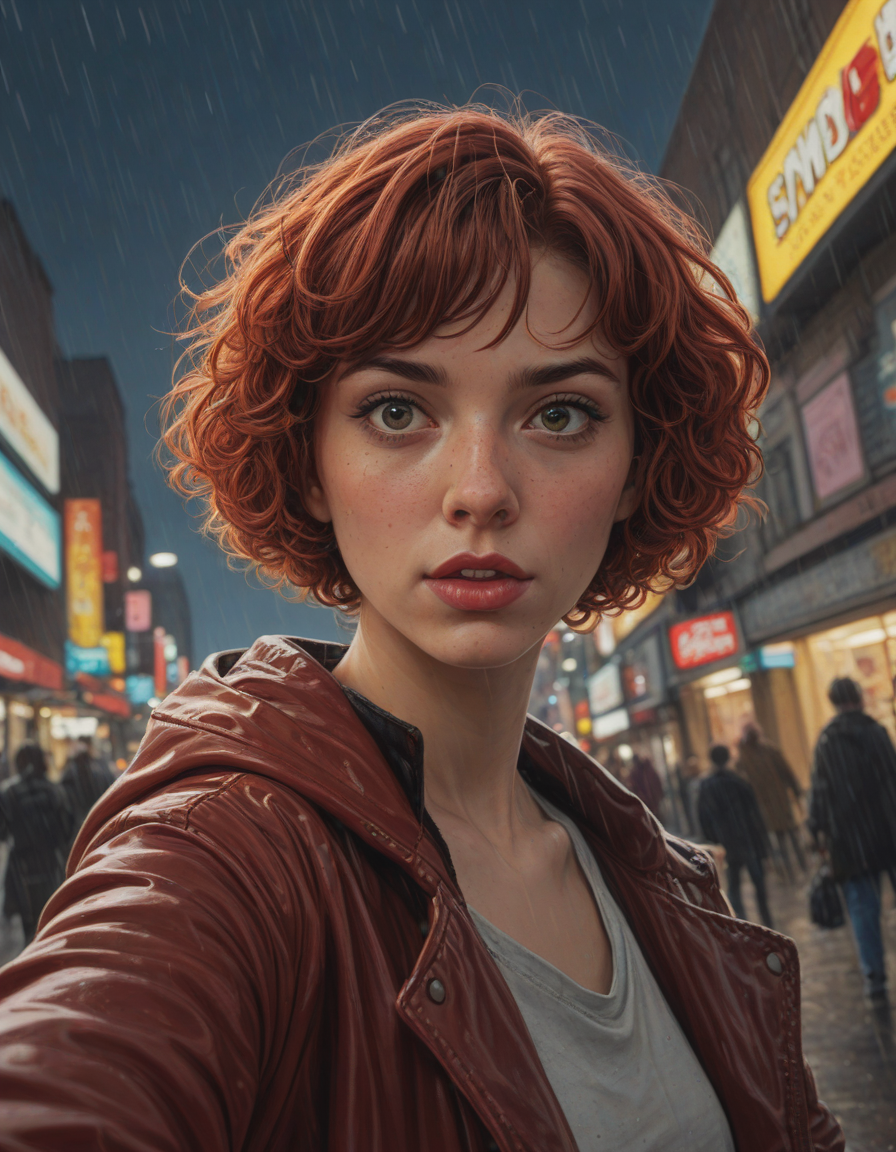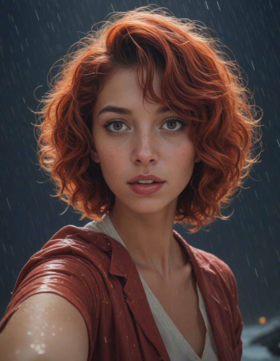woman taking a selfie, fisheye lens, scowling, caught in a downpour, glittering night sky, sparkling, Peering into the void, retro horror comic style poster, Women in vibrant Anime costumes, short curly red hair