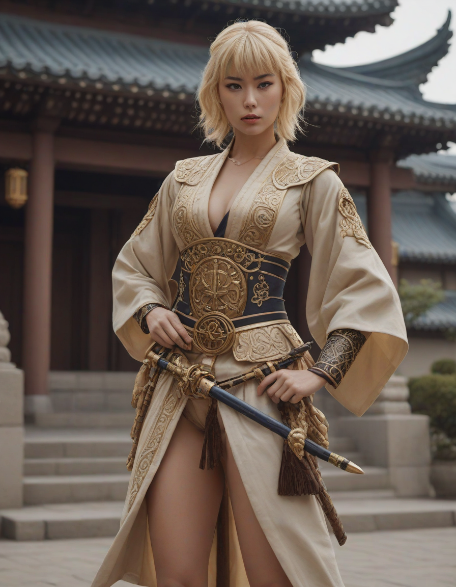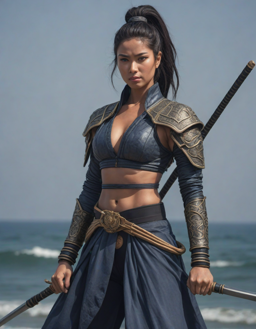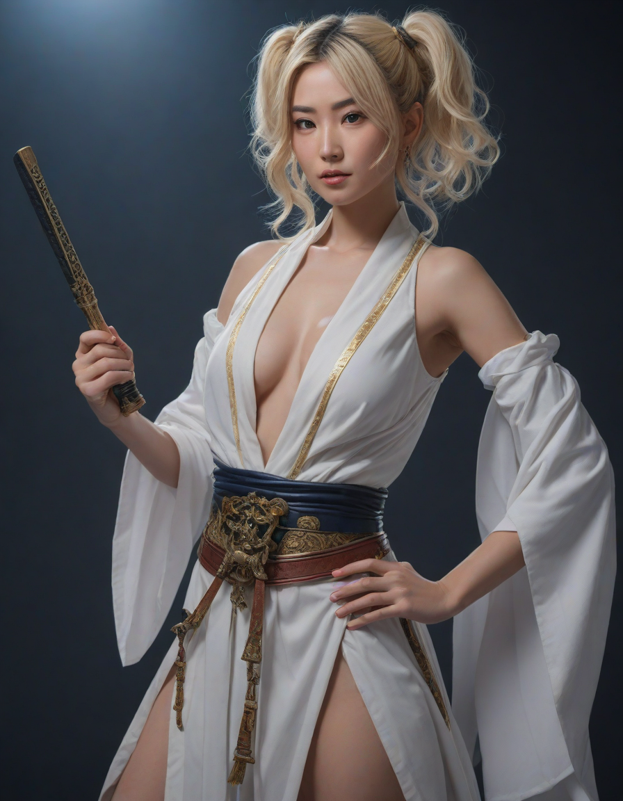 genie, A hint of desire, dressed as a samurai, Chiseled features set in determination, on stage