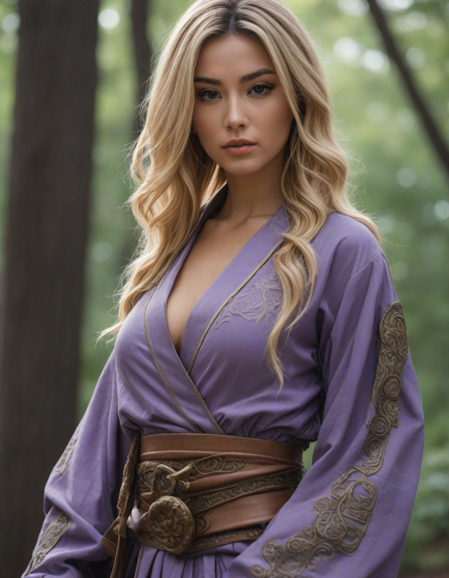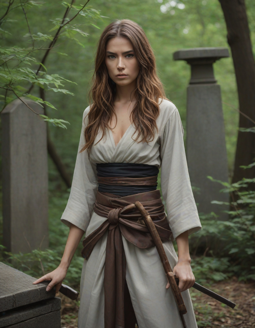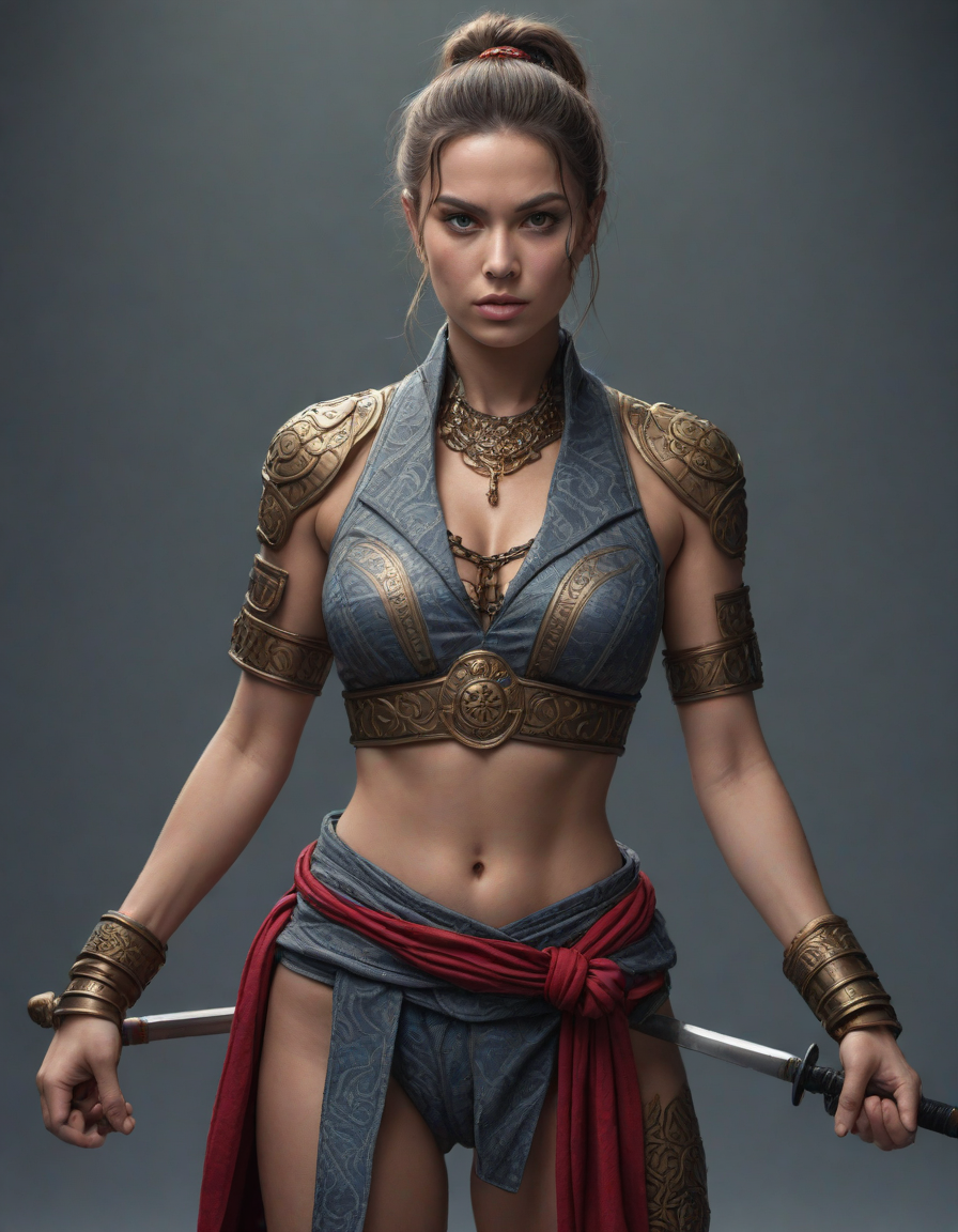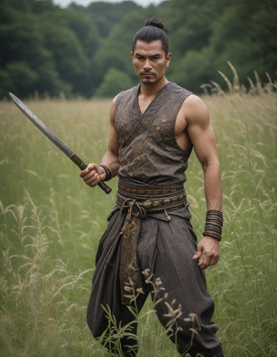 genie, A hint of desire, dressed as a samurai, Chiseled features set in determination, on stage