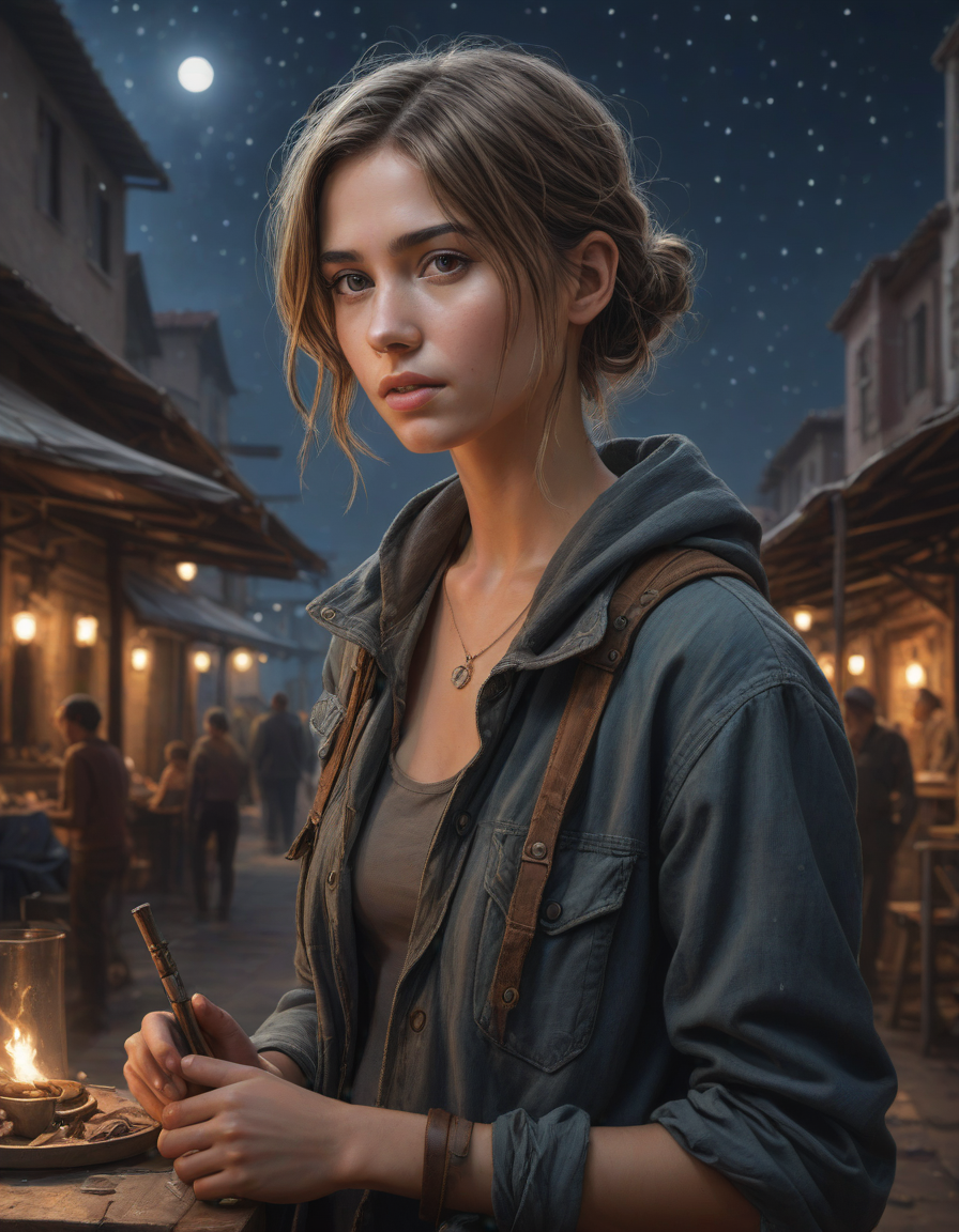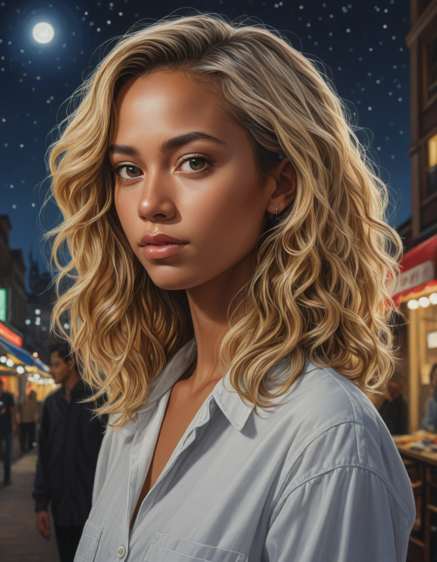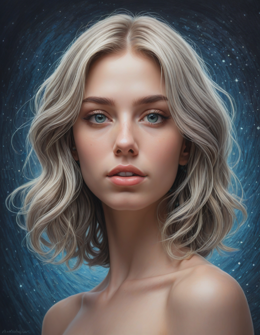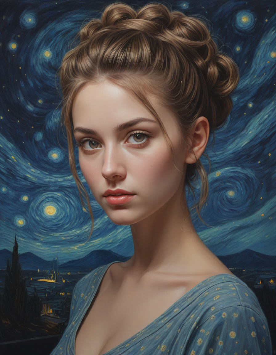 oil painting, the starry night, immaculate facial features, A hint of desire, dully glowing with internal fires, extremely detailed