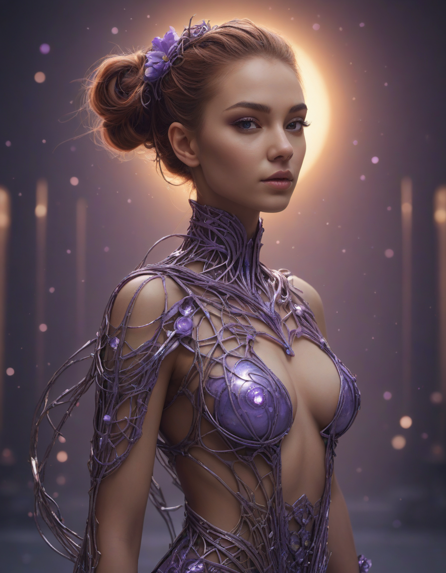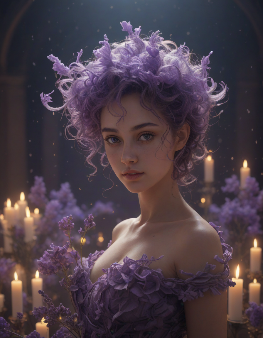 trending on artstation, facing left, radiant beauty, Lavender nebula, Blinding sunrise, voxels, heart stopping beauty, unraveling in a splendid chaos, Glistening in the light of a thousand candles
