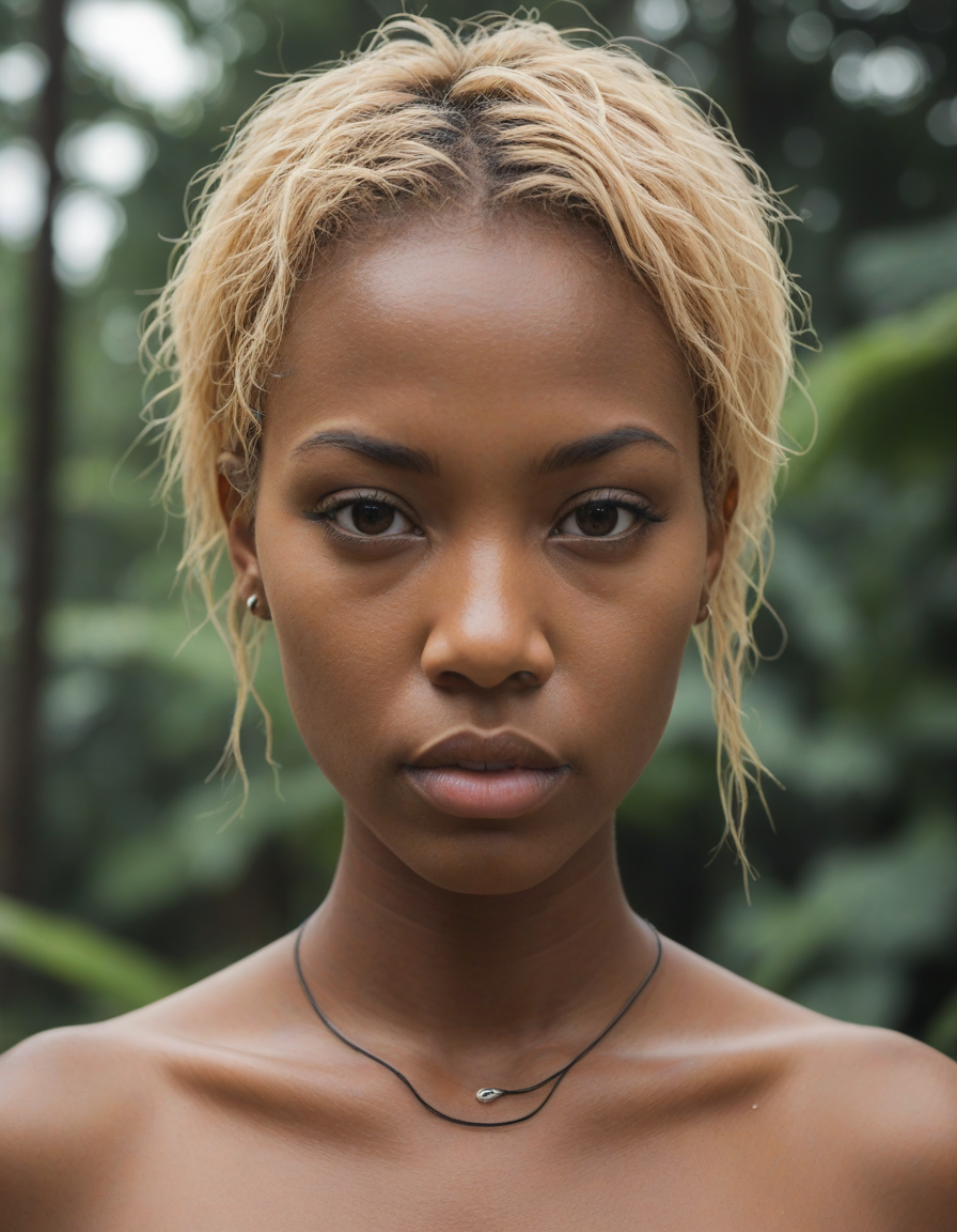 Steamy jungle, thick with humid air, fade haircut, lash extensions batting eyes, symetrical, extreme pain