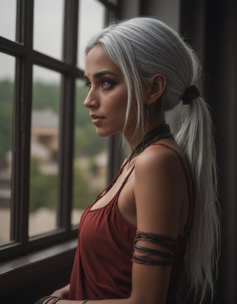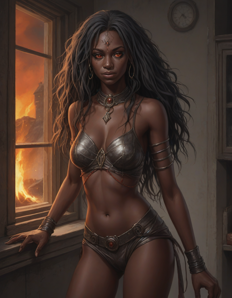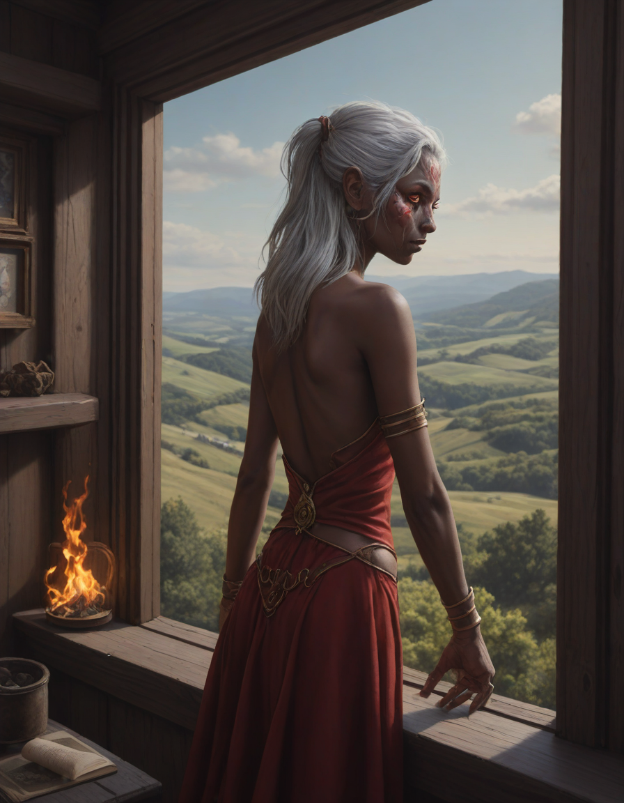 dark elf,drow, burning red eyes, looking out of the window, Eyes glint with mischief, rolling hills, Body trembling with excitement
