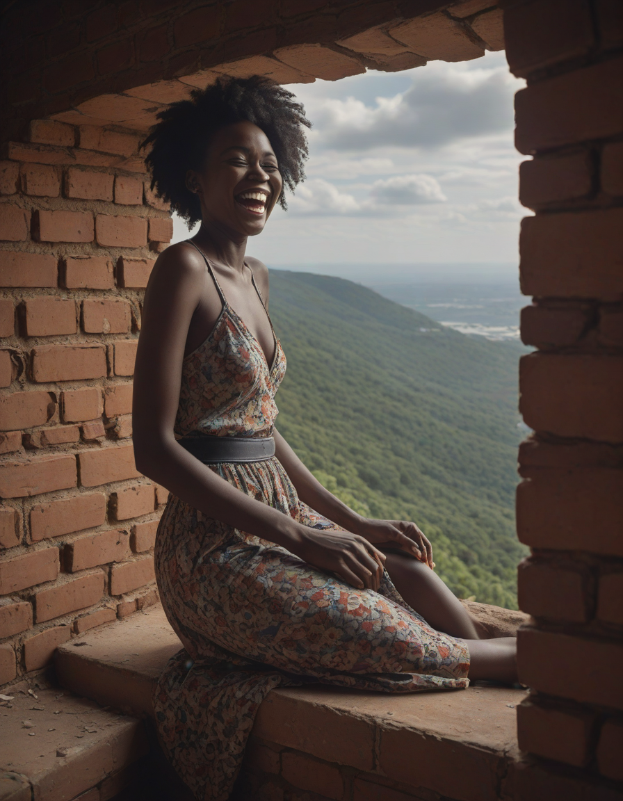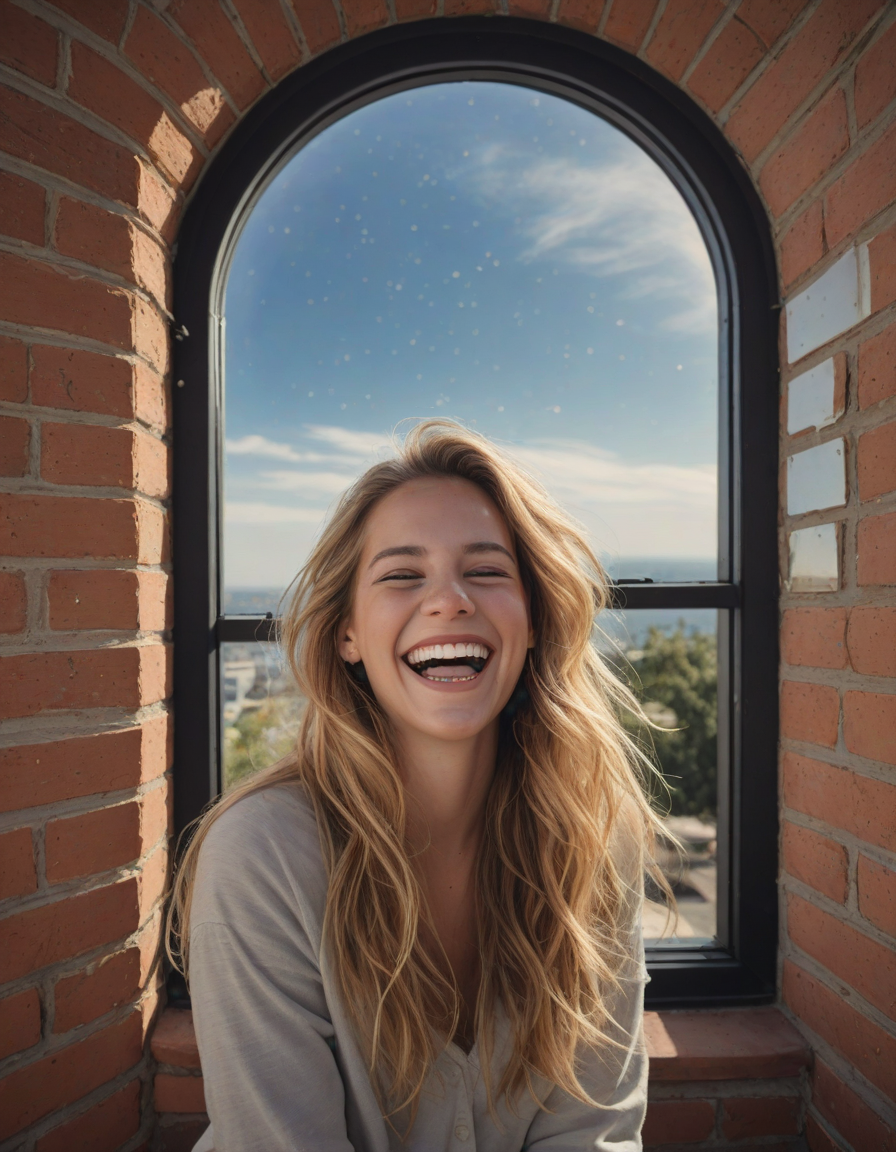 laughing, brick wall -> great window view