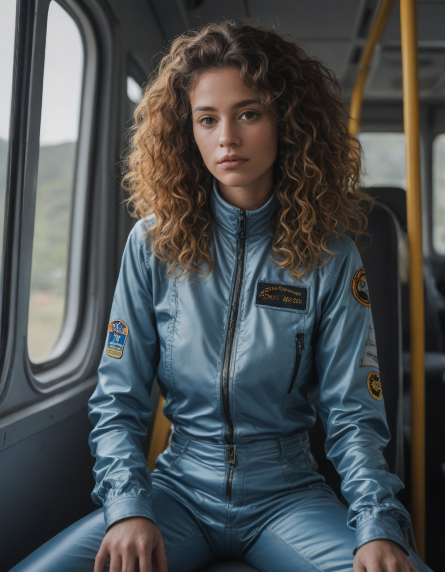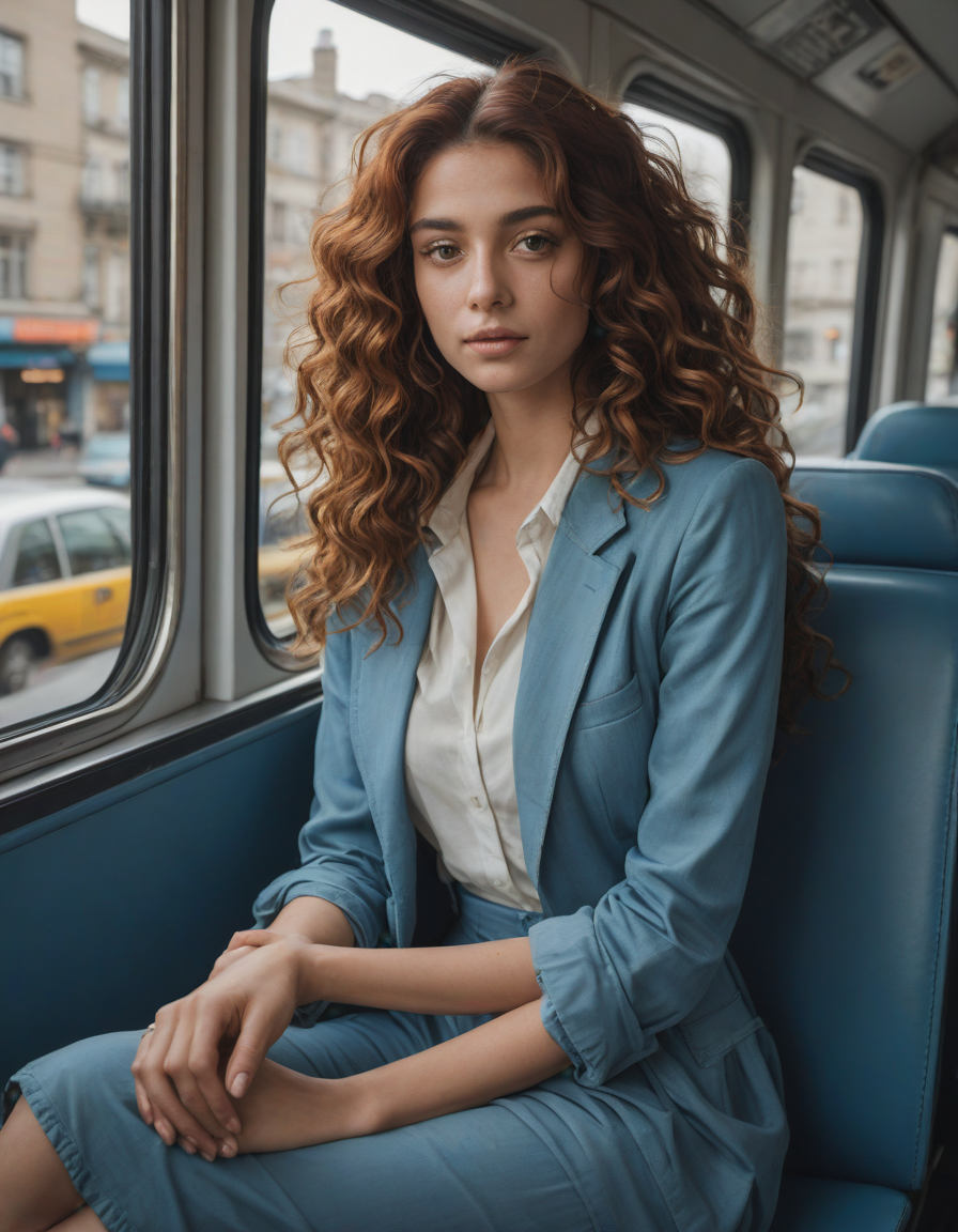 blue, octane render, eyes wide with wonder, New Romantic 80s clothing, savoring the view, Velvet hair cascades in buoyant tendrils down delicate shoulders, glinting like spun gold in a chink of sunlight, on the bus