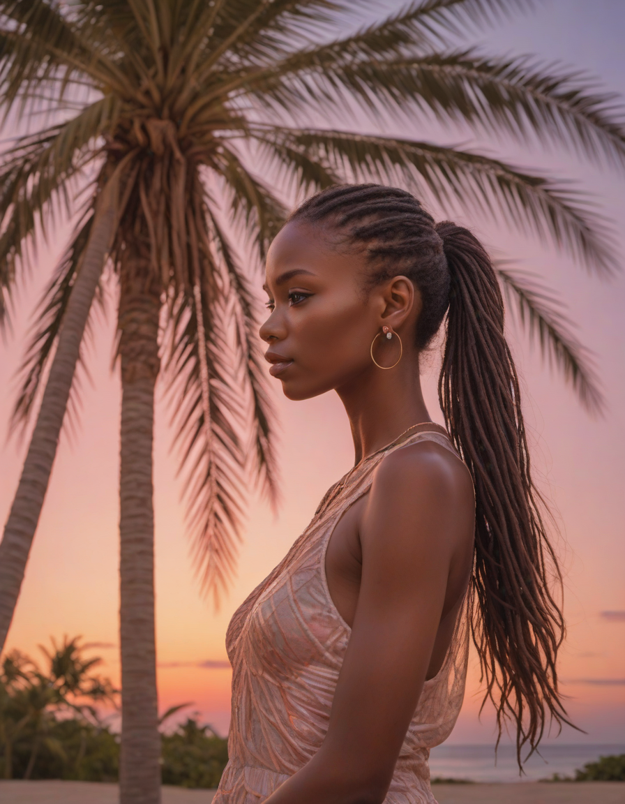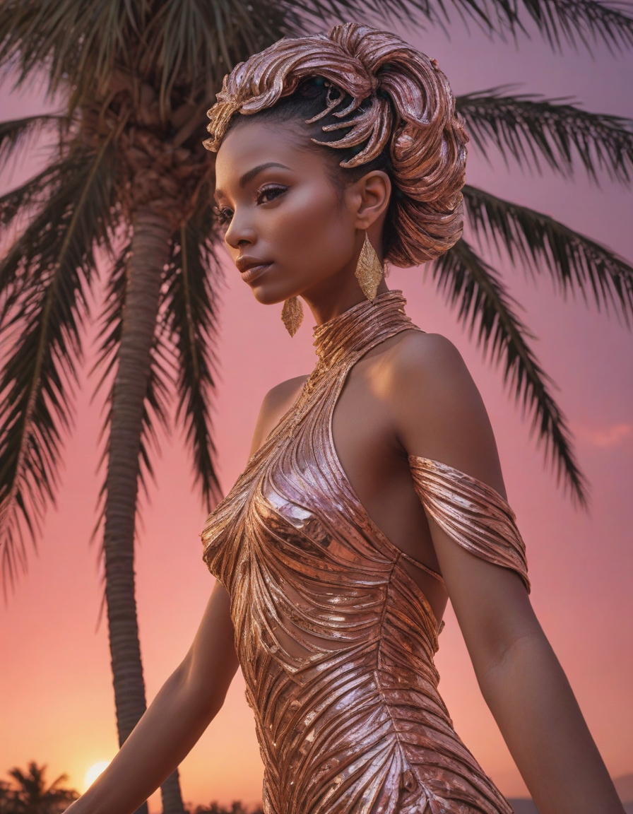 hair up, crystal sculpture, snickering, shimmering aura, Transfixed, Prismatic renaissance, Eyes unmoving, transfixed upon a soothingly swaying slender palm tree silhouetted softly against a radiantly rosy sunrise colored sky stretched expansively beyond her sightline, photorealistic portrait