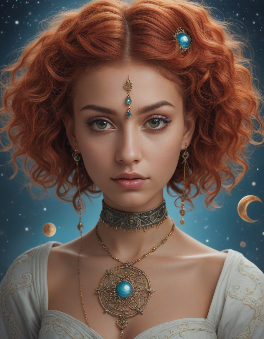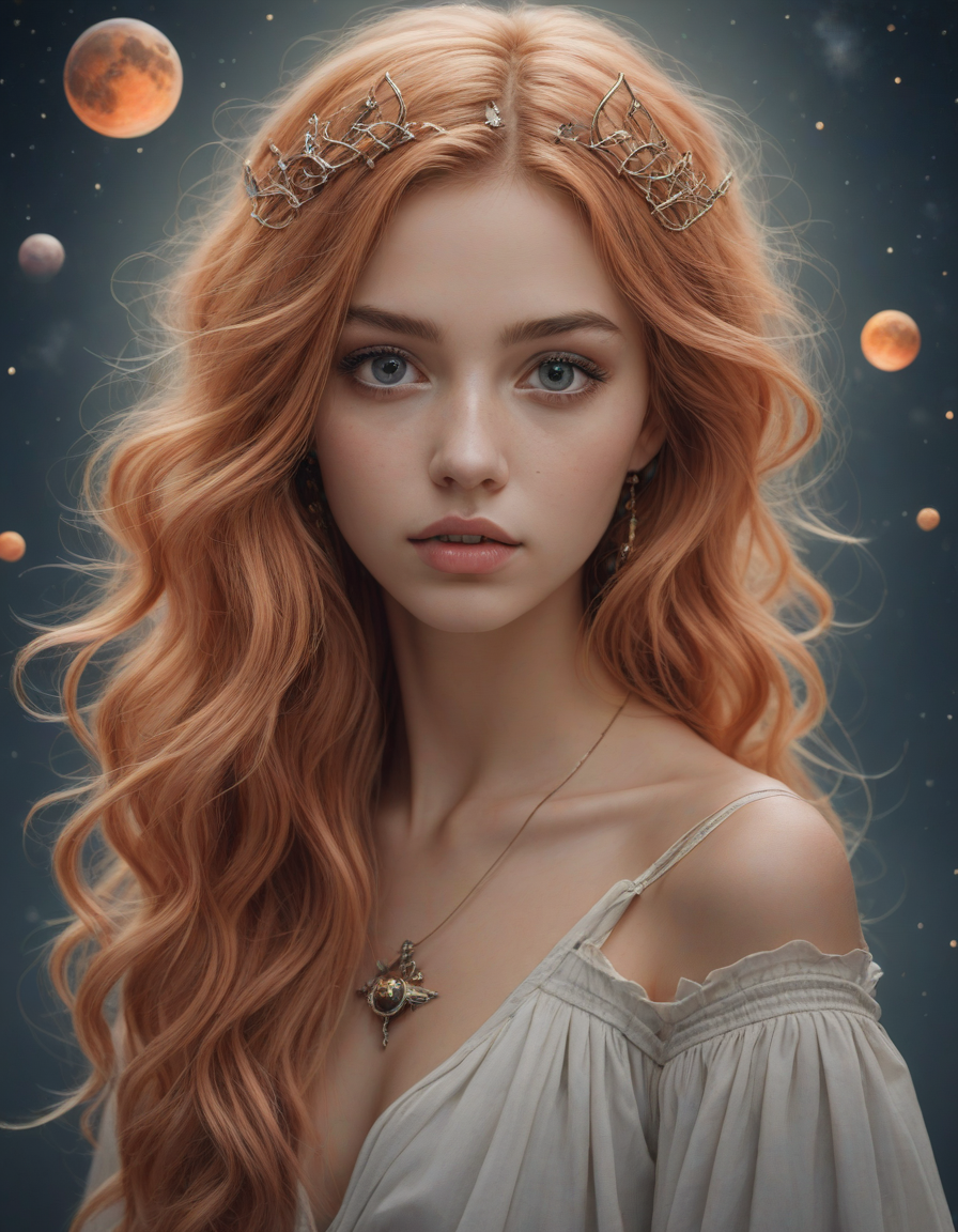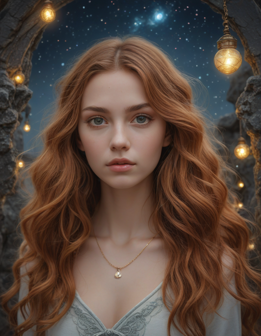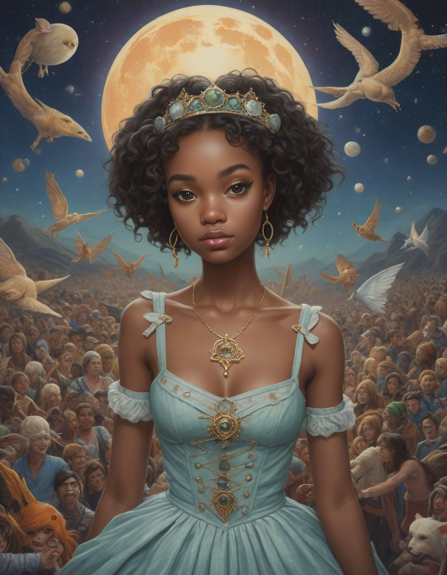 whimsical fairytale, celestial, piercing gaze, surrounded by people