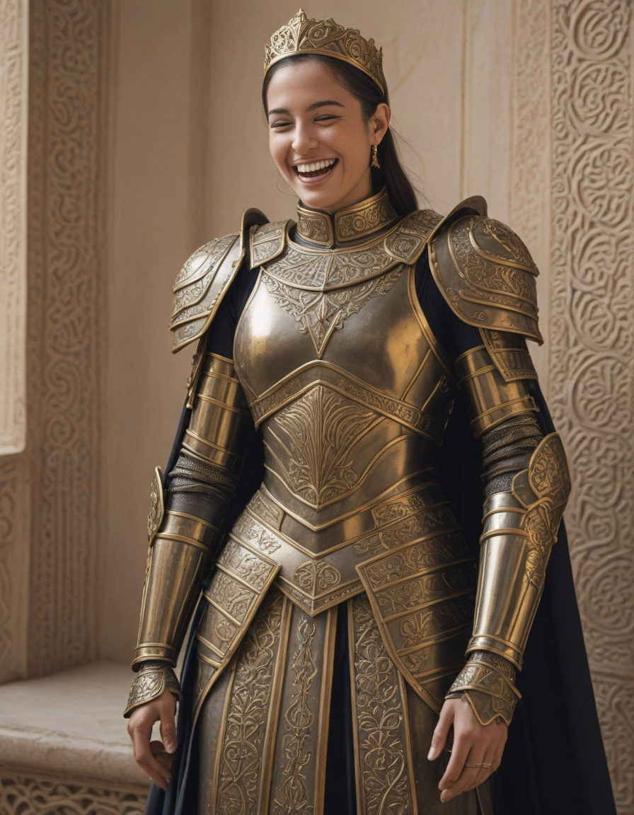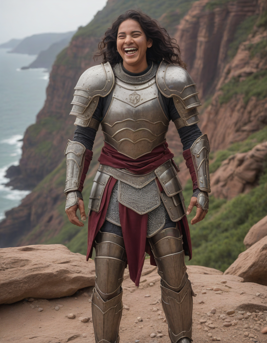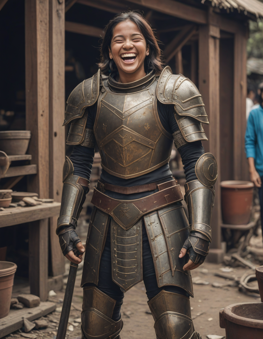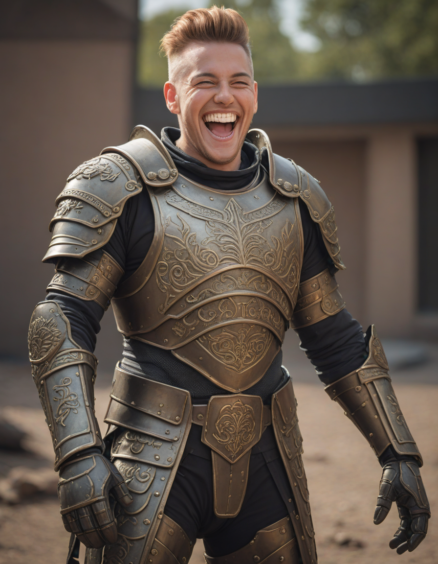 laughing, wearing complete set of armor, wearing full armor, Wearing chest armor, wearing leg armor, wearing feet armor, wearing bracer, wearing pauldrons,