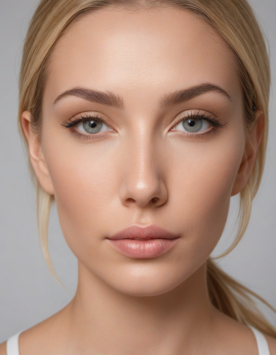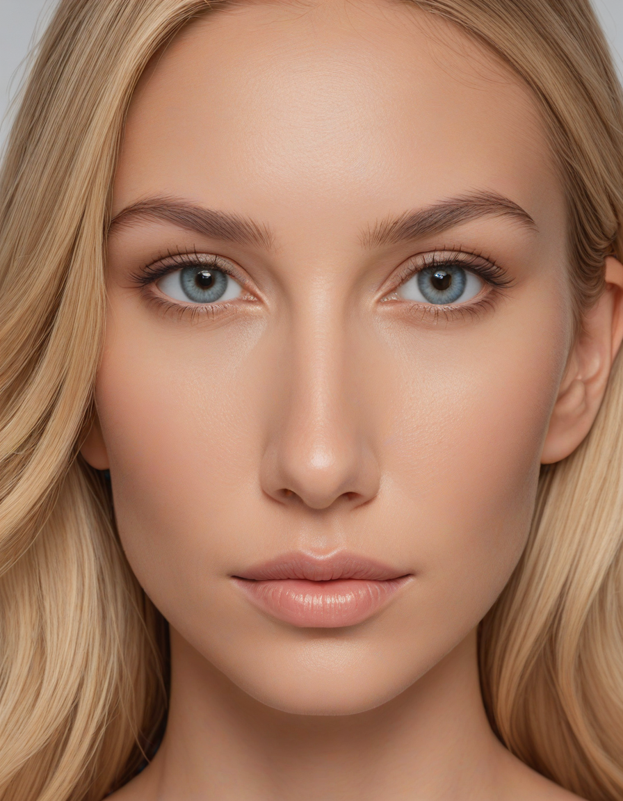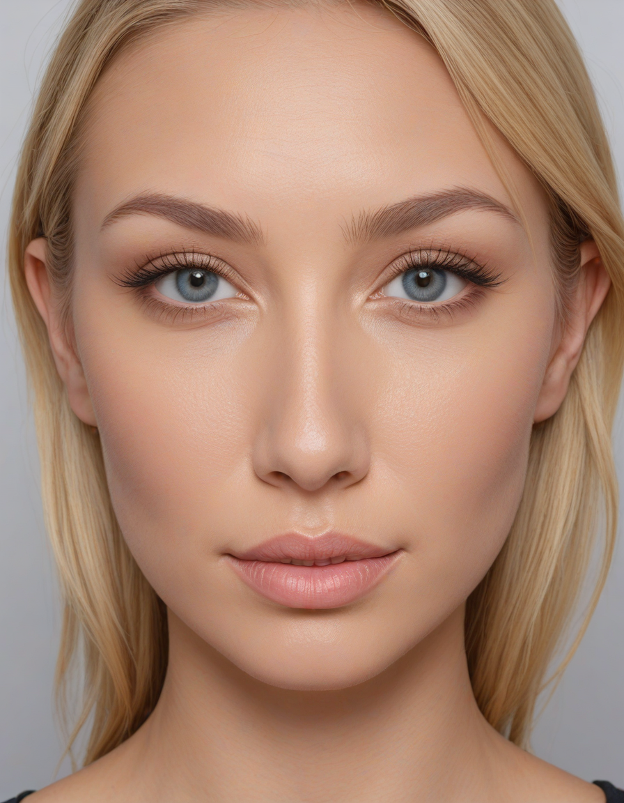 oval face shape, almond-shaped eyes, voluminous lashes, slightly arched eyebrows, narrow nasal bridge, rounded nose tip, symmetrical nostrils, full lips, pronounced cupid's bow, slightly fuller lower lip, defined cheekbones, rounded chin, smooth complexion, softly contoured jawline, balanced facial proportions, symmetrical features, gently curved eyelids, soft brow ridge, harmonious cheek to jawline transition, subtle philtrum, delicate ear lobes, straight blonde hair, clear skin, hooded eyelids, light pink lip color, slightly pouty expression, casual pose with hand on face, slight head tilt, indoor lighting, Light blue irises, Medium-thickness eyebrows, Softly angled eyebrows, A hint of freckles across the nose and cheeks, Natural makeup, Gentle frown lines between the eyebrows, Soft nasolabial folds, Smooth forehead, Subtle dimple on the chin, Clear facial contour without distinct shadows, Even skin tone with a hint of natural pink undertones, Slightly rosy cheeks, Tapered jawline, Fine hair texture with gentle waves, Youthful appearance with soft facial features, Lip fillers, thick full lips, enhanced lip volume, accented cupid's bow, Rhinoplasty, refined nose shape, straightened nasal profile, facial symmetry, Botox injections, smoothed facial lines, reduced wrinkles, youthful appearance, Cheek fillers, pronounced cheekbones, sculpted contours, lifted cheeks, brightened eyes, reduced under-eye bags, rejuvenated area, Liposuction contoured shape, reduced excess fat, sculpted physique, Dermal fillers, restored volume, smoothed texture, diminished lines, strengthened definition, balanced proportions, enhanced jawline, Facelift, tightened skin, reduced sagging, improved skin tone, reduced imperfections, enhanced clarity, Blepharoplasty, Reduced puffiness, restored youthful eye contour, Enhanced chin shape, improves facial harmony, strengthened jawline definition, symmetry facial features, golden_ratio