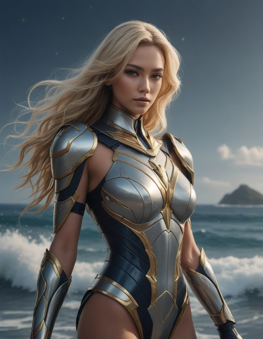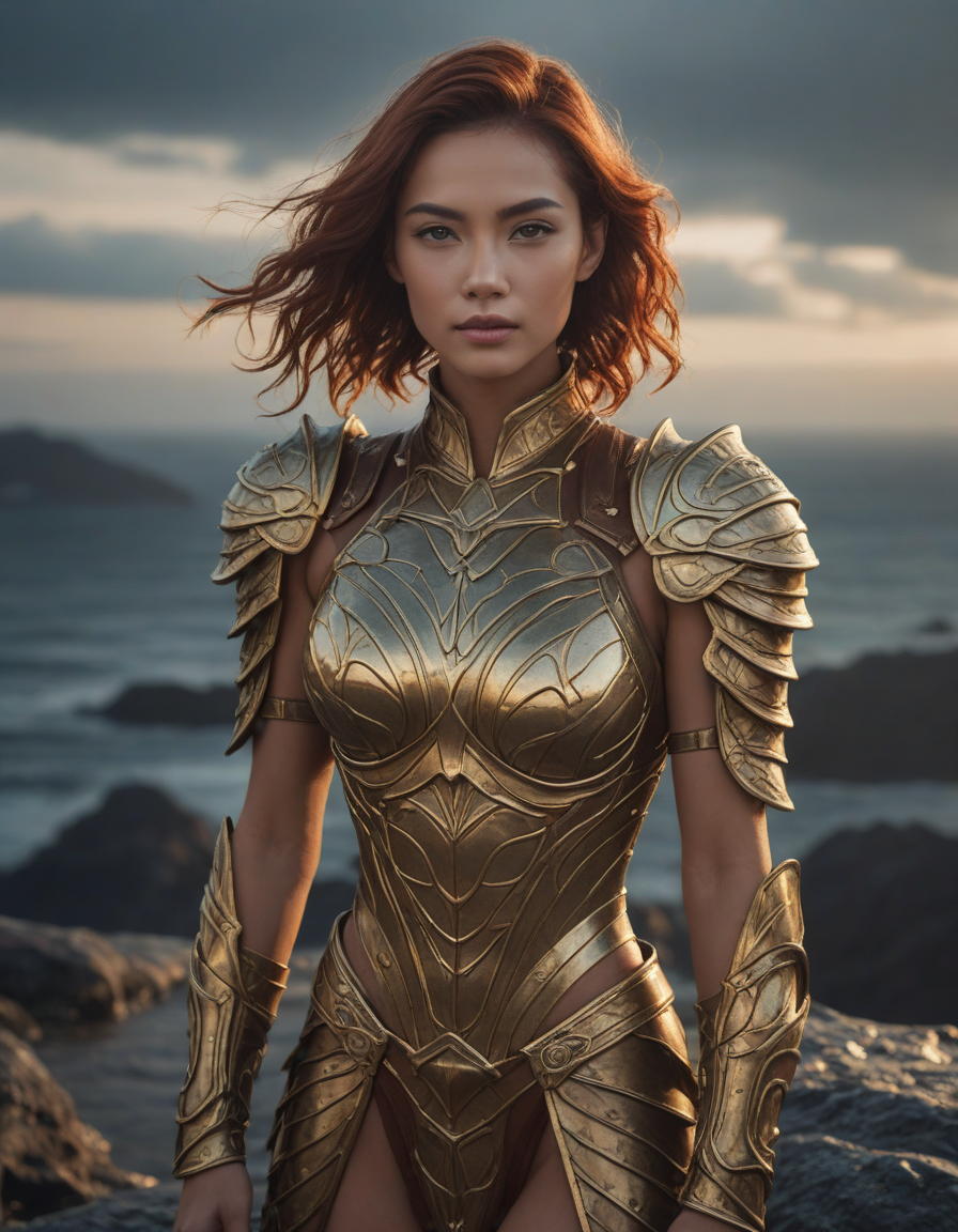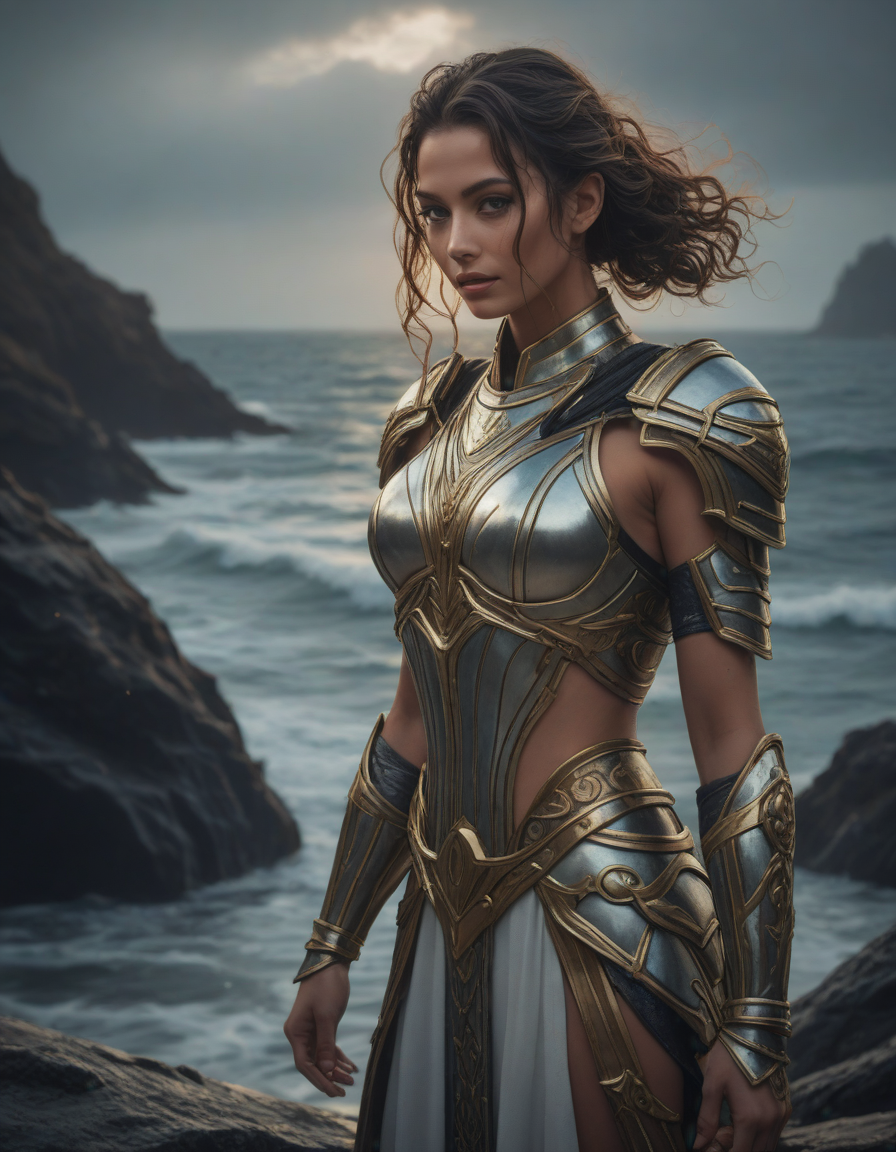 legendary, armor-clad hero, sparkling sea spray, cinematic lighting with moody ambiance, a strikingly gorgeous, unforgettable visage, glow