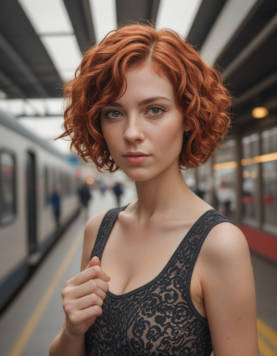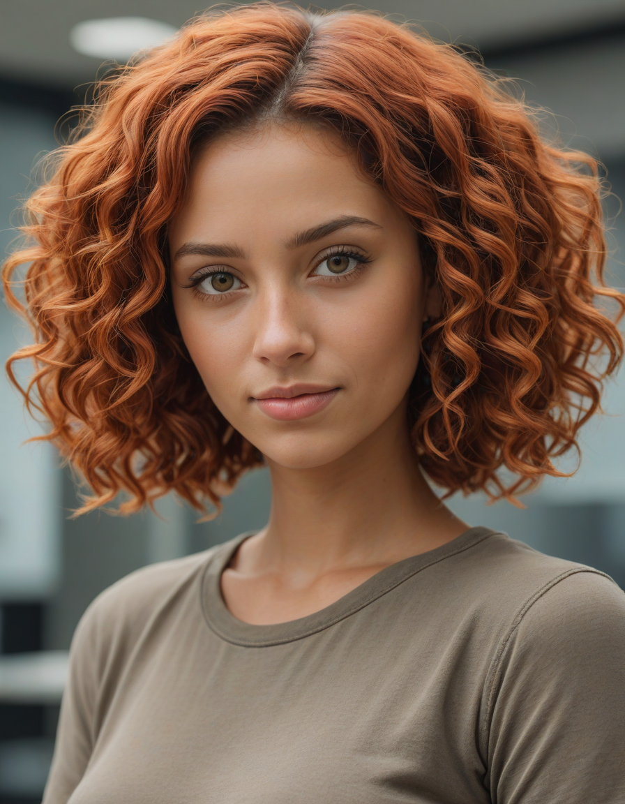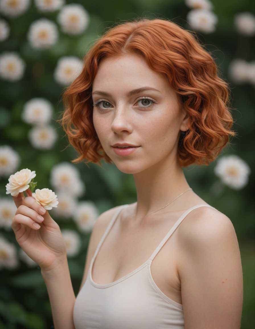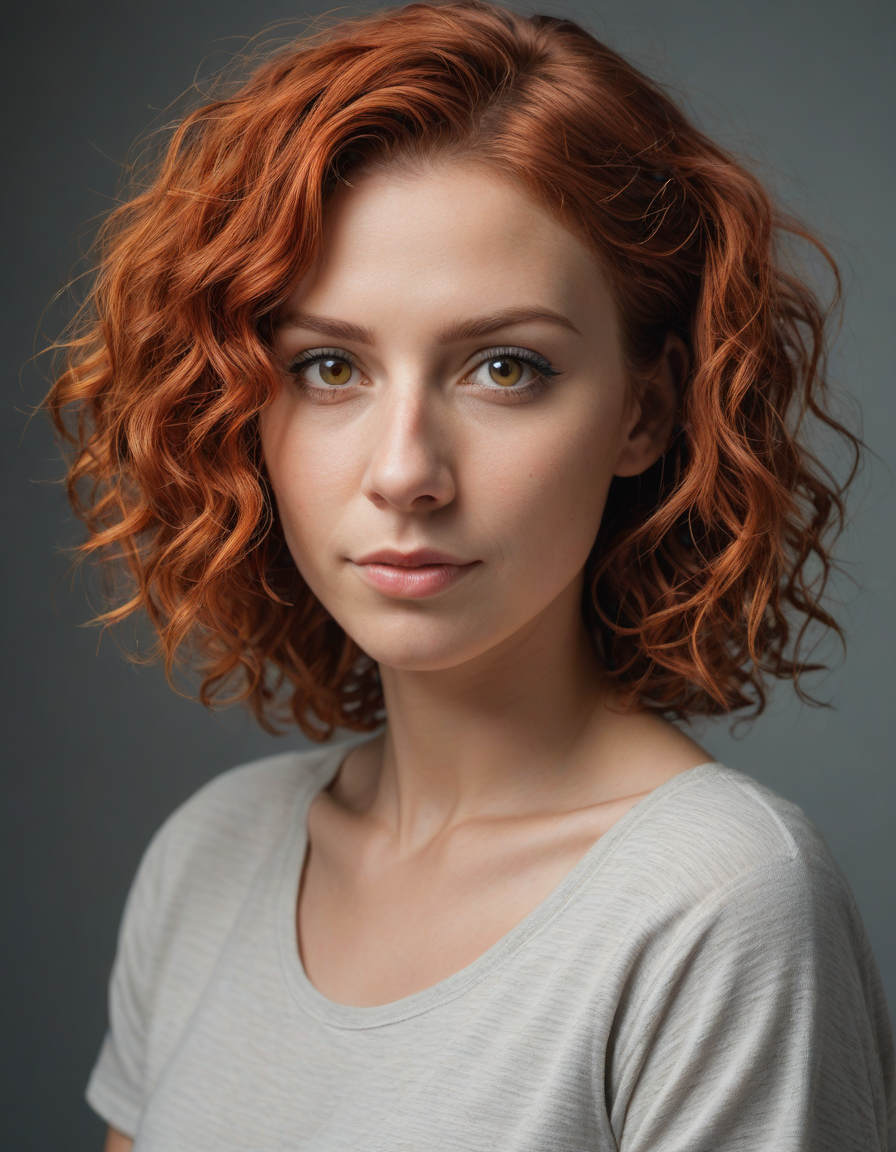 short curly red hair, outstretched hand, Eyes glint with mischief