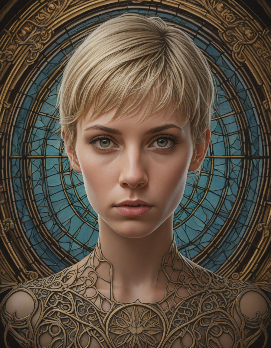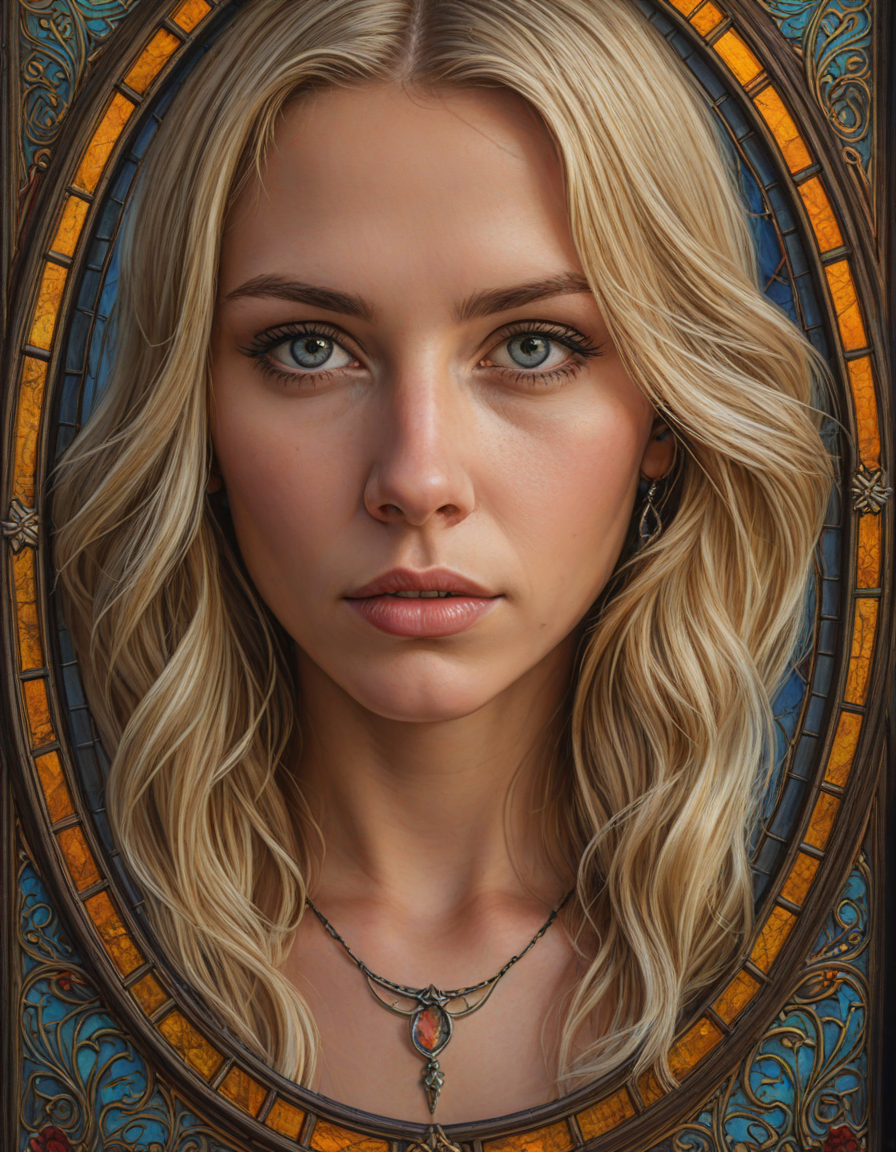 photorealistic portrait, stained glass window, with intricate patterns, piercing stares