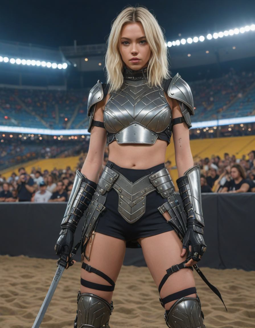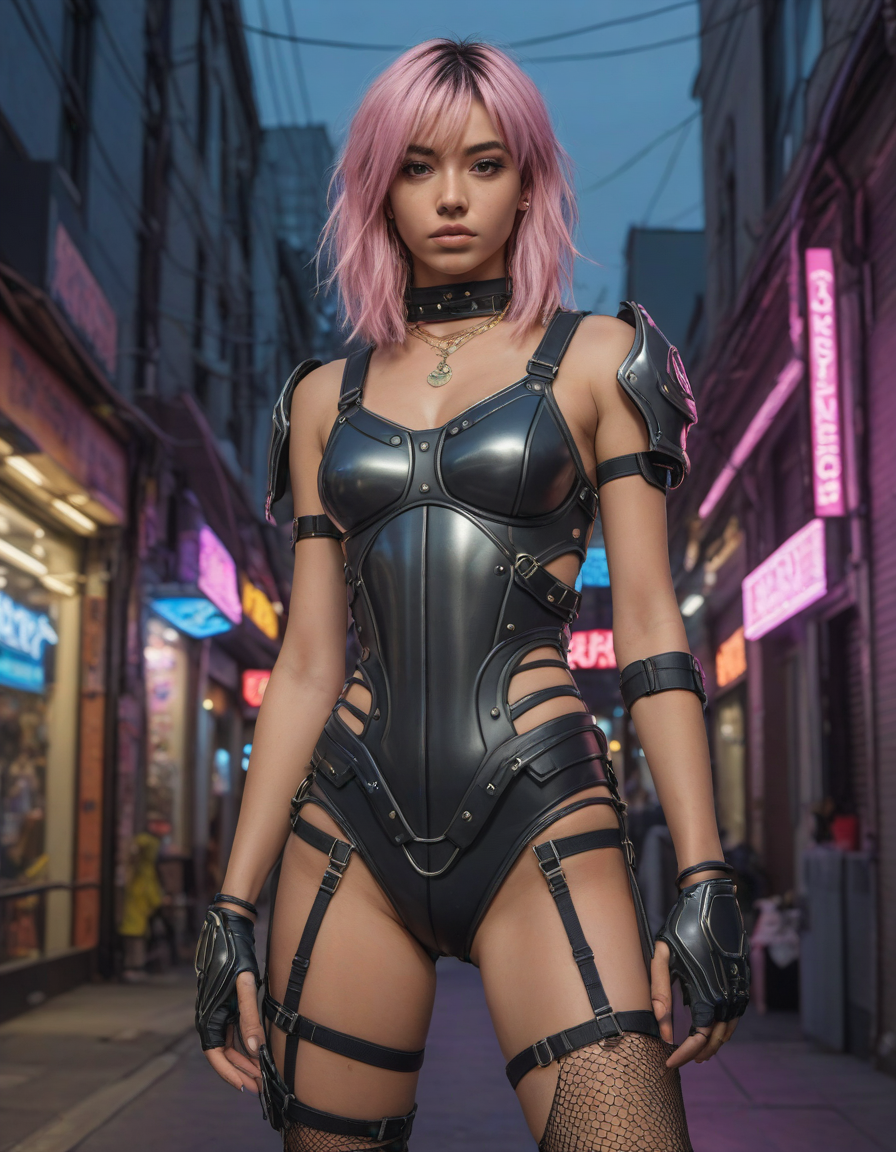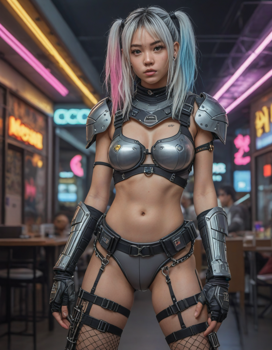 Wielding a one-handed weapon in both hands, one-handed weapon, weapon, , Visualize a photorealistic portrayal of an 18-year-old high school senior girl, epitomizing the e-girl aesthetic with a blend of internet culture's vibrancy and personal audacity. Clad in an oversized striped shirt under a black graphic t-shirt dress, her style is a testament to e-girl fashion's layered intricacy, complemented by fishnet tights and chunky boots. Her makeup features dramatic winged eyeliner, neon eyeshadow, and dark lipstick, with blush bringing her face to life. Accessories like silver chains and a heart pendant choker, along with pastel or neon hair streaks, enhance her playful rebellion. Standing hands-on-hips, she exudes confidence and individuality against a backdrop suggestive of e-girl life, with neon signs and string lights. This scene captures her bold identity and expressive spirit at this pivotal moment., wearing complete set of armor, wearing full armor, Wearing chest armor, wearing leg armor, wearing feet armor, wearing bracer, wearing pauldrons,