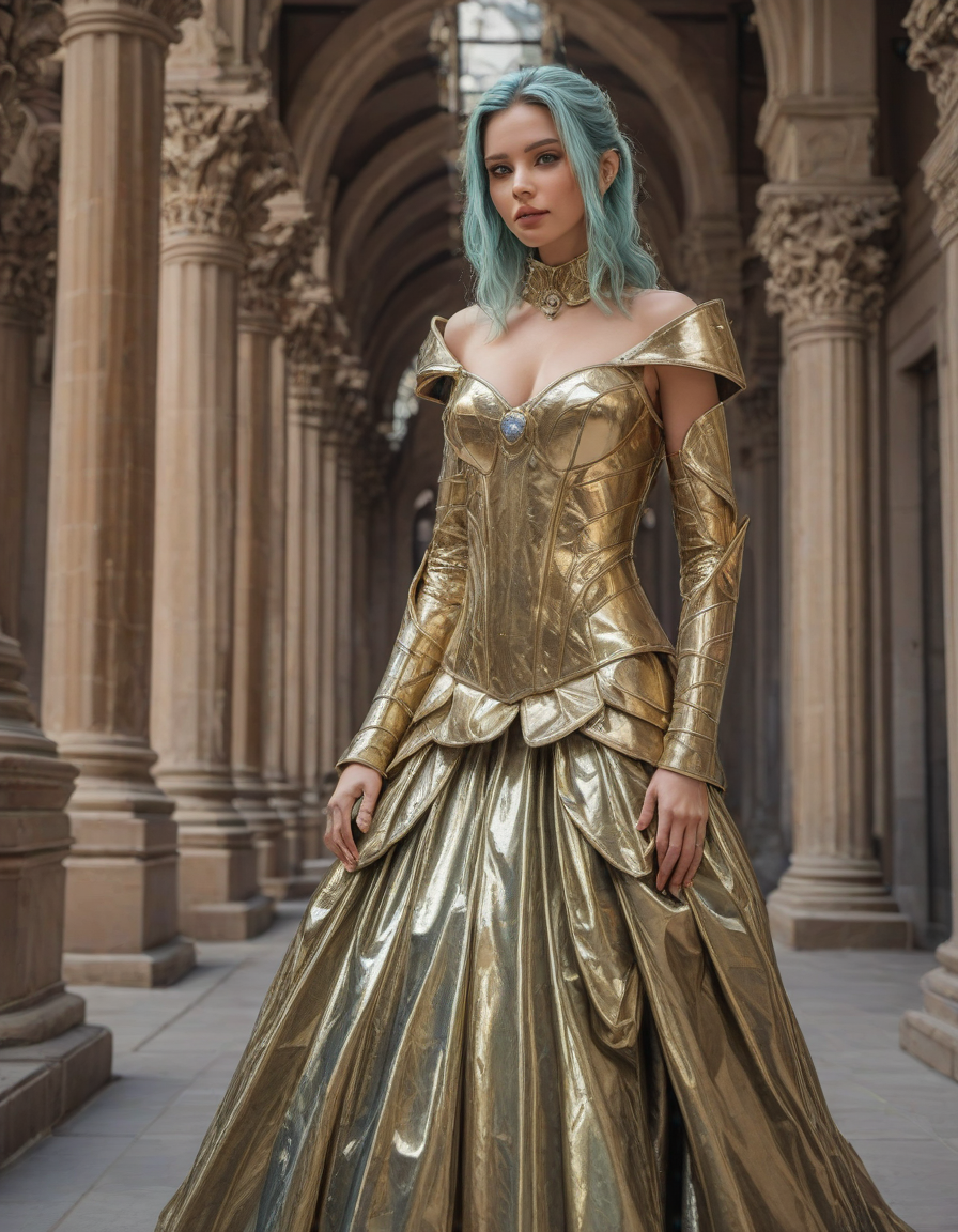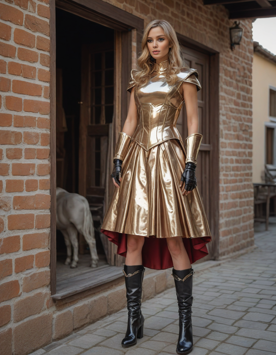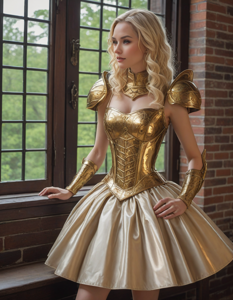 life of the party, Wide Skirt, wide ballgown hem, a line skirt, petticoat skirt, , shiny, glossy PVC outfit, (shiny glossy PVC cloth textures), clothes made from pvc, plastic, wearing complete set of armor, wearing full armor, Wearing chest armor, wearing leg armor, wearing feet armor, wearing bracer, wearing pauldrons,, brick wall -> great window view