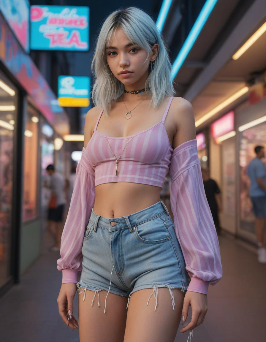 Her makeup is a canvas of e-girl artistry, with dramatic winged eyeliner that stretches towards her temples in a bold statement, eyeshadow in neon hues that electrify her gaze, and dark, matte lipstick that draws all eyes to her. A generous application of blush adds life and vibrancy to her cheeks, complemented by creatively designed nails that are both dark and daring. Accessories—silver chains, a heart pendant choker, and a collection of rings—add layers of personality and depth. Her hair, possibly featuring pastel or neon streaks, is styled in a way that balances edge with elegance, with temporary tattoos or stickers adorning her face to accentuate her playful rebellion.