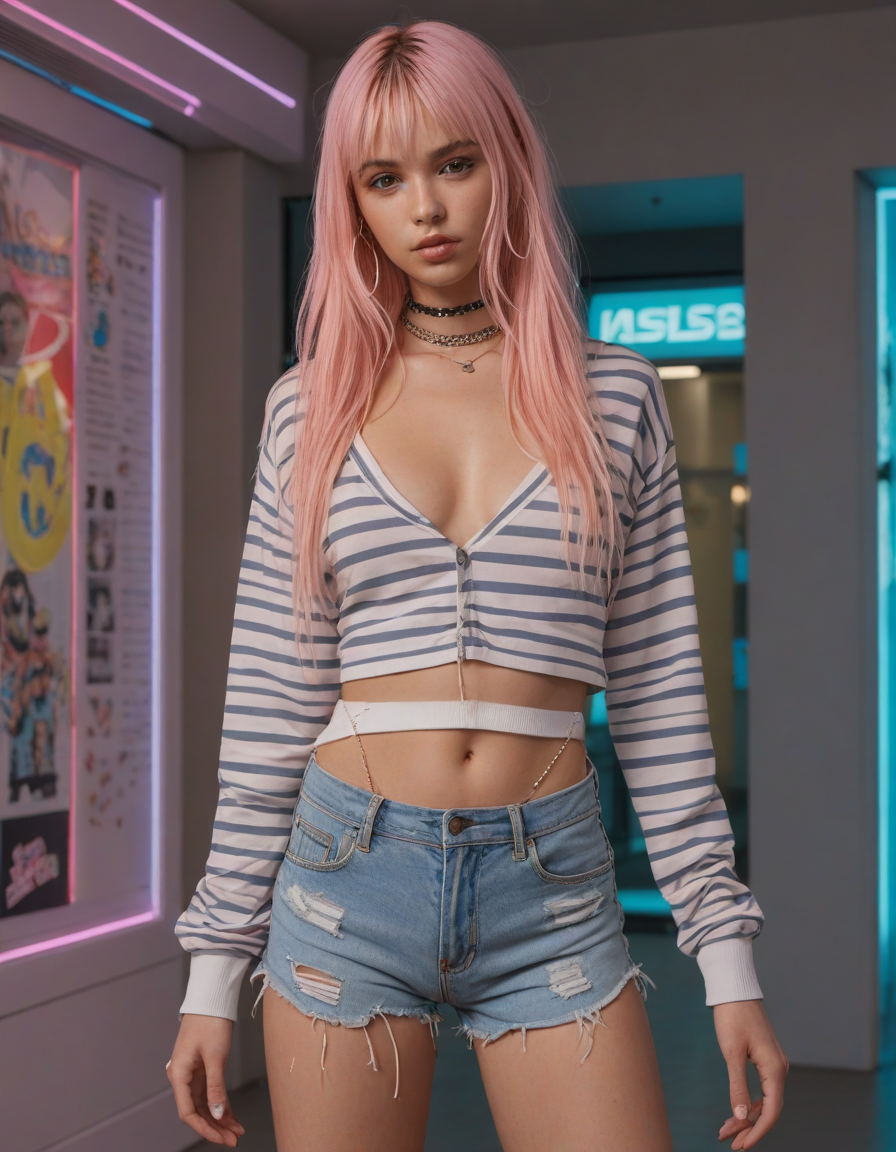 In this moment, the young woman stands with her hands confidently on her hips, embodying the essence of e-girl individuality and assurance. This pose not only showcases her outfit and the nuances of her style but also conveys a sense of self-assuredness and ownership of her identity. Her expression can be a mix of a playful smirk and a challenging gaze, inviting viewers into her world while holding them at just the right distance.