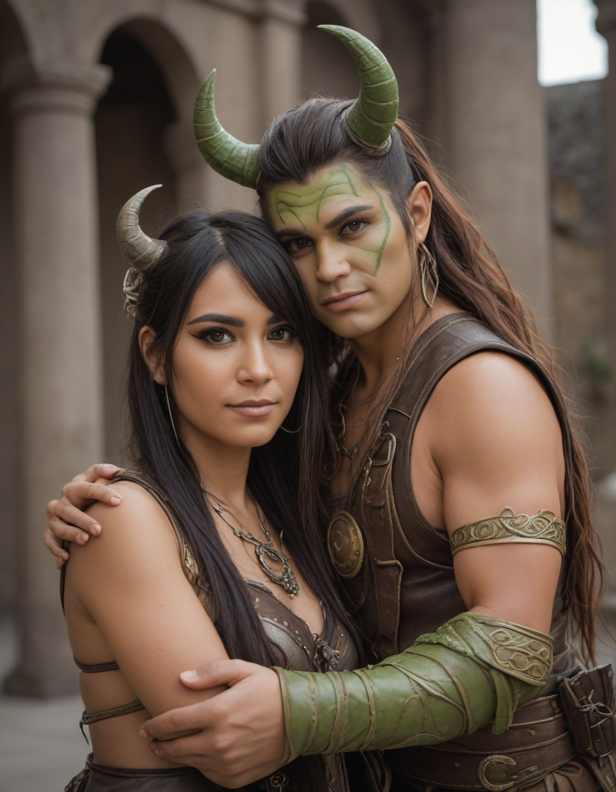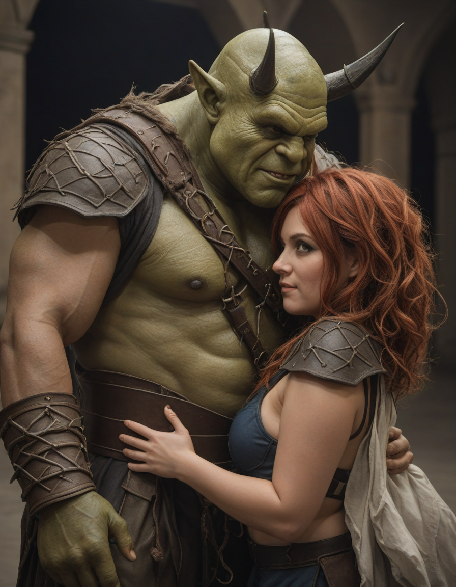 at the cosplay convention, very attractive, Cautiously, ogre, hugs embracing tightly