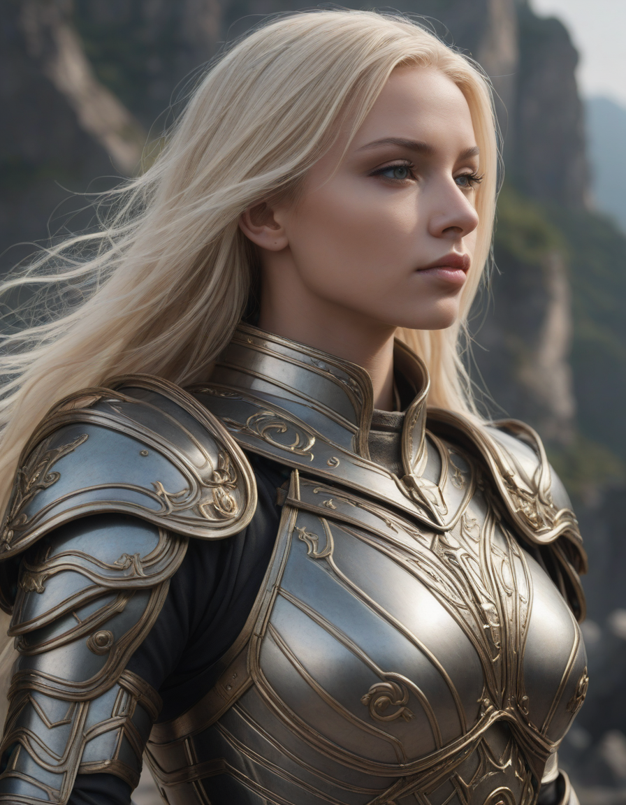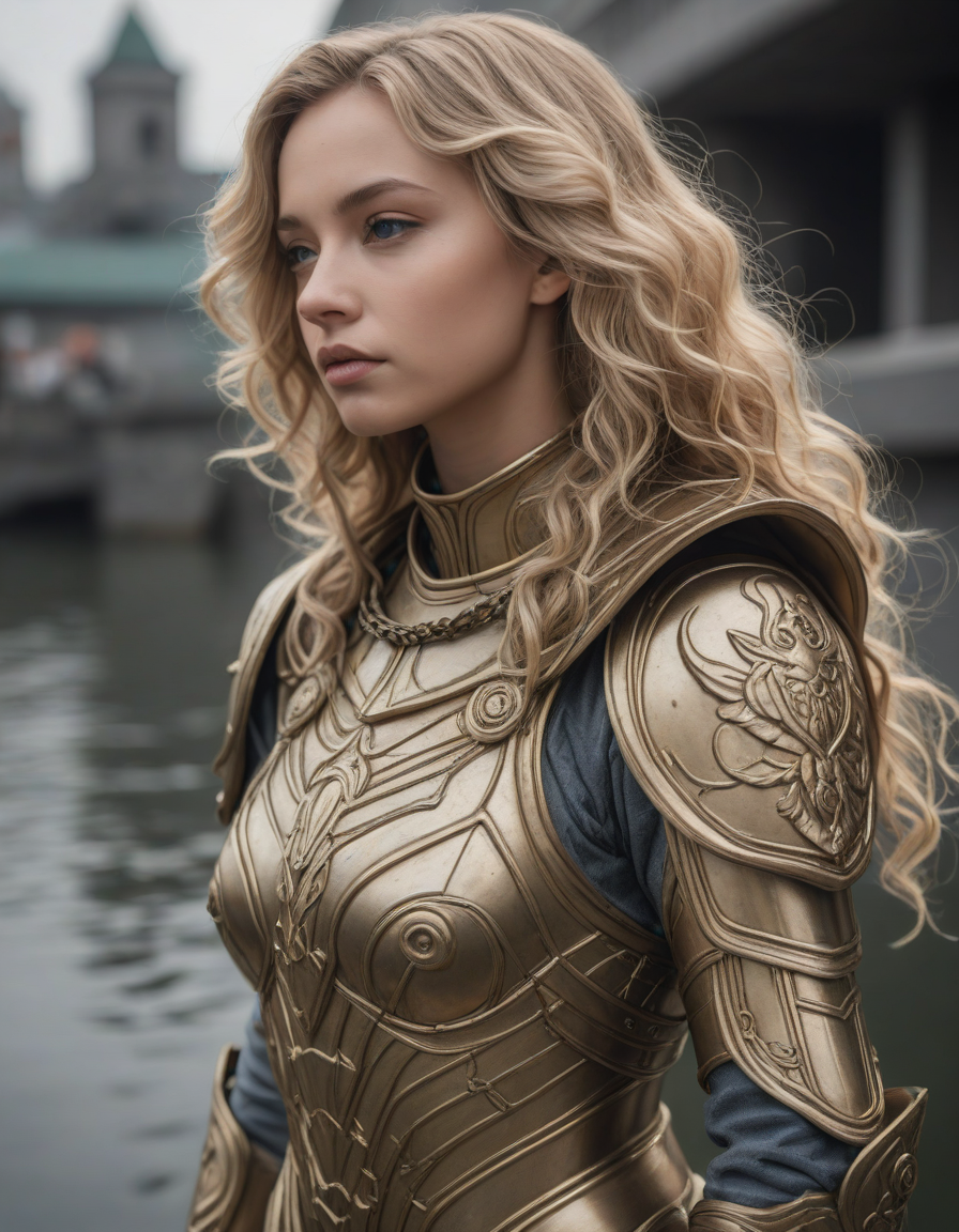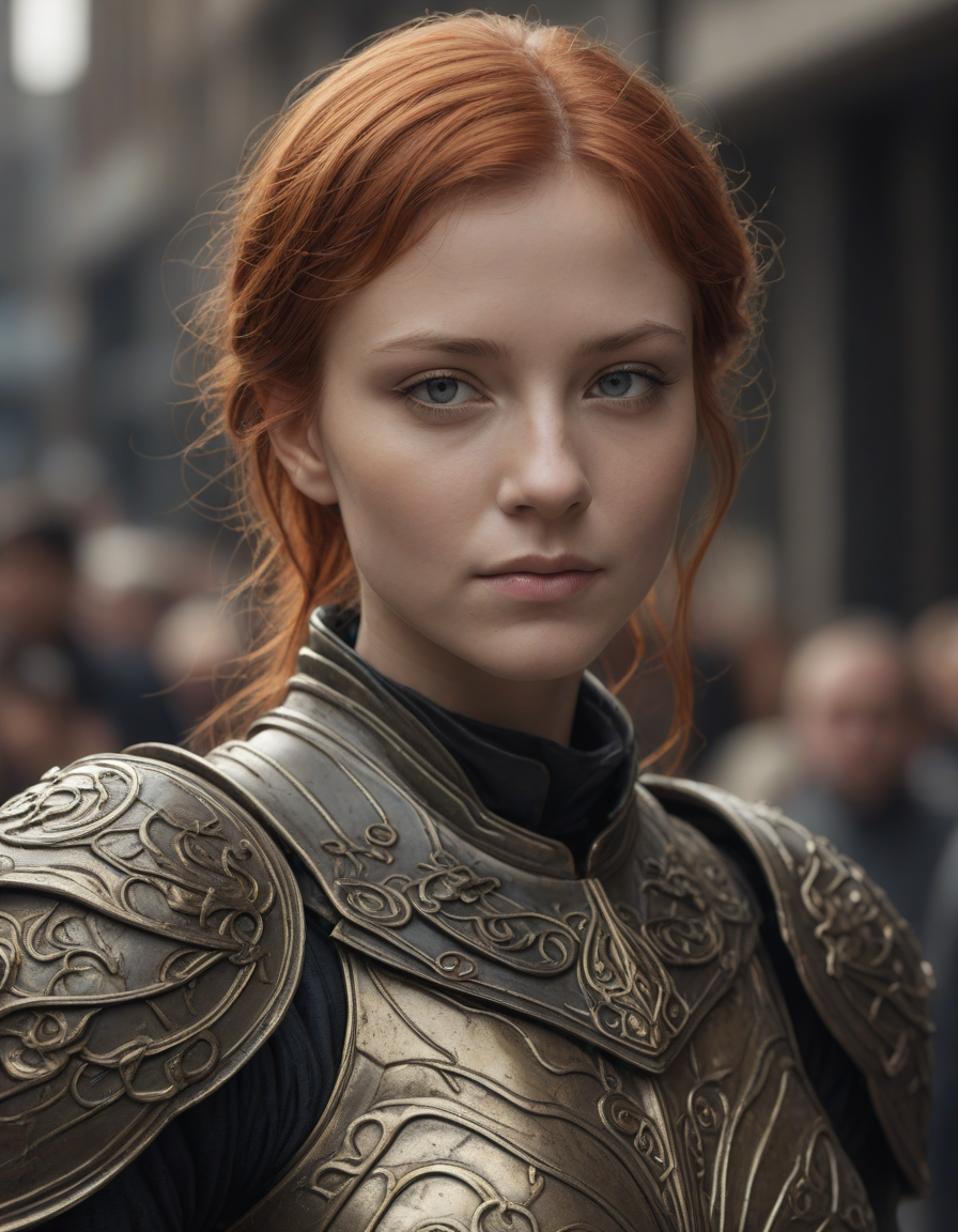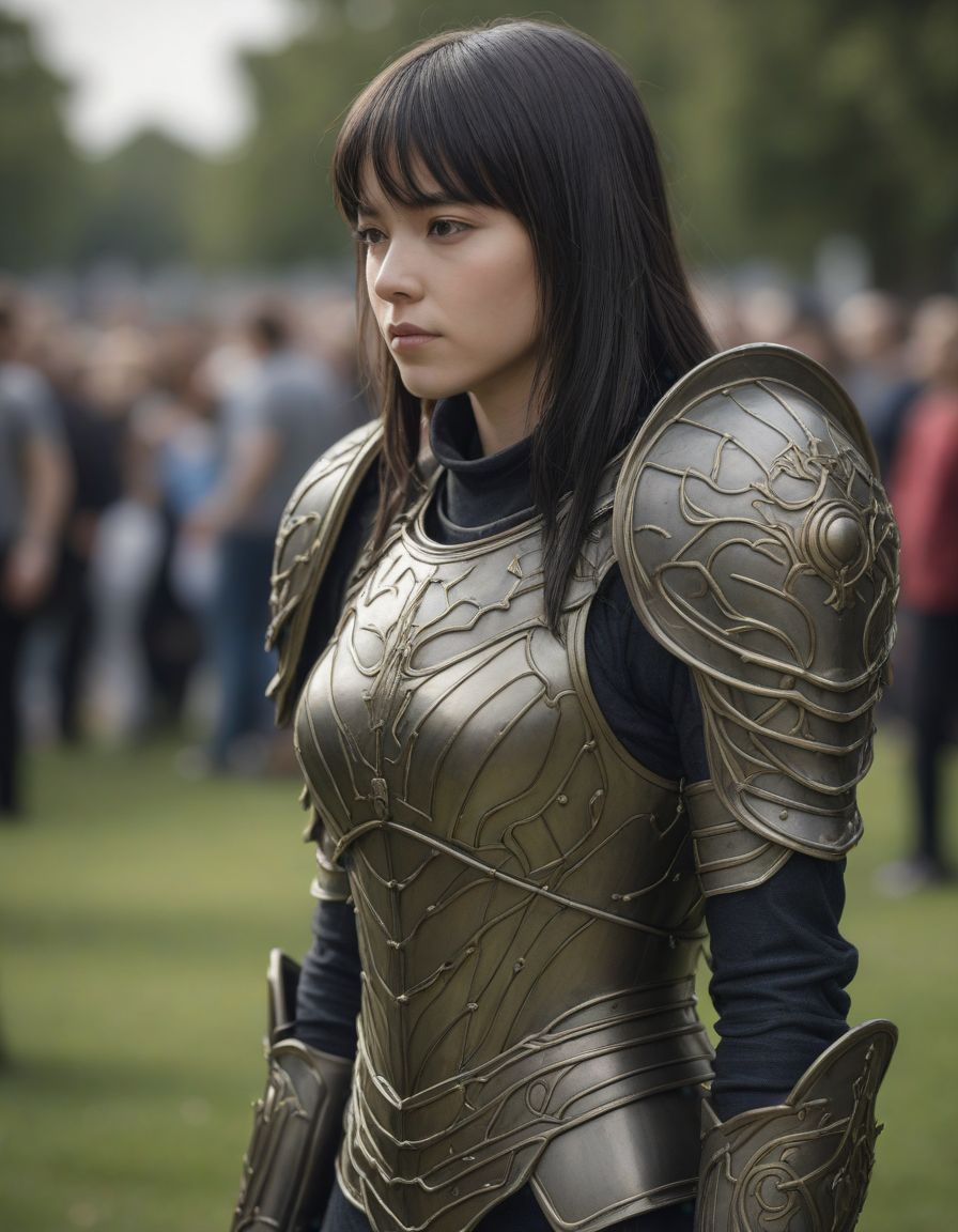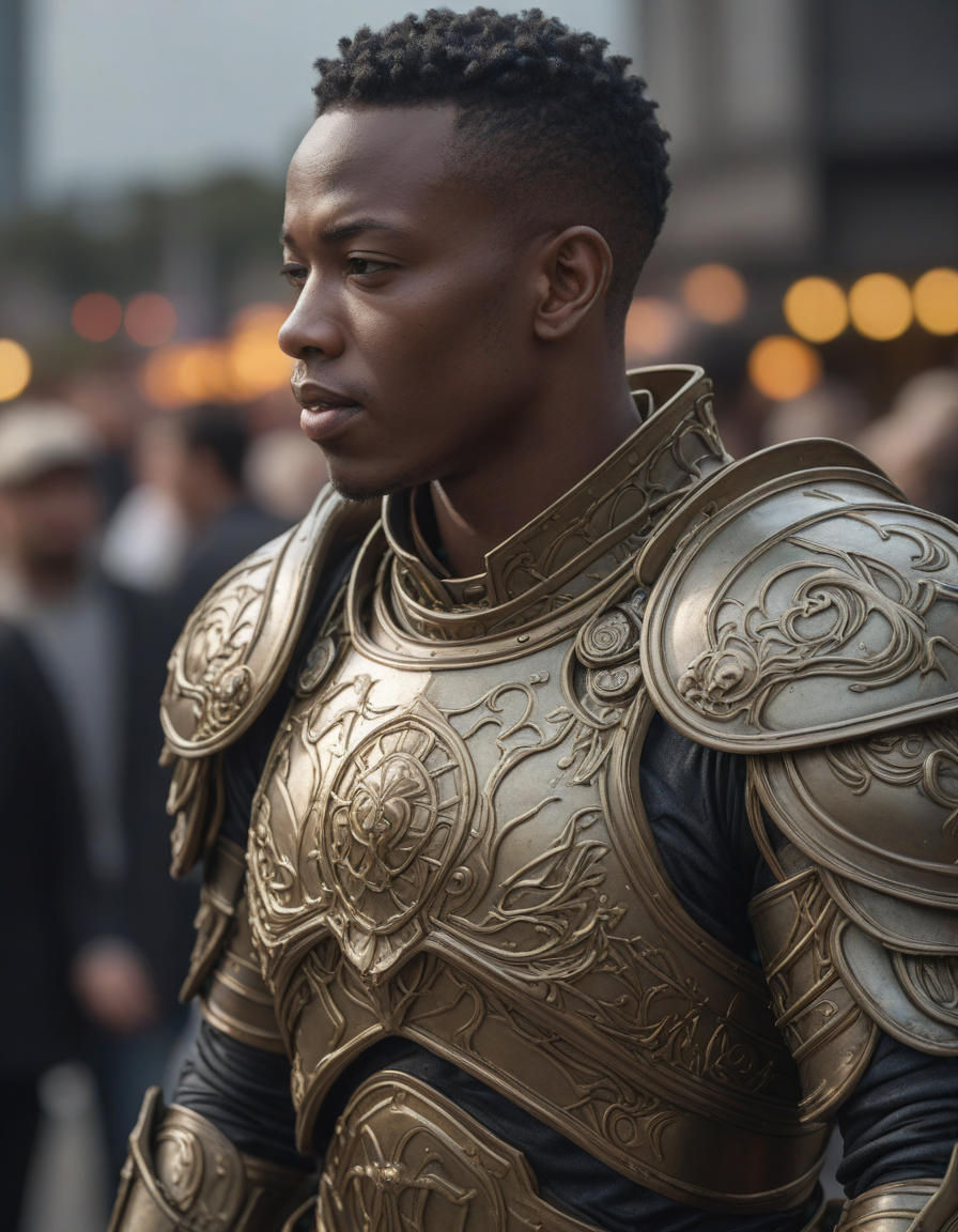 legendary, armor-clad hero, snickering at a shared joke, angelic, well lit, gloomy, downcast face, macro close-up shot, captivating, majestic, crowd of people
