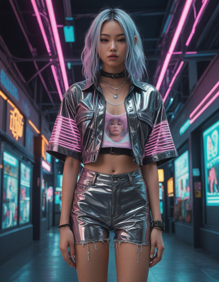 futuristic cyberpunk outfit with glowing accents, highly detailed texture, impressionistic, Visualize a photorealistic portrayal of an 18-year-old high school senior girl, epitomizing the e-girl aesthetic with a blend of internet culture's vibrancy and personal audacity. Clad in an oversized striped shirt under a black graphic t-shirt dress, her style is a testament to e-girl fashion's layered intricacy, complemented by fishnet tights and chunky boots. Her makeup features dramatic winged eyeliner, neon eyeshadow, and dark lipstick, with blush bringing her face to life. Accessories like silver chains and a heart pendant choker, along with pastel or neon hair streaks, enhance her playful rebellion. Standing hands-on-hips, she exudes confidence and individuality against a backdrop suggestive of e-girl life, with neon signs and string lights. This scene captures her bold identity and expressive spirit at this pivotal moment.