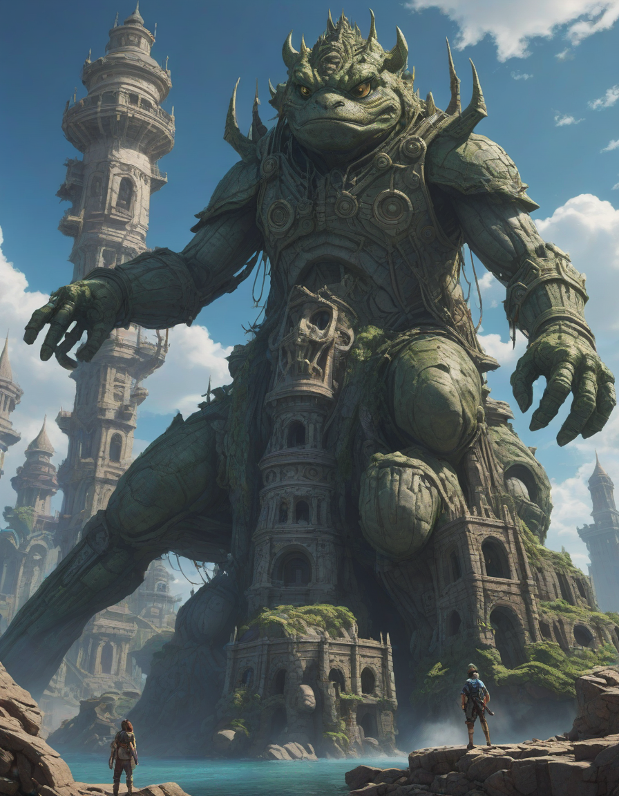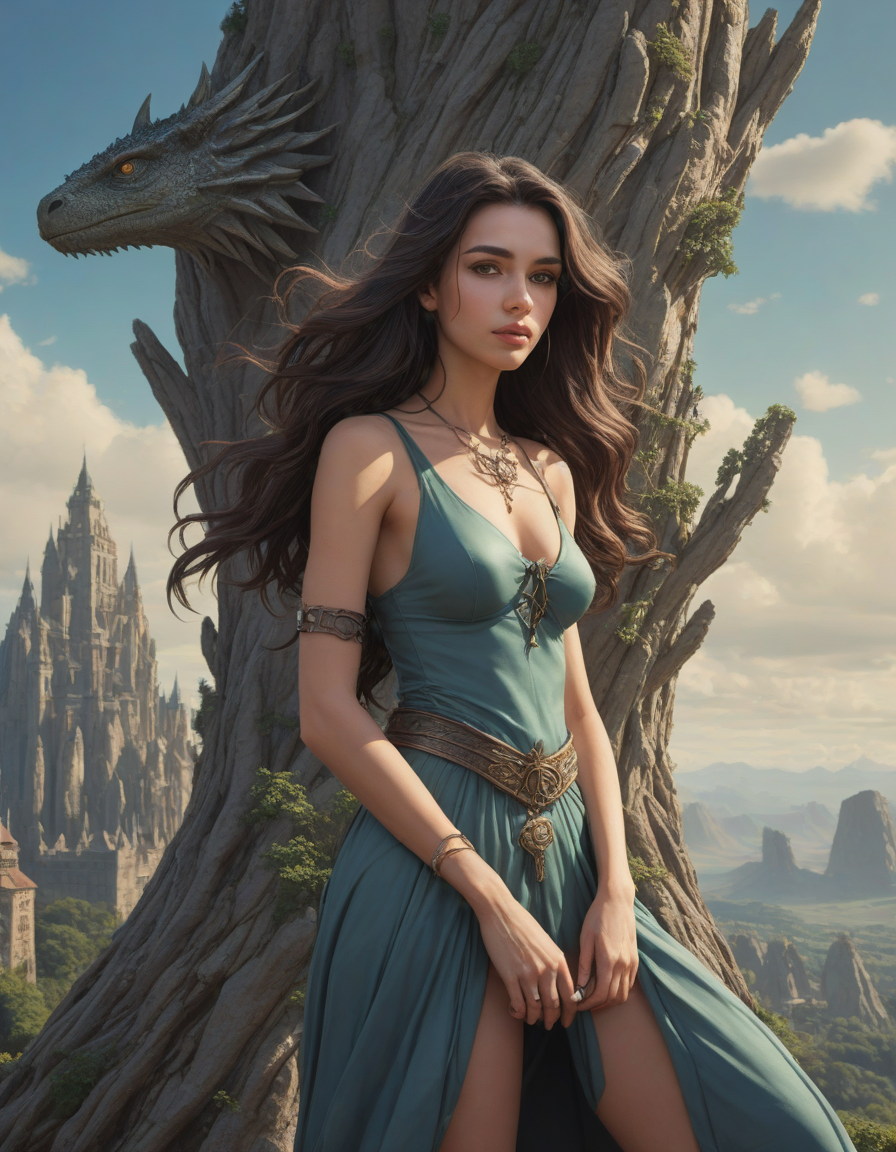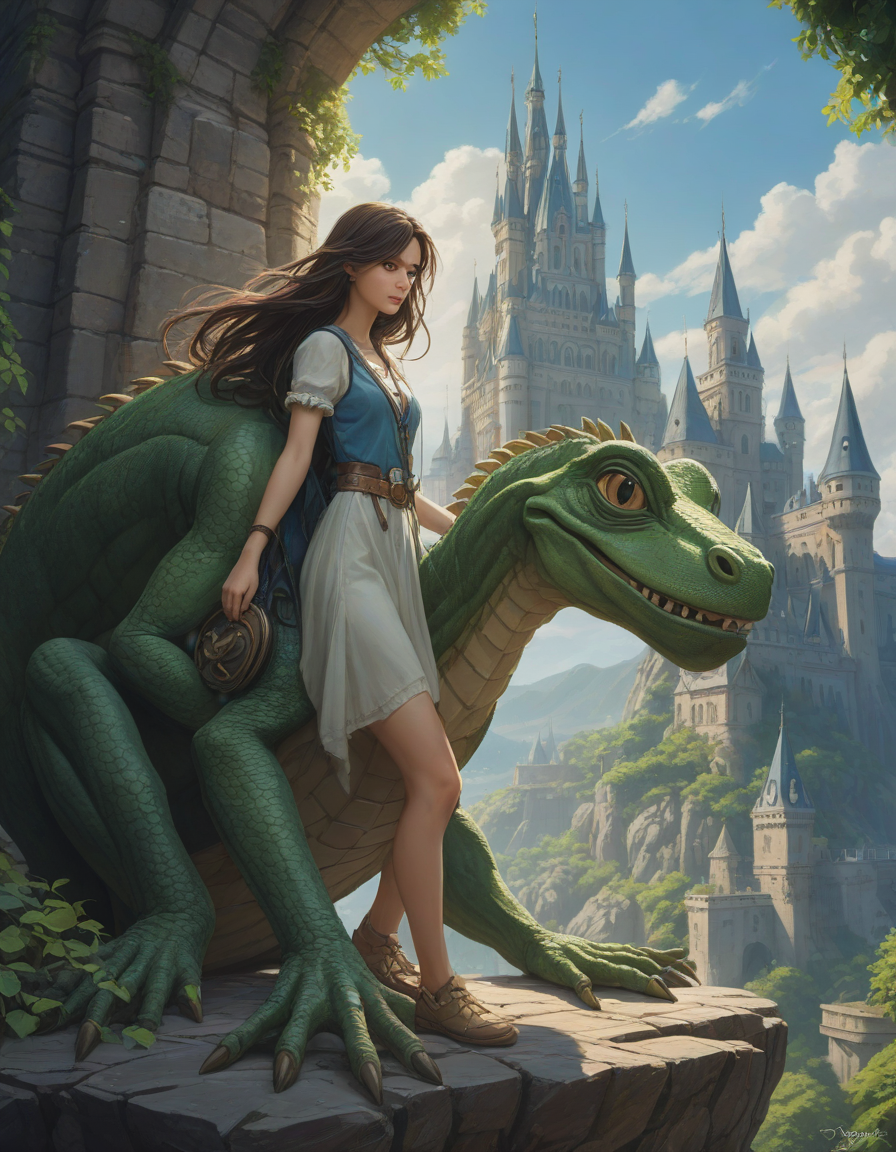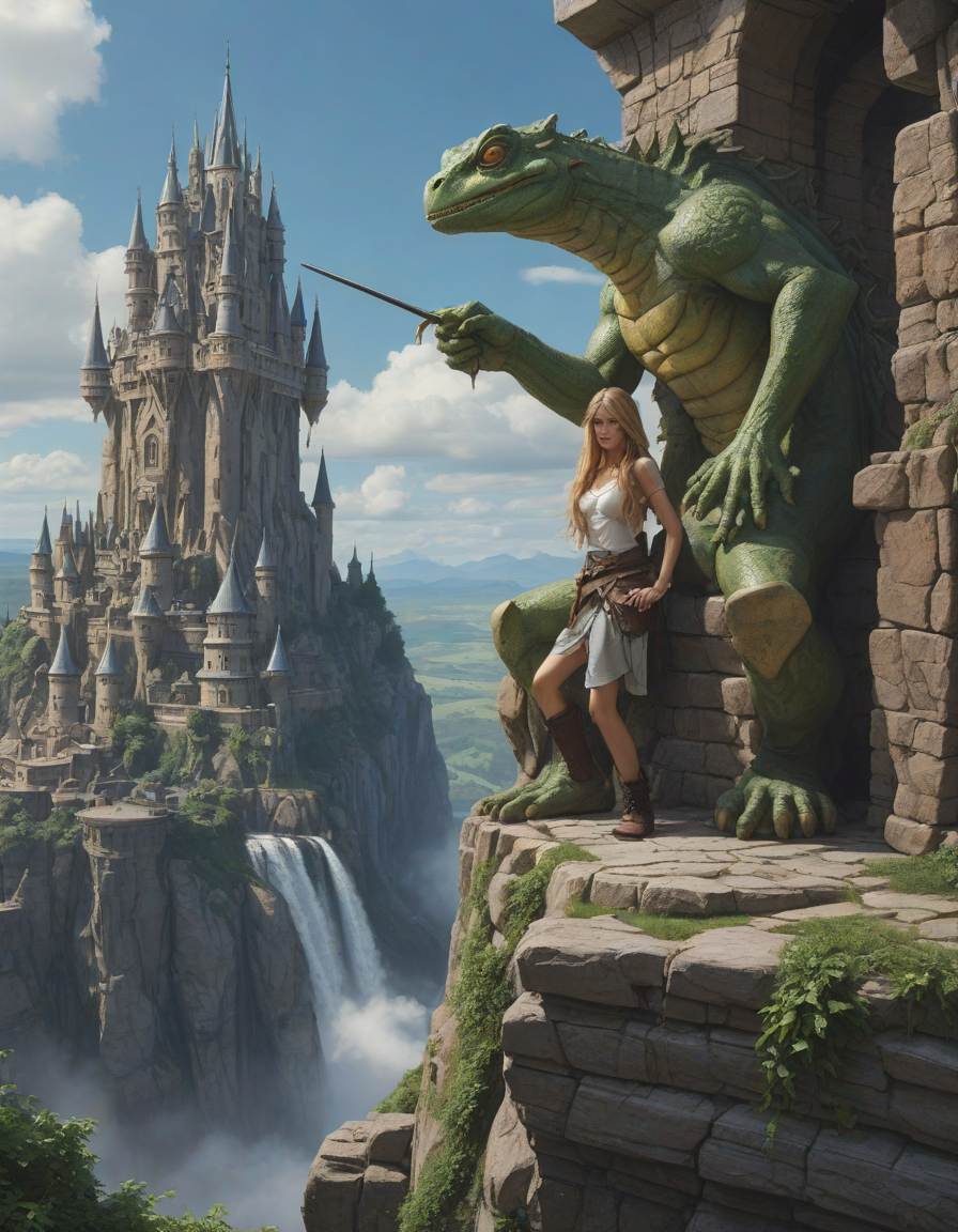 friend hugging, Majestic castle, weilding a one-handed weapon in both hands, one-handed weapon, weapon, , dragon from another world, Gargantuan towers of colossal stones, suspended in mid-air, dryad, endlessly long eyelashes, pepe the frog, brunette, piercing gaze, azure sky, sudden power, very attractive