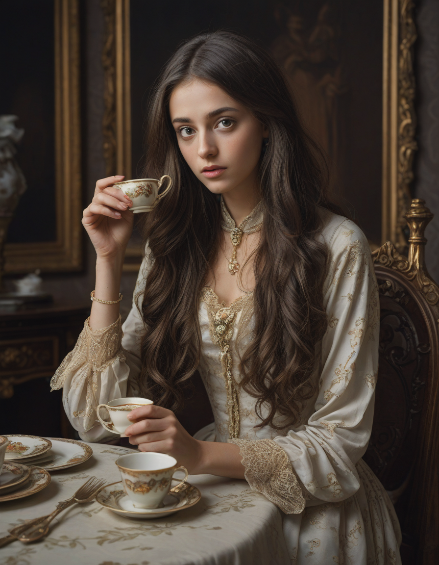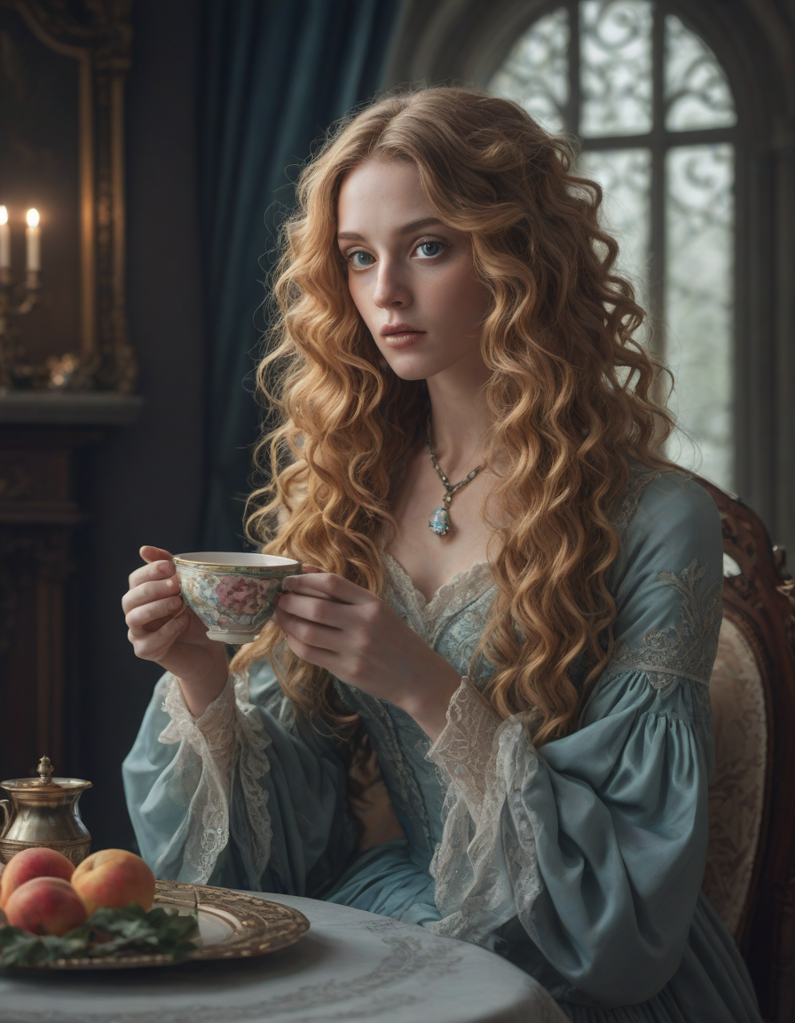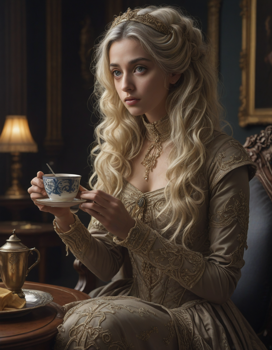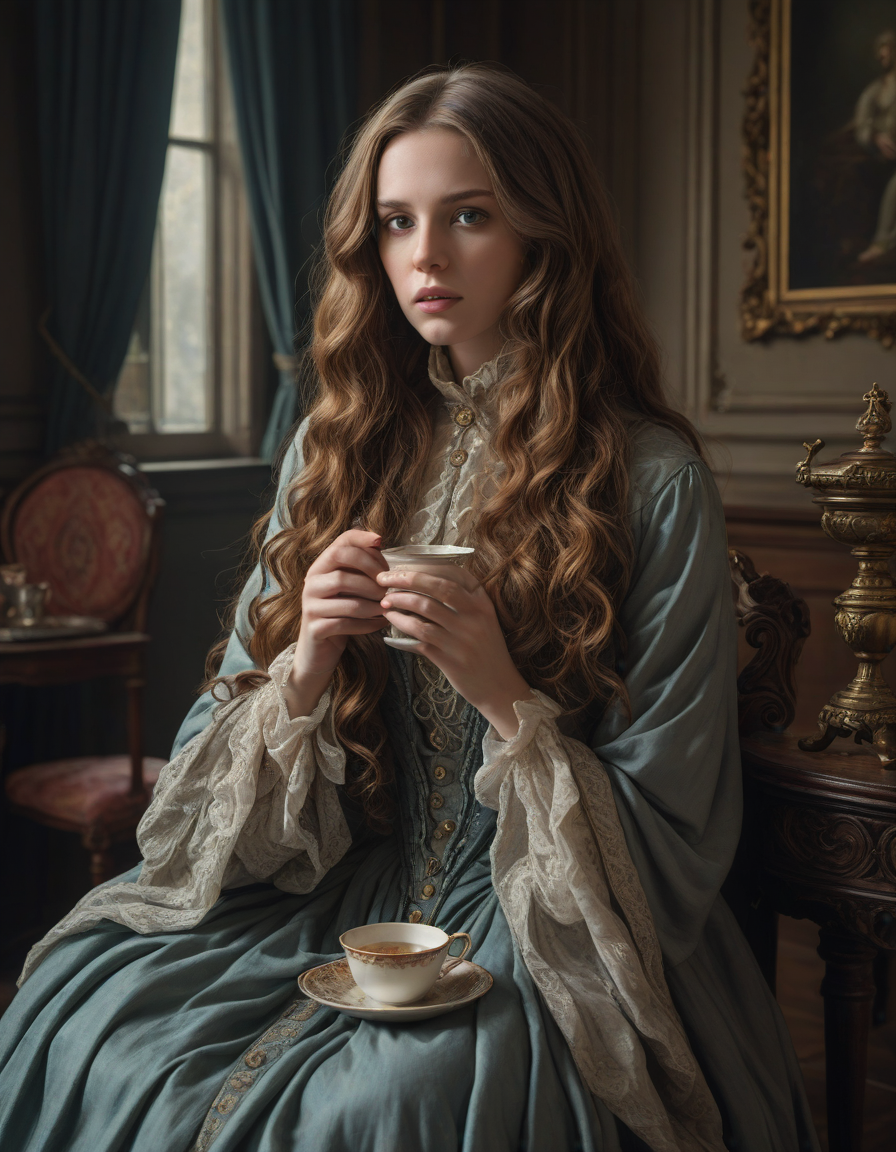 Furrowed concentration, casting a spell, absolutely terrified, victorian aristocrat, sipping tea in a lavishly decorated parlor, luminescent, long, flowing, wavy locks, Cloaked shadow
