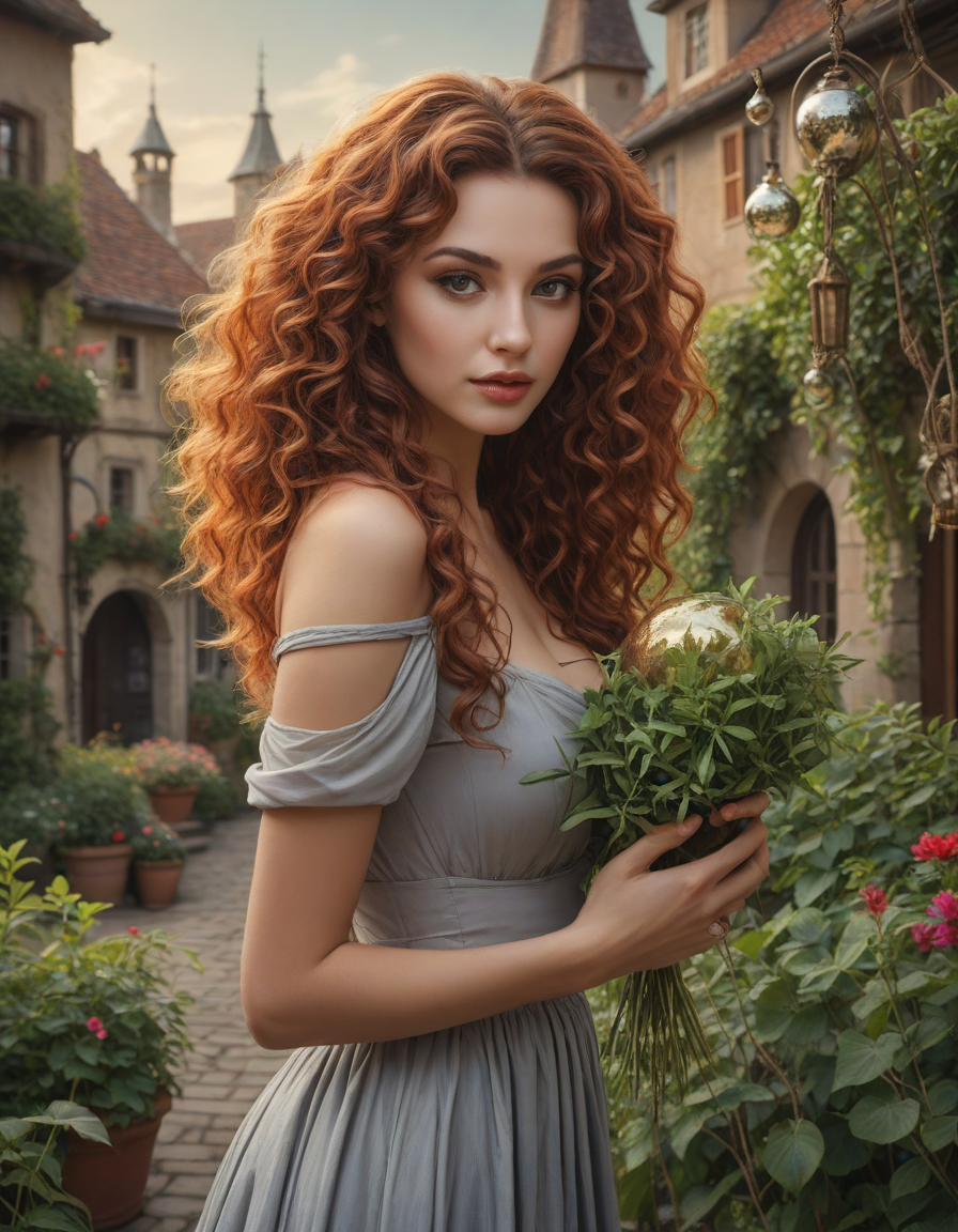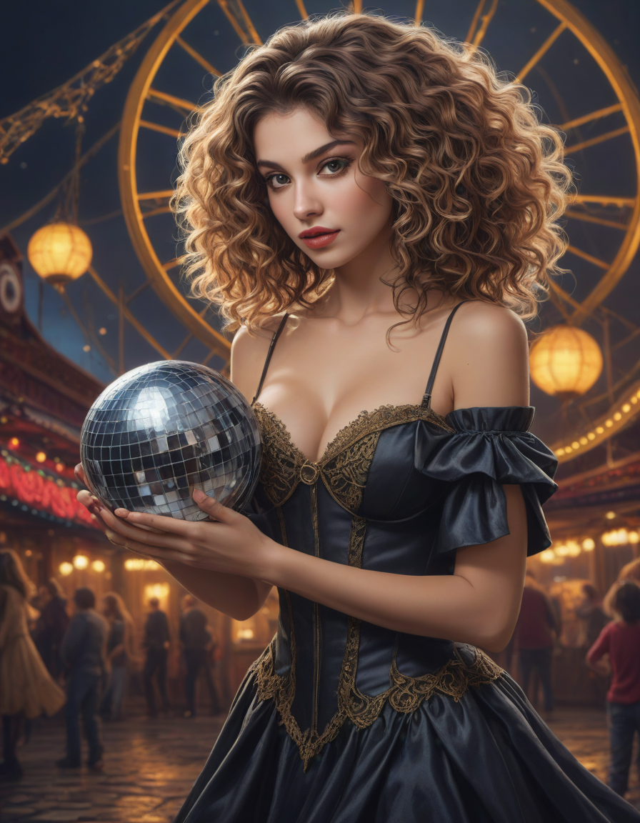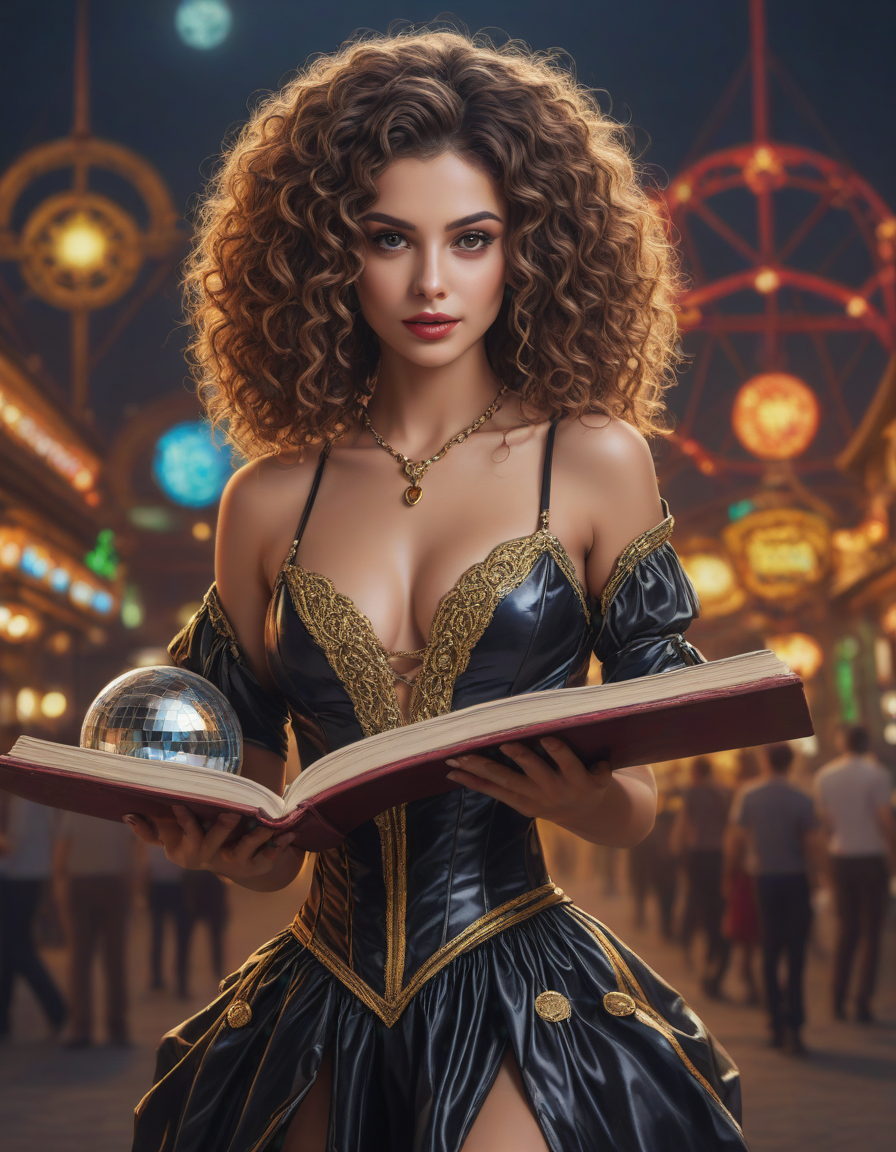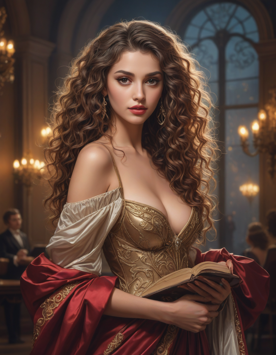 voluminous, curly locks, A painting of splendid beauty, vampire, carrying a large tome, attractive, disco ball evening