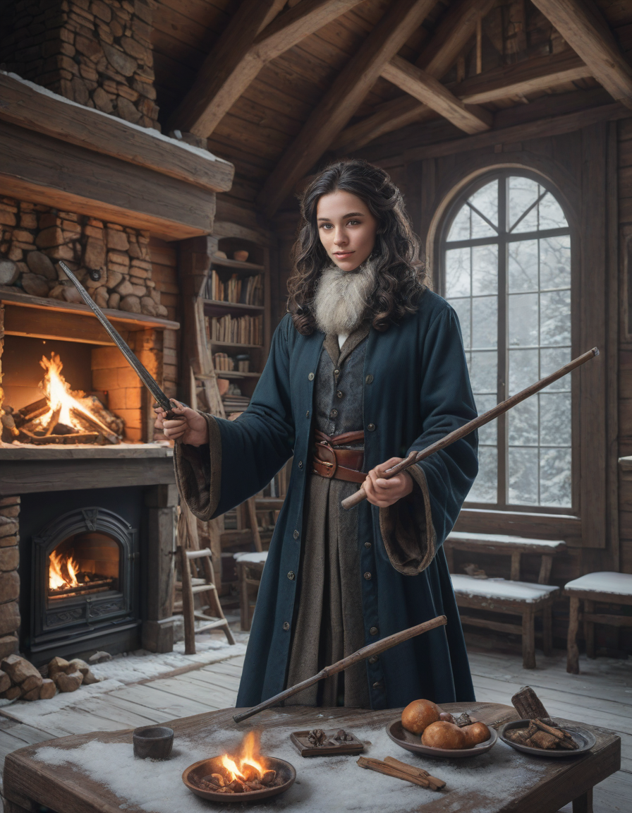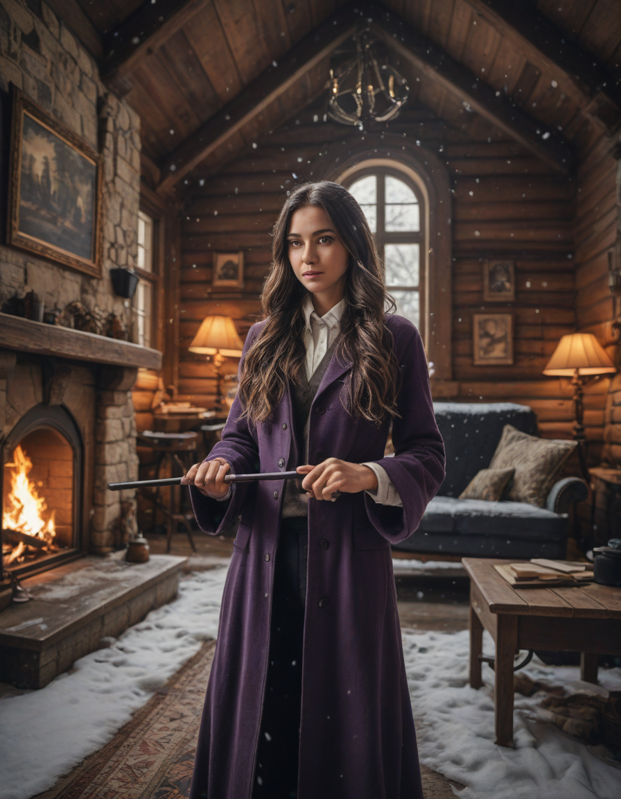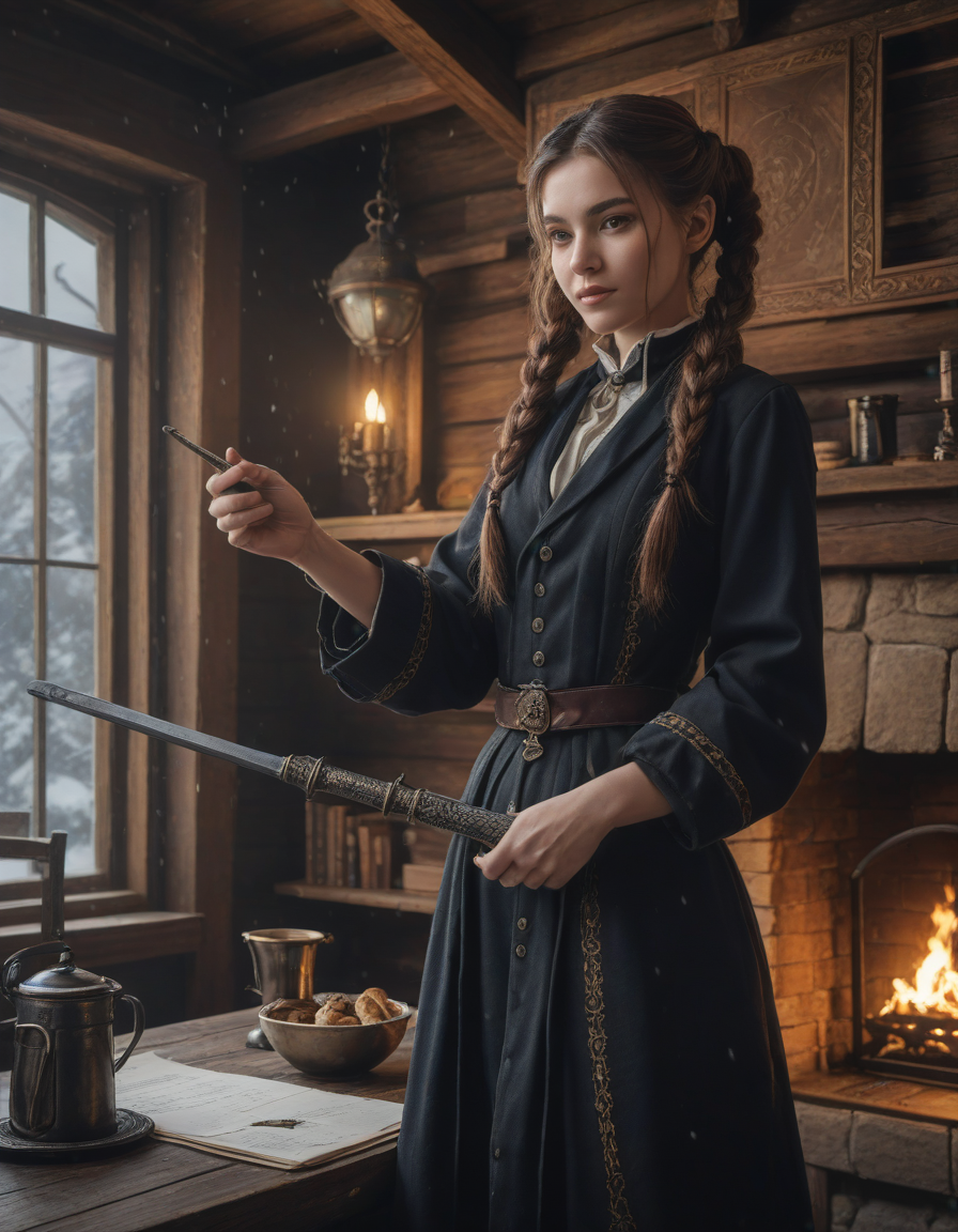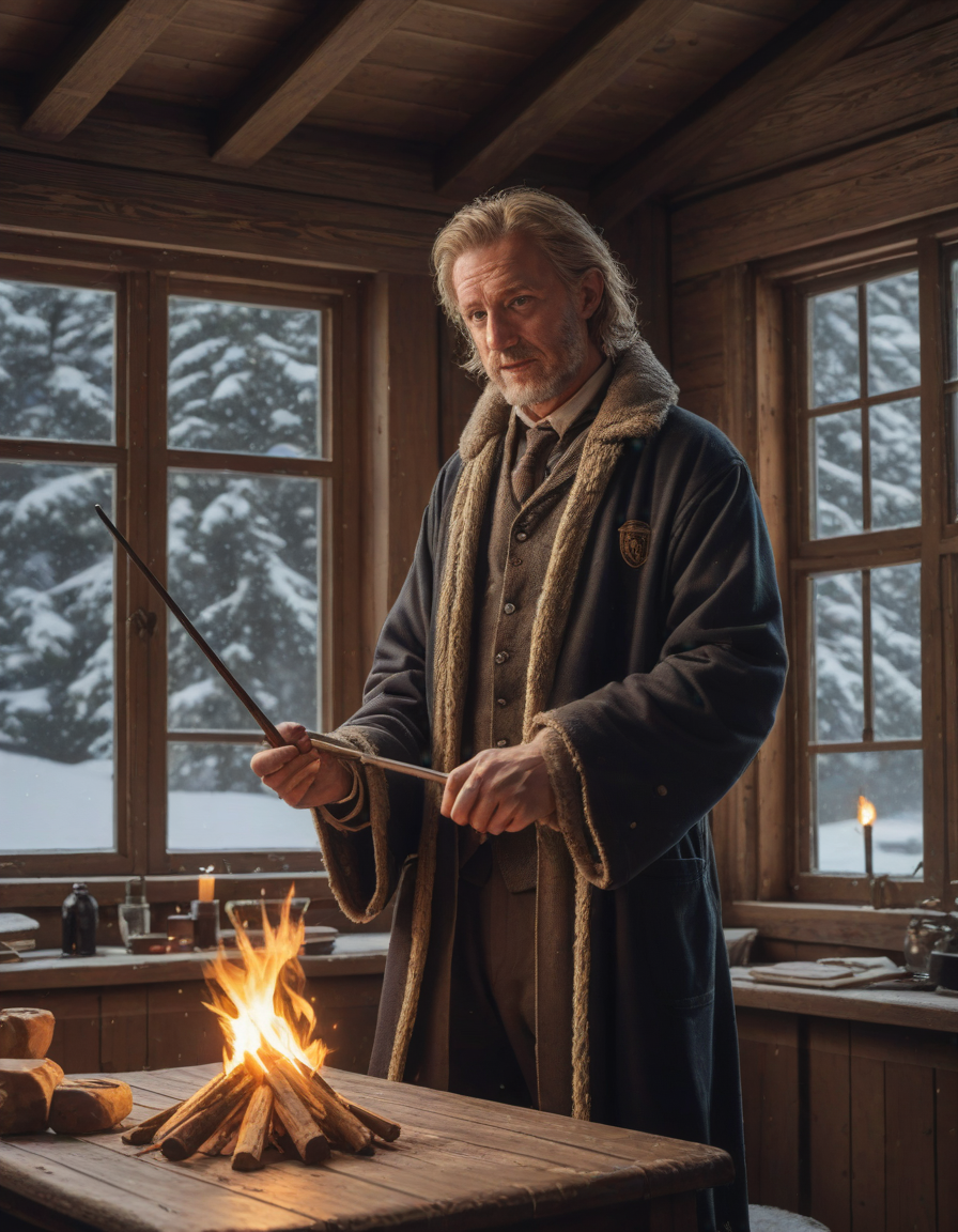 Hogwarts professor, weilding a one-handed weapon in both hands, one-handed weapon, weapon, , photoshopped, cozy in a cabin with a roaring fireplace while it snows outside