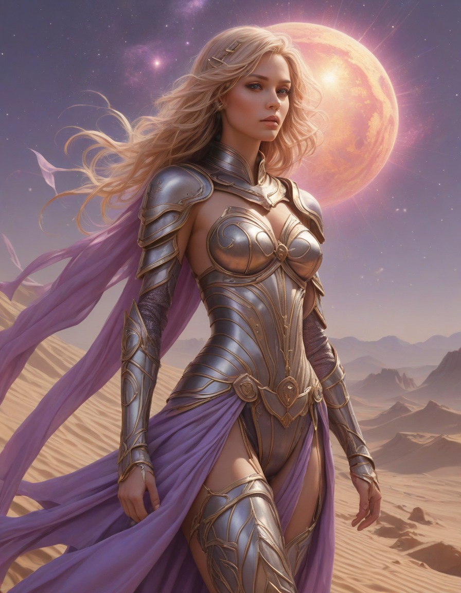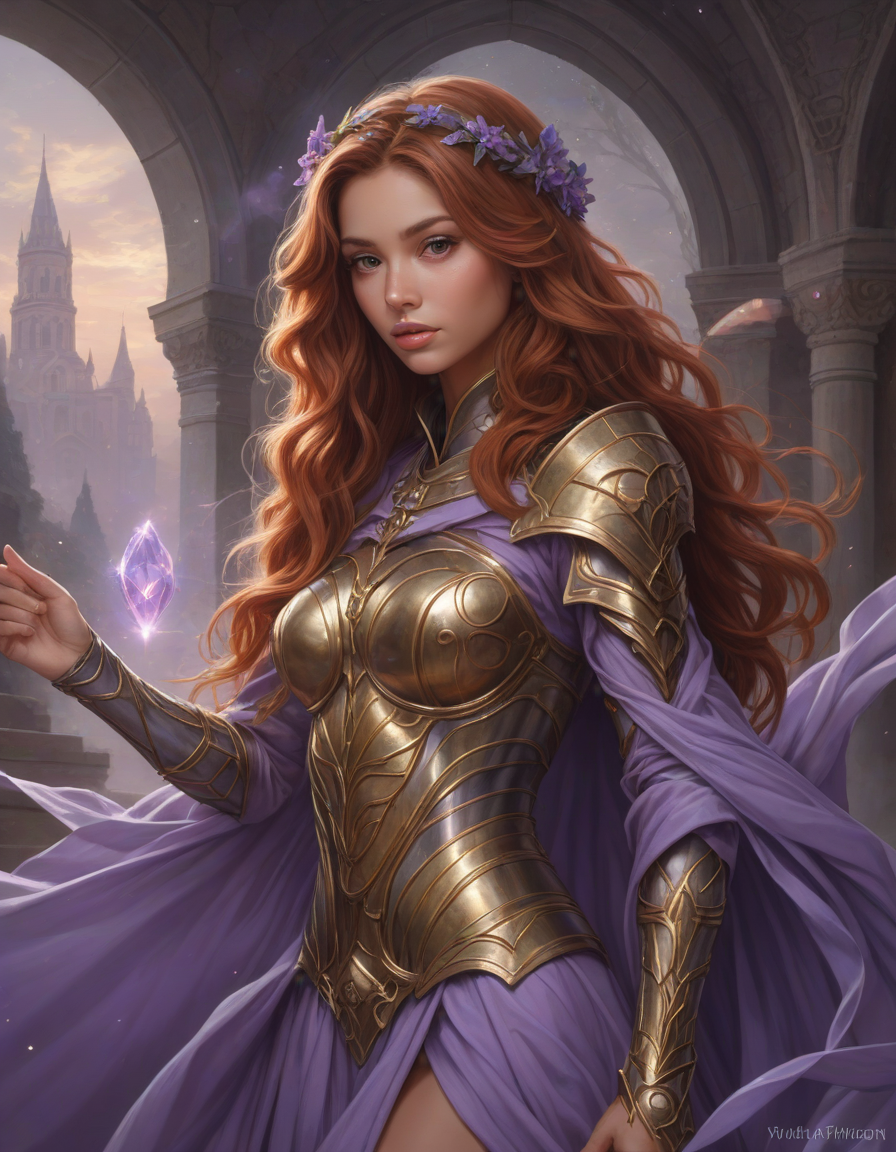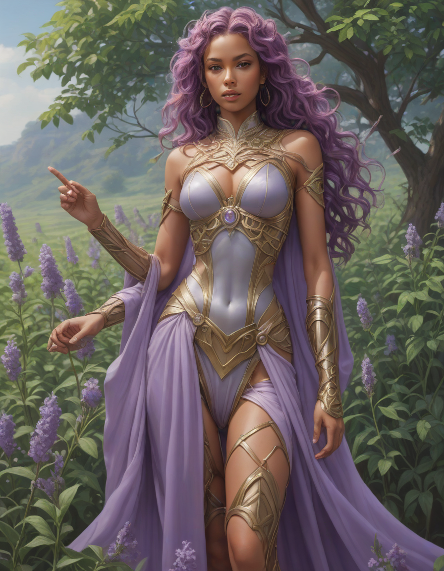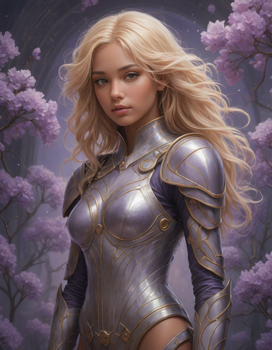 Soft morning, wearing complete set of armor, wearing full armor, Wearing chest armor, wearing leg armor, wearing feet armor, wearing bracer, wearing pauldrons,, digital art breaks through the veil of the natural world, Love, Lavender nebula, art by artgerm and greg rutkowski and alphonse mucha