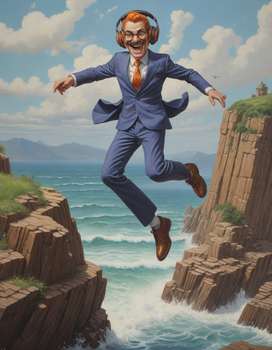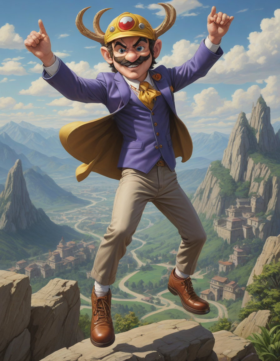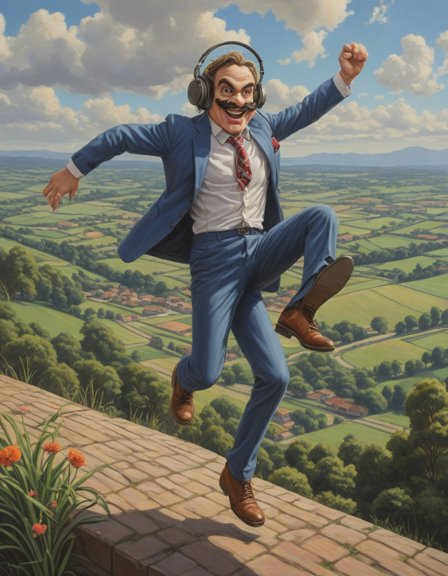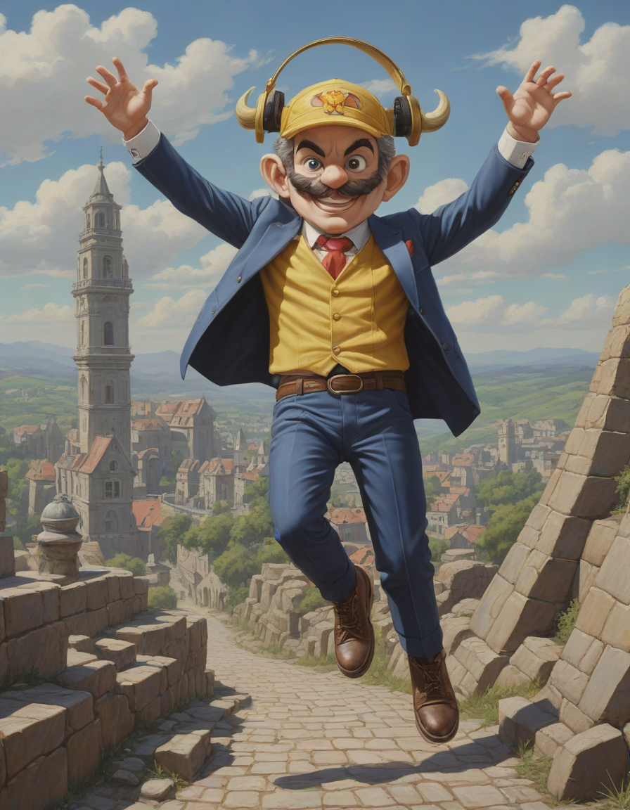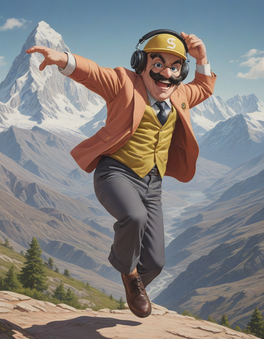 person wearing headphones, wario, classic look, rolling hills, jumping for joy, pincushion distortion, wearing a sharp, tailored suit, A painting of splendid beauty, standing rigidly present, banshee