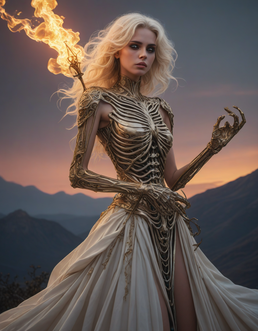 newspaper editorial photography, low poly count, skeleton, Trembling hands clutching a cold metal weapon, lost in a trance, eyes glued to the horizon, Mystical twilight, Glistening skin, Beautiful, evil bride, Velvet hair cascades in buoyant tendrils down delicate shoulders, glinting like spun gold in a chink of sunlight
