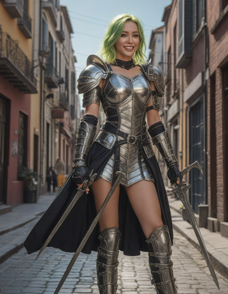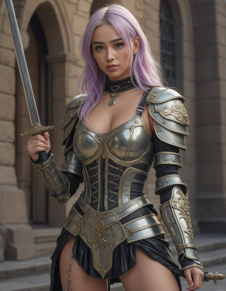laughing, Wide Skirt, wide ballgown hem, a line skirt, petticoat skirt, , Wielding a one-handed weapon in both hands, one-handed weapon, weapon, , Visualize a photorealistic portrayal of an 18-year-old high school senior girl, epitomizing the e-girl aesthetic with a blend of internet culture's vibrancy and personal audacity. Clad in an oversized striped shirt under a black graphic t-shirt dress, her style is a testament to e-girl fashion's layered intricacy, complemented by fishnet tights and chunky boots. Her makeup features dramatic winged eyeliner, neon eyeshadow, and dark lipstick, with blush bringing her face to life. Accessories like silver chains and a heart pendant choker, along with pastel or neon hair streaks, enhance her playful rebellion. Standing hands-on-hips, she exudes confidence and individuality against a backdrop suggestive of e-girl life, with neon signs and string lights. This scene captures her bold identity and expressive spirit at this pivotal moment., wearing complete set of armor, wearing full armor, Wearing chest armor, wearing leg armor, wearing feet armor, wearing bracer, wearing pauldrons,, Holding a sword in both hands in a confident pose, detailed grip, detailed fuller, detailed pommel, detailed blade, detailed edge, , brick wall -> great window view, excessive cleavage, low neckline, revealing chest, revealing cleavage, cleavage-baring, revealing, excessively revealing, very revealing, lowcut, lowrise, , wearing complete set of armor, wearing full armor, Wearing chest armor, wearing leg armor, wearing feet armor, wearing bracer, wearing pauldrons, Wearing helmet, Wearing breastplate, Wearing gauntlets, Wearing greaves, Wearing pauldrons, Wearing vambraces, Wearing cuisses, Wearing sabatons, Wearing gorget, Wearing tassets, Wearing bracers, Wearing cuirass, Wearing faulds, Wearing plackart, Wearing spaulders, Wearing besagews, Lip fillers, thick full lips, enhanced lip volume, accented cupid's bow, Rhinoplasty, refined nose shape, straightened nasal profile, facial symmetry, Botox injections, smoothed facial lines, reduced wrinkles, youthful appearance, Cheek fillers, pronounced cheekbones, sculpted contours, lifted cheeks, brightened eyes, reduced under-eye bags, rejuvenated area, Liposuction contoured shape, reduced excess fat, sculpted physique, Dermal fillers, restored volume, smoothed texture, diminished lines, strengthened definition, balanced proportions, enhanced jawline, Facelift, tightened skin, reduced sagging, improved skin tone, reduced imperfections, enhanced clarity, Blepharoplasty, Reduced puffiness, restored youthful eye contour, Enhanced chin shape, improves facial harmony, strengthened jawline definition, symmetry facial features, golden_ratio