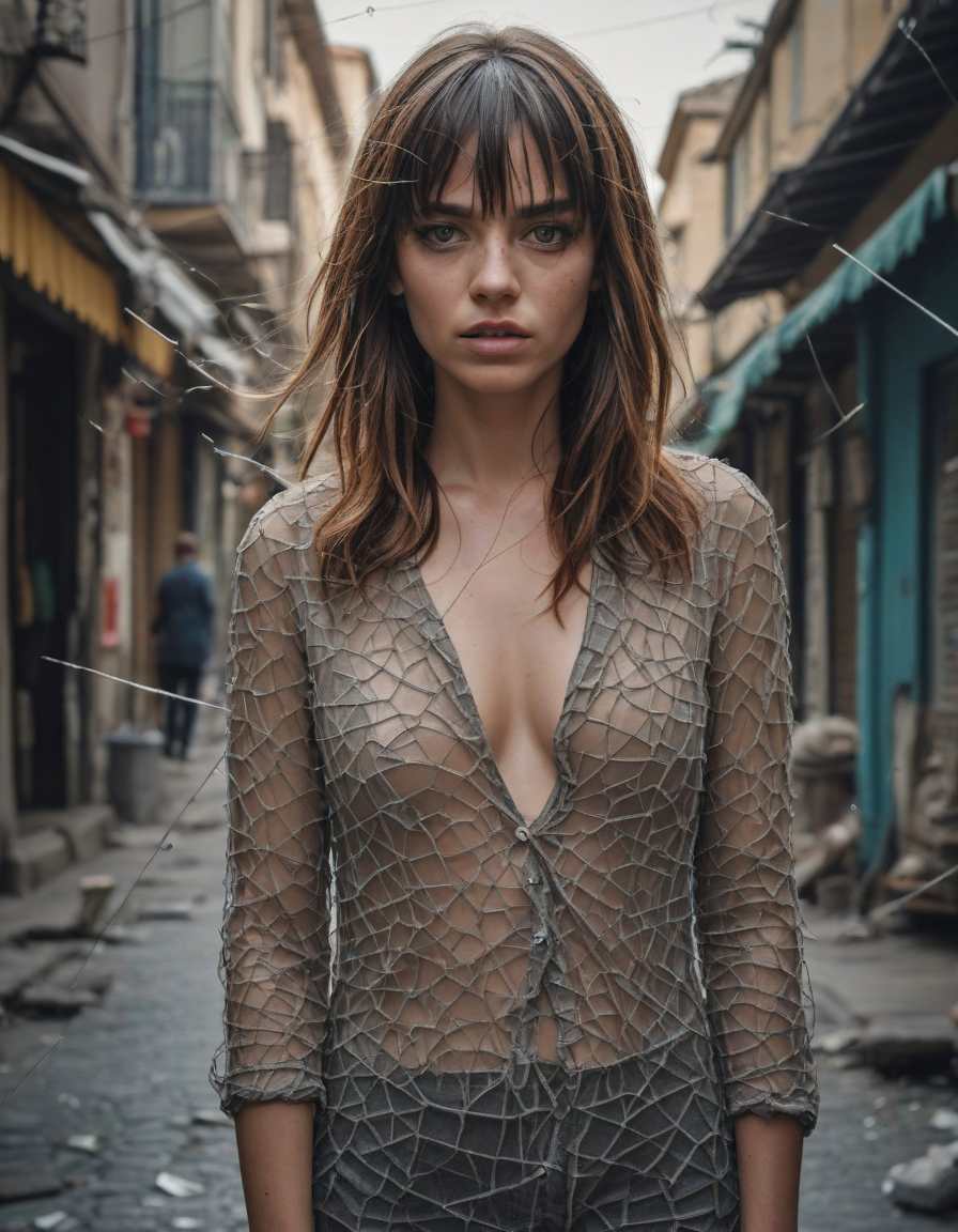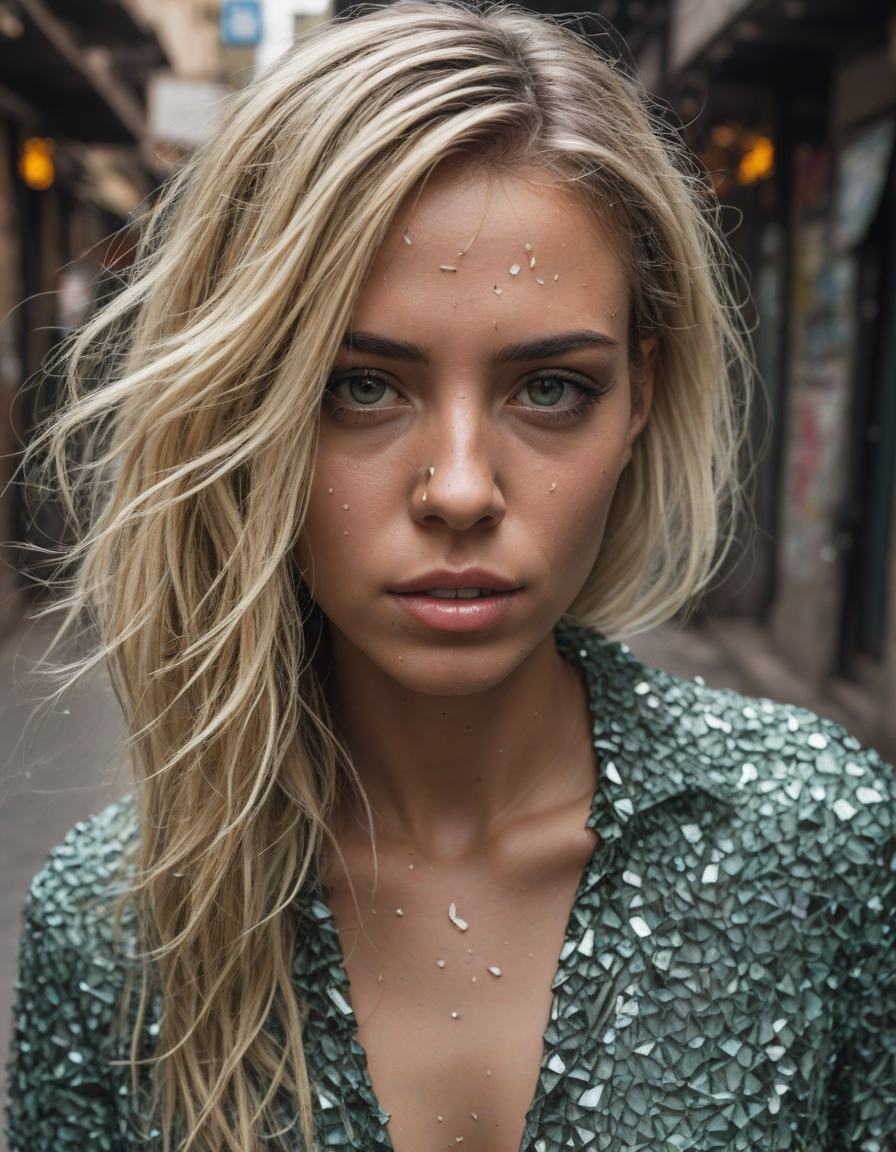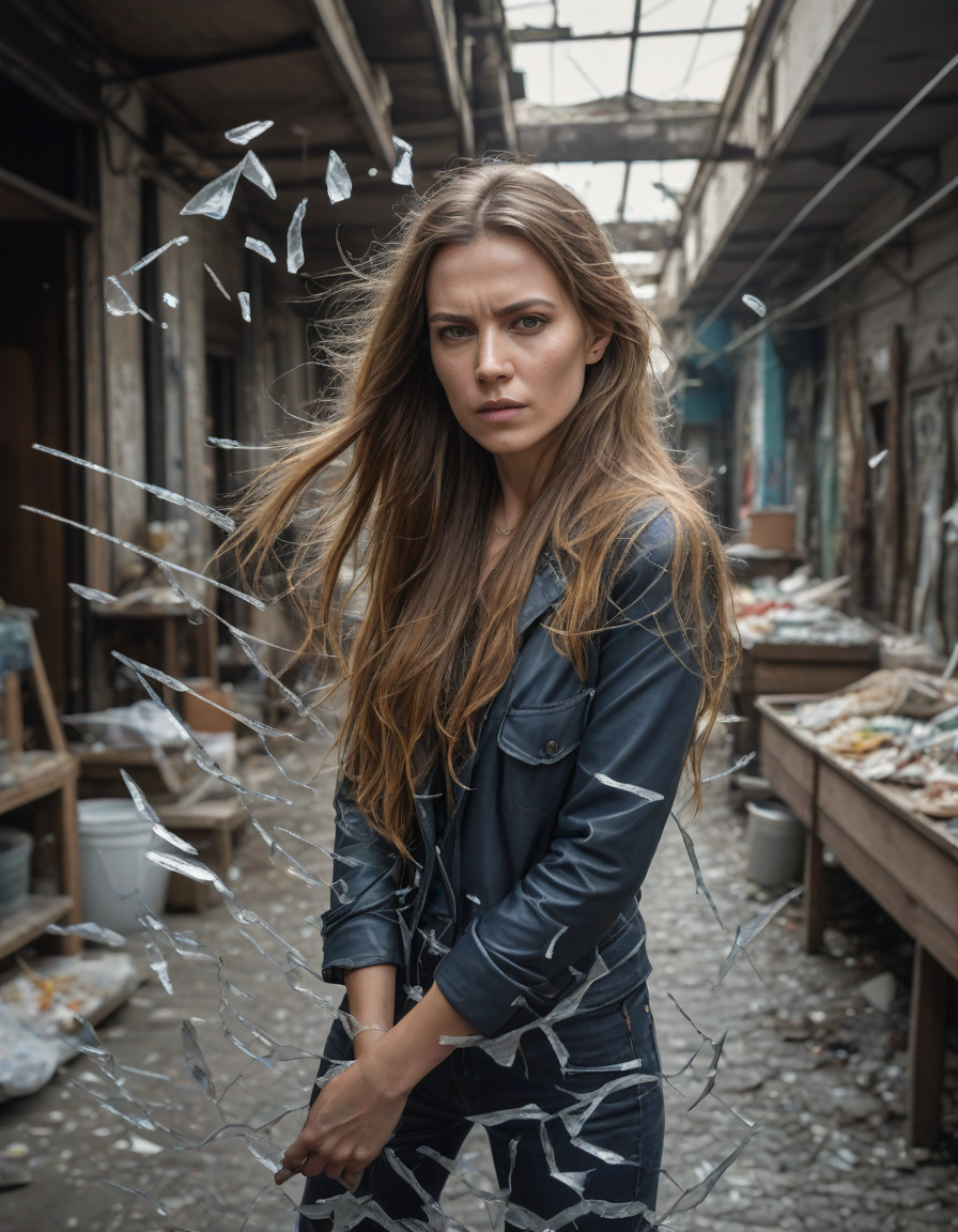shattered glass, strolling through a bazaar, stylish photoshoot, Unhinged, extreme pain