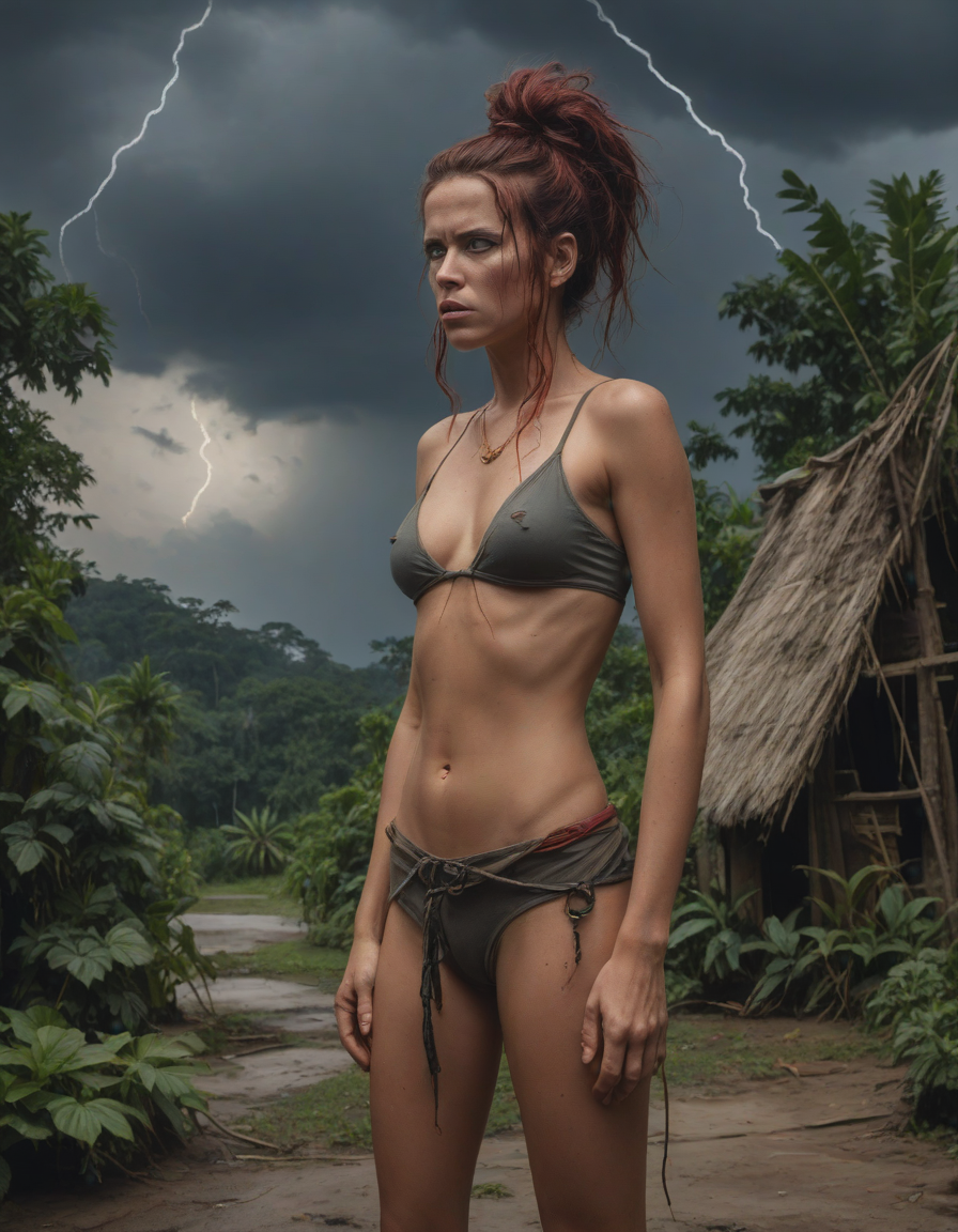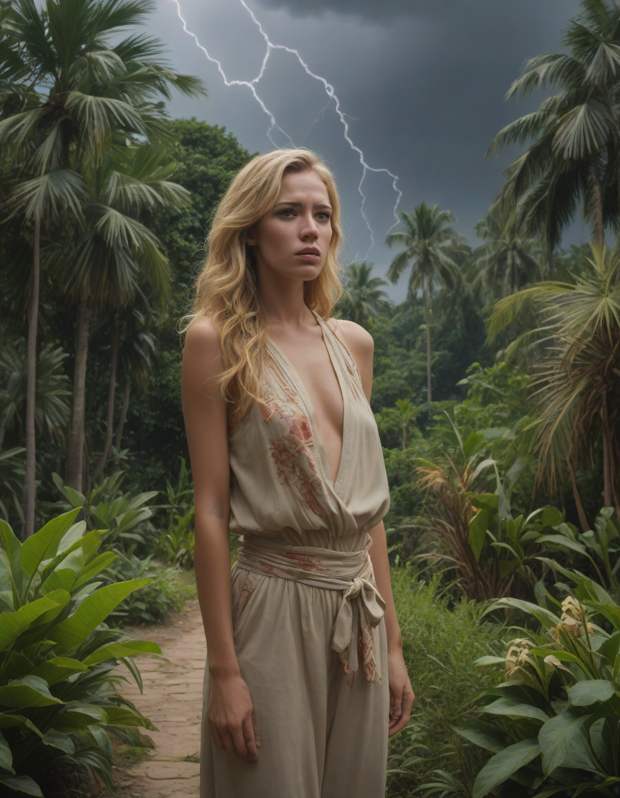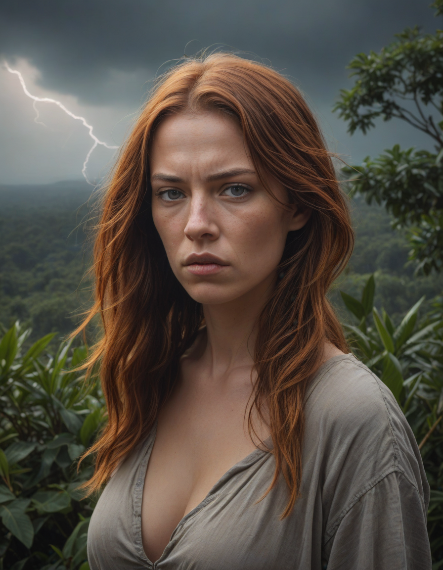 appalled, Glorious, sizzling with raw energy, Lightning strikes in the distance, Oasis in the Amazon, lips pursed in determination