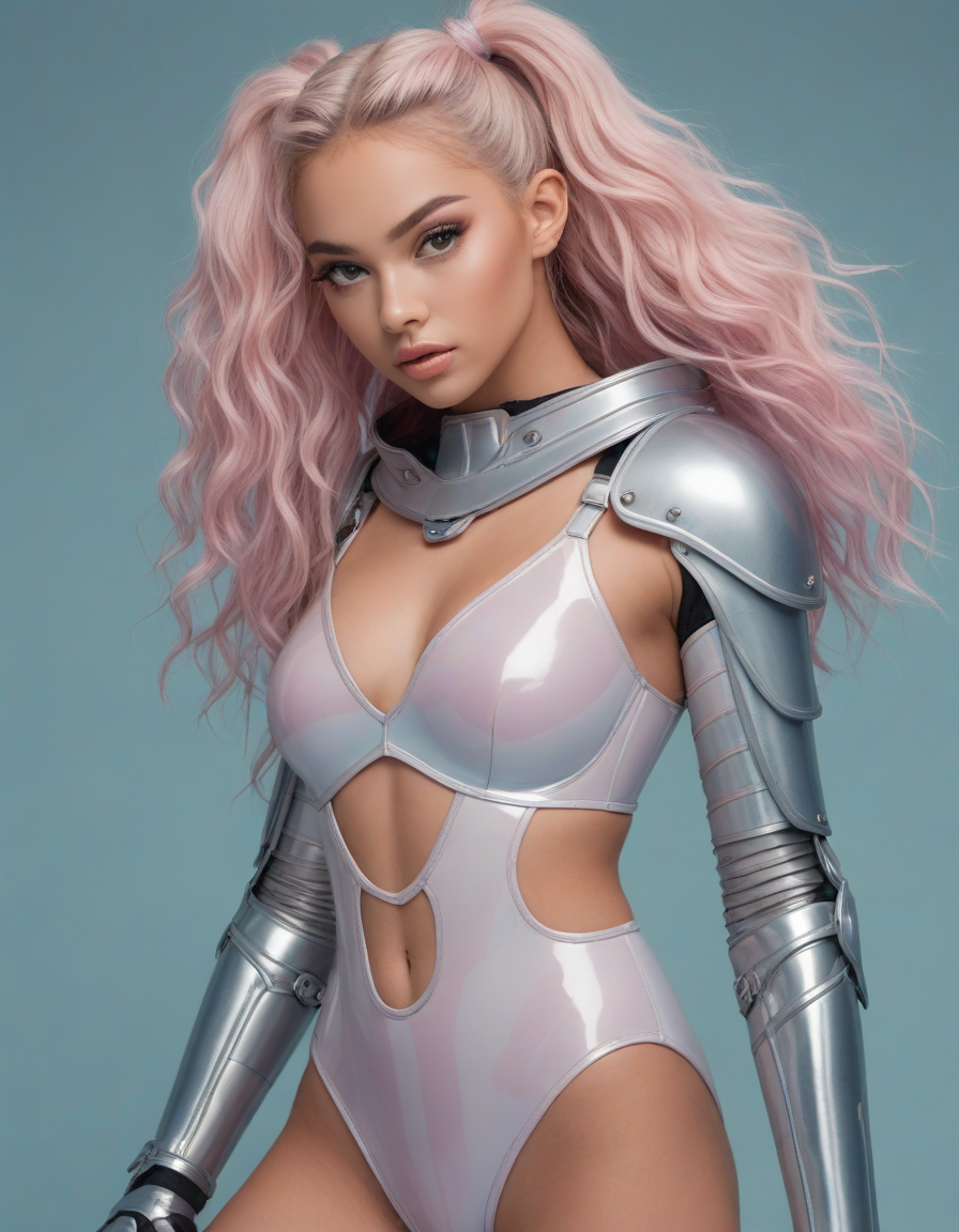 This visualization retains the essence of our previous description, now enhanced by a pose that speaks volumes of her confidence and the vibrant spirit of the e-girl aesthetic. It captures not just the photorealistic image of a young woman in the throes of digital age culture but also the bold statement of identity and self-expression that defines her at this significant moment in her life., Wielding a one-handed weapon in both hands, one-handed weapon, weapon, , oval face shape, almond-shaped eyes, voluminous lashes, slightly arched eyebrows, narrow nasal bridge, rounded nose tip, symmetrical nostrils, full lips, pronounced cupid's bow, slightly fuller lower lip, defined cheekbones, rounded chin, smooth complexion, softly contoured jawline, balanced facial proportions, symmetrical features, gently curved eyelids, soft brow ridge, harmonious cheek to jawline transition, subtle philtrum, delicate ear lobes, straight blonde hair, clear skin, hooded eyelids, light pink lip color, slightly pouty expression, casual pose with hand on face, slight head tilt, indoor lighting, Light blue irises, Medium-thickness eyebrows, Softly angled eyebrows, A hint of freckles across the nose and cheeks, Natural makeup, Gentle frown lines between the eyebrows, Soft nasolabial folds, Smooth forehead, Subtle dimple on the chin, Clear facial contour without distinct shadows, Even skin tone with a hint of natural pink undertones, Slightly rosy cheeks, Tapered jawline, Fine hair texture with gentle waves, Youthful appearance with soft facial features, wearing complete set of armor, wearing full armor, Wearing chest armor, wearing leg armor, wearing feet armor, wearing bracer, wearing pauldrons,, excessive cleavage, low neckline, revealing chest, revealing cleavage, cleavage-baring, revealing, excessively revealing, very revealing, lowcut, lowrise,
