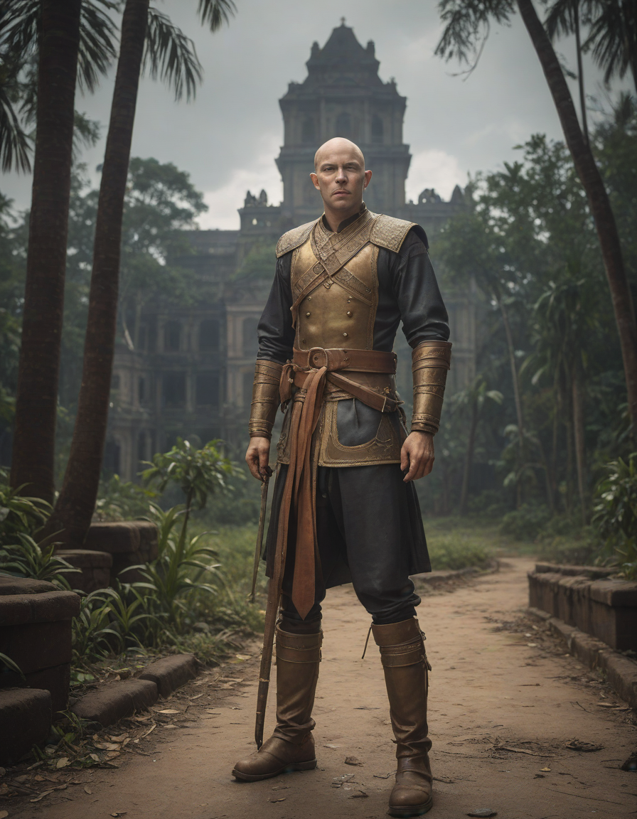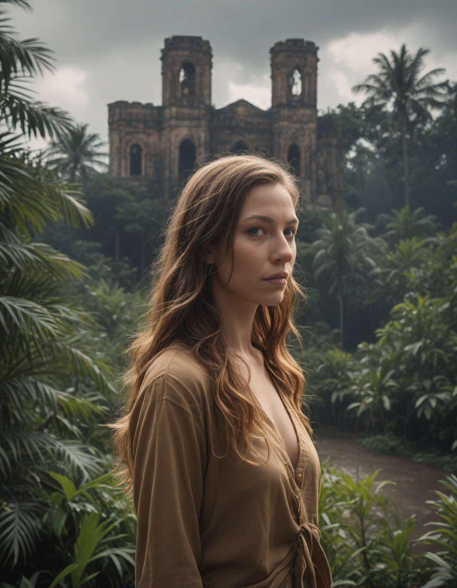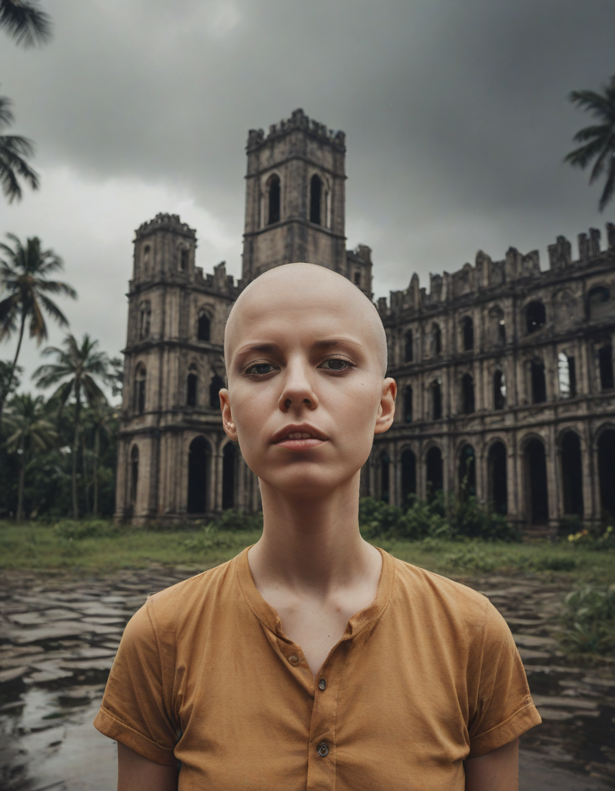 Oasis in the Amazon, Blinding sunlight, excited, very bald, Old abbey on fire during dramatic rainstorm