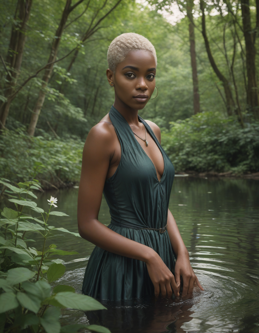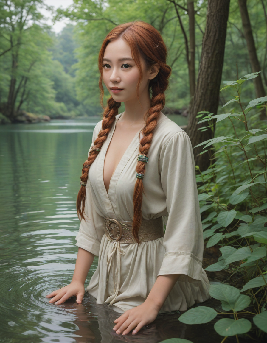 overgown foliage, well lit, attention-stealing, naiad, tranquil lake, Heart racing before the big jump, Raising a glass of bubbling elixir, cat