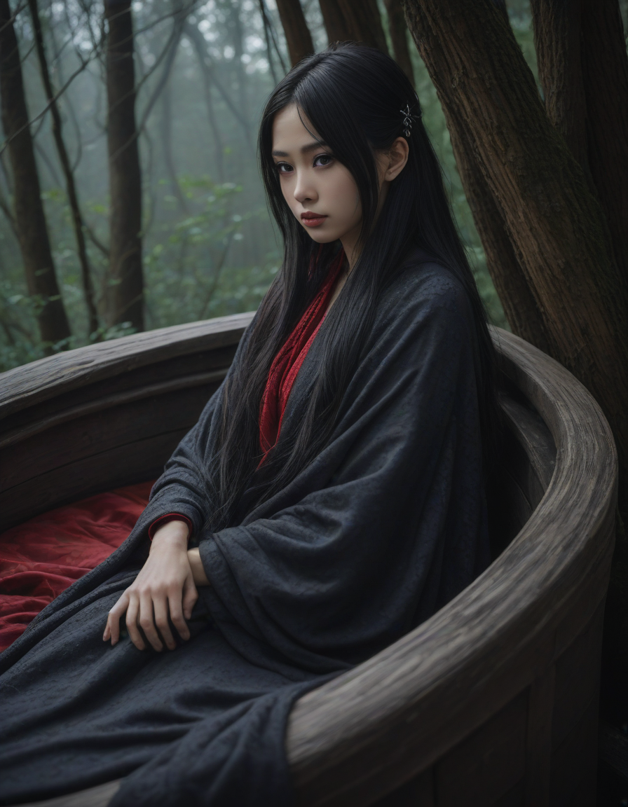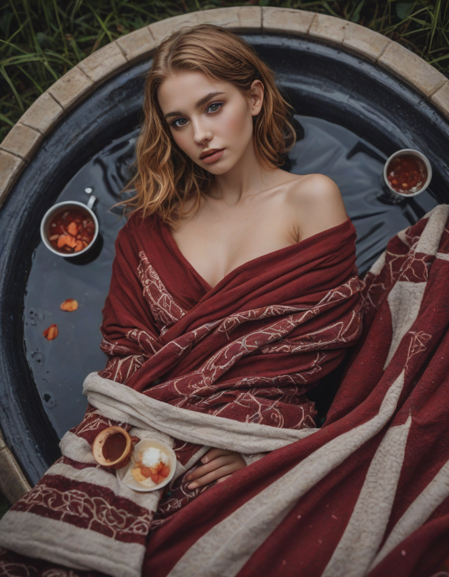 comfy blanket wrapped tight, Enigmatic, crimson-flecked eyes, Gothic jacuzzi paradise, in love