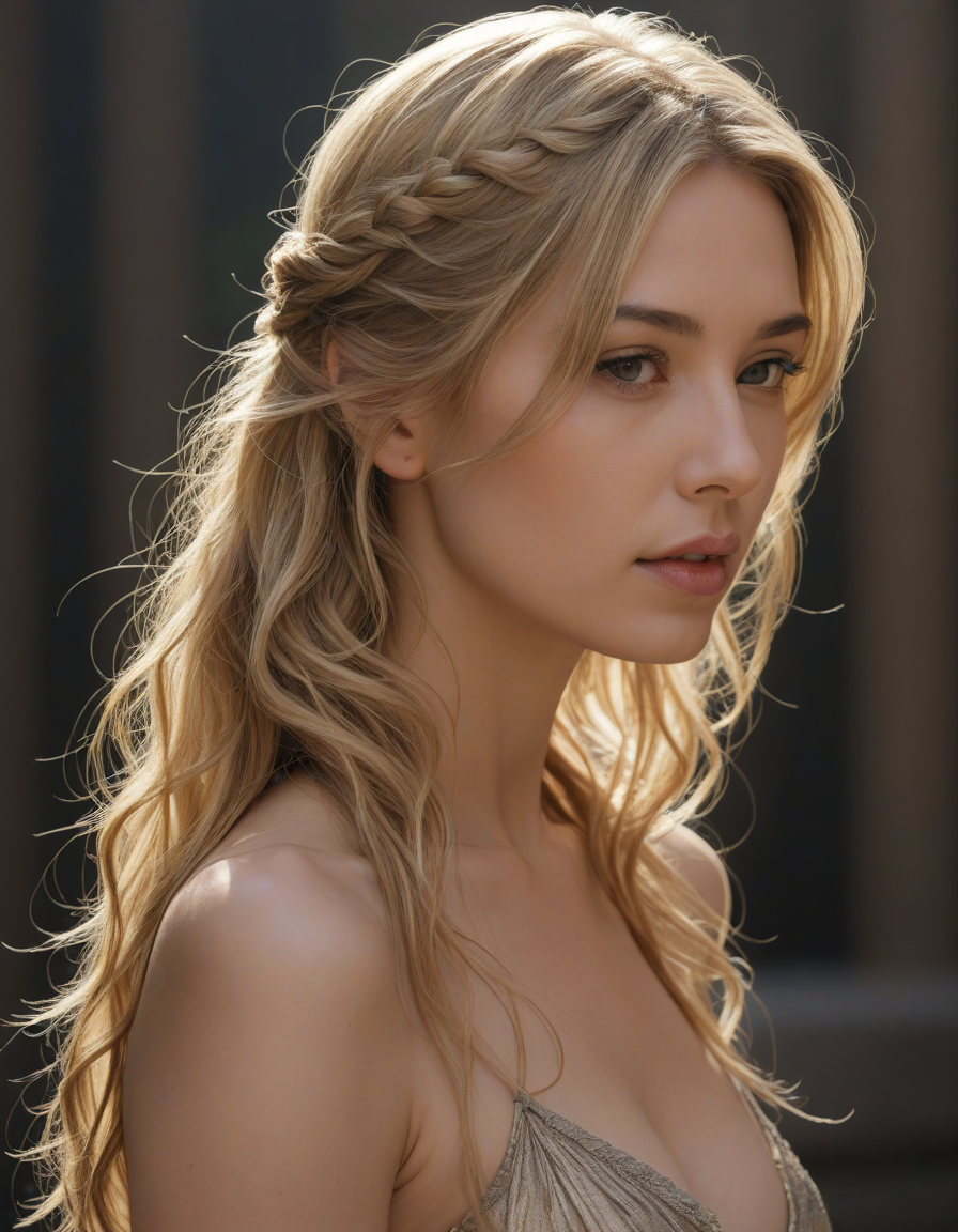 serenity film still, sexy, Velvet hair cascades in buoyant tendrils down delicate shoulders, glinting like spun gold in a chink of sunlight, wrinkled forehead