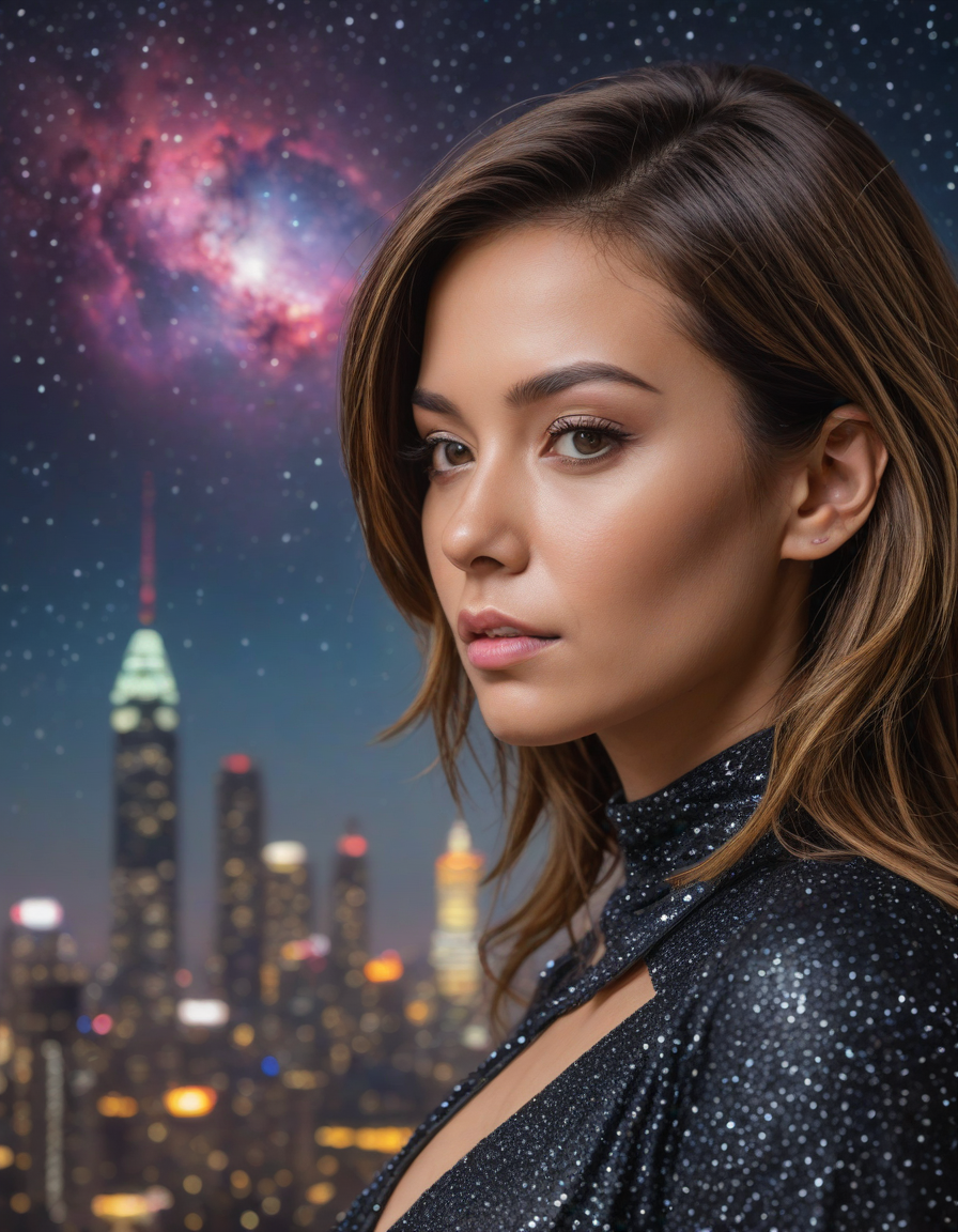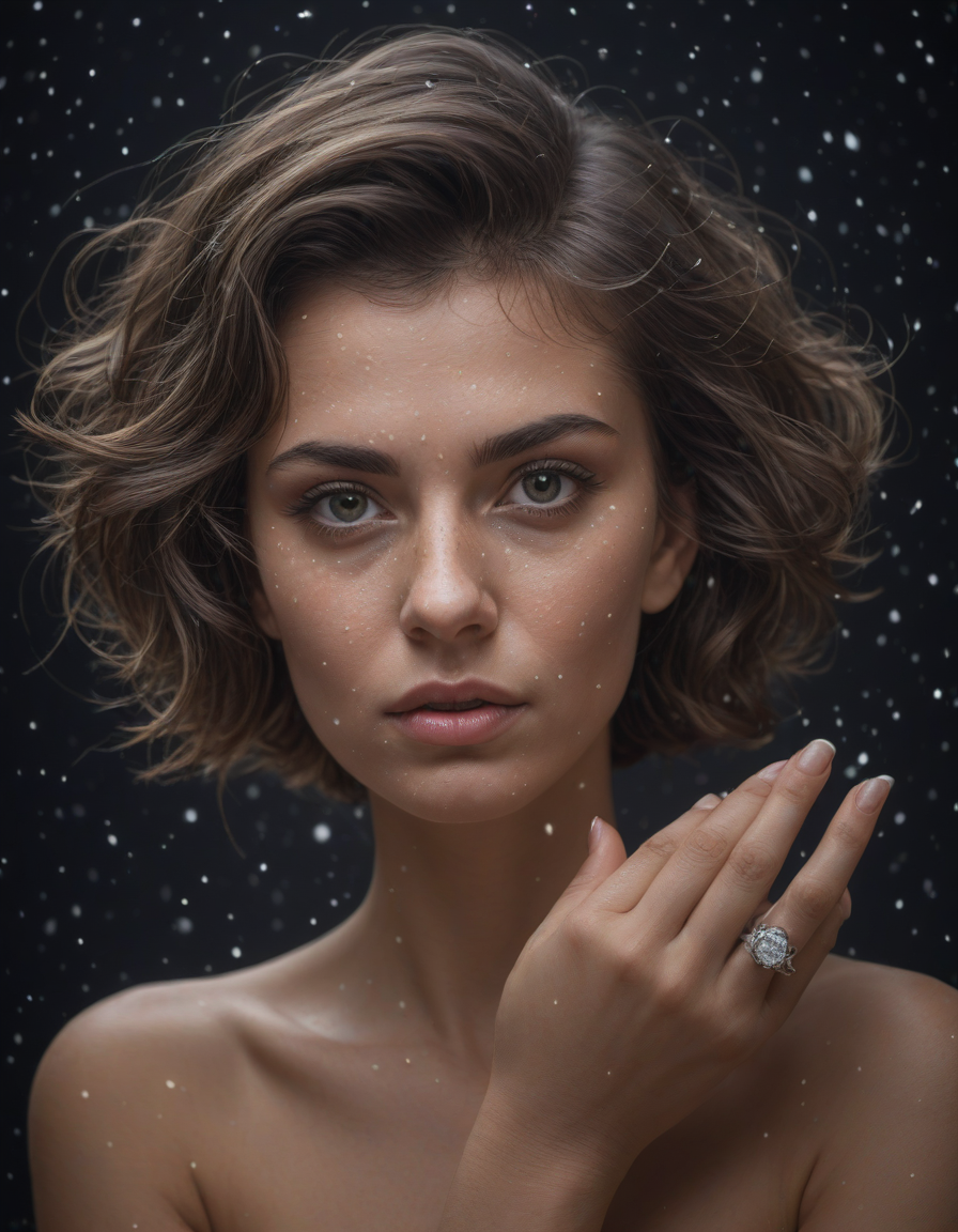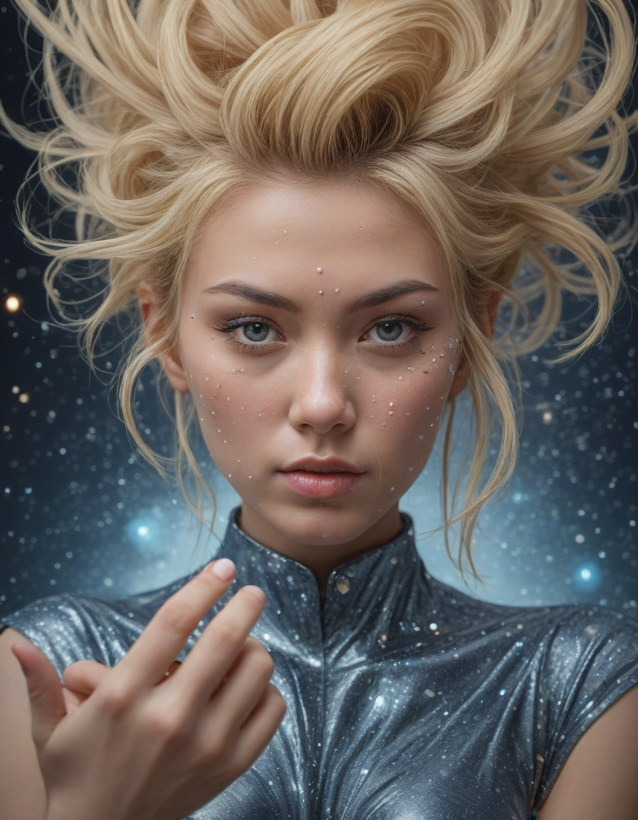 Galactic nebulas swirling, twinkling diamonds, mad, humiliated, Chin resting on palm